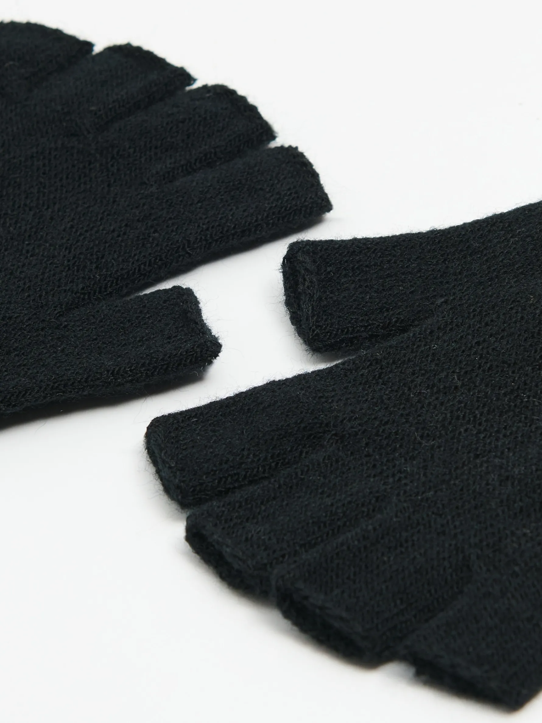 Damskie rękawiczki bez palców typu mitenki, uszyte z czarnej dzianiny. Ściągacze z prążkowanego materiału dopasowują i utrzymują item na dłoniach. Idealne na jesienny sezon!