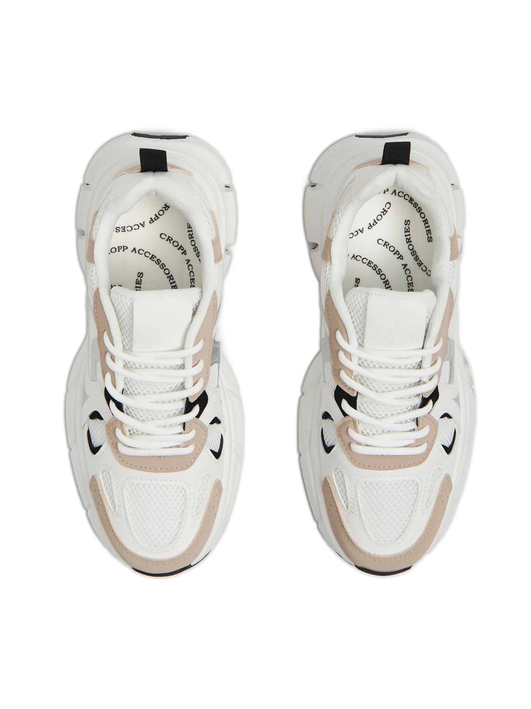 Damskie sportowe buty, wykonane m. in. z tworzywa PVC i imitacji skóry. Odpowiednie na sezon przejściowy. solidna podeszwa wiązanie na białe sznurówki wstawki z siateczki mesh ozdobne beżowe i czarne wstawki na języku wytłoczony napis