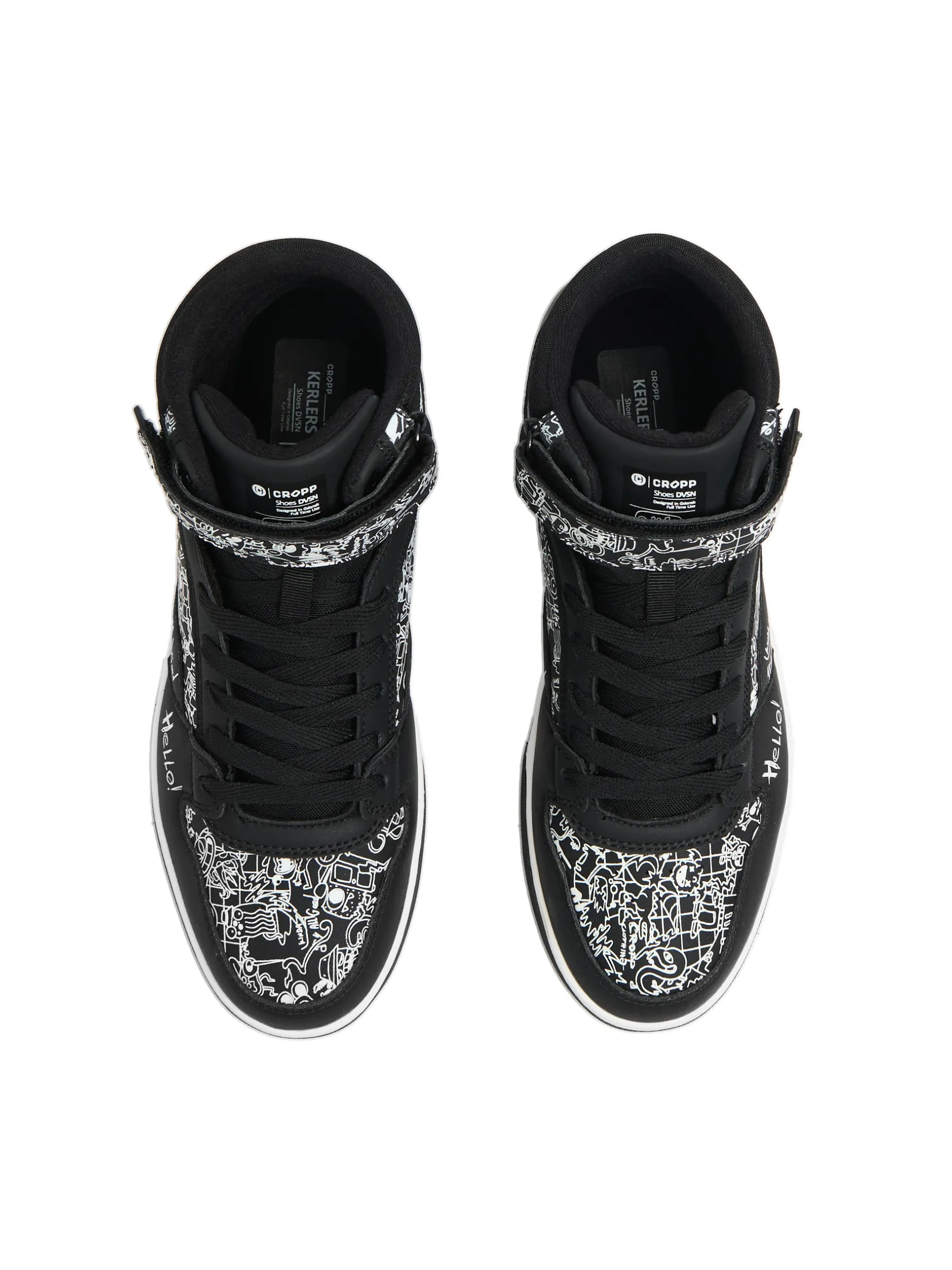 Czarne buty męskie typu sneakersy wykonane z łączonych materiałów. Wysoka cholewka z wiązaniem i dodatkowym zapięciem na rzep dobrze usztywnia kostkę. Model idealny do różnego typu aktywności podczas kapryśnej jesieni! wysokie sneakersy z elastyczną cholewką lekkie gąbkowanie wokół kostki płaska, dwukolorowa podeszwa z termoplastycznej gumy wiązane na płaskie, czarne sznurowadła sznurowanie i zapięcie na rzep wzmacniany nosek zwiększający ochronę przed zużyciem kontrastowy nadruk all over naszywka z napisem Cropp