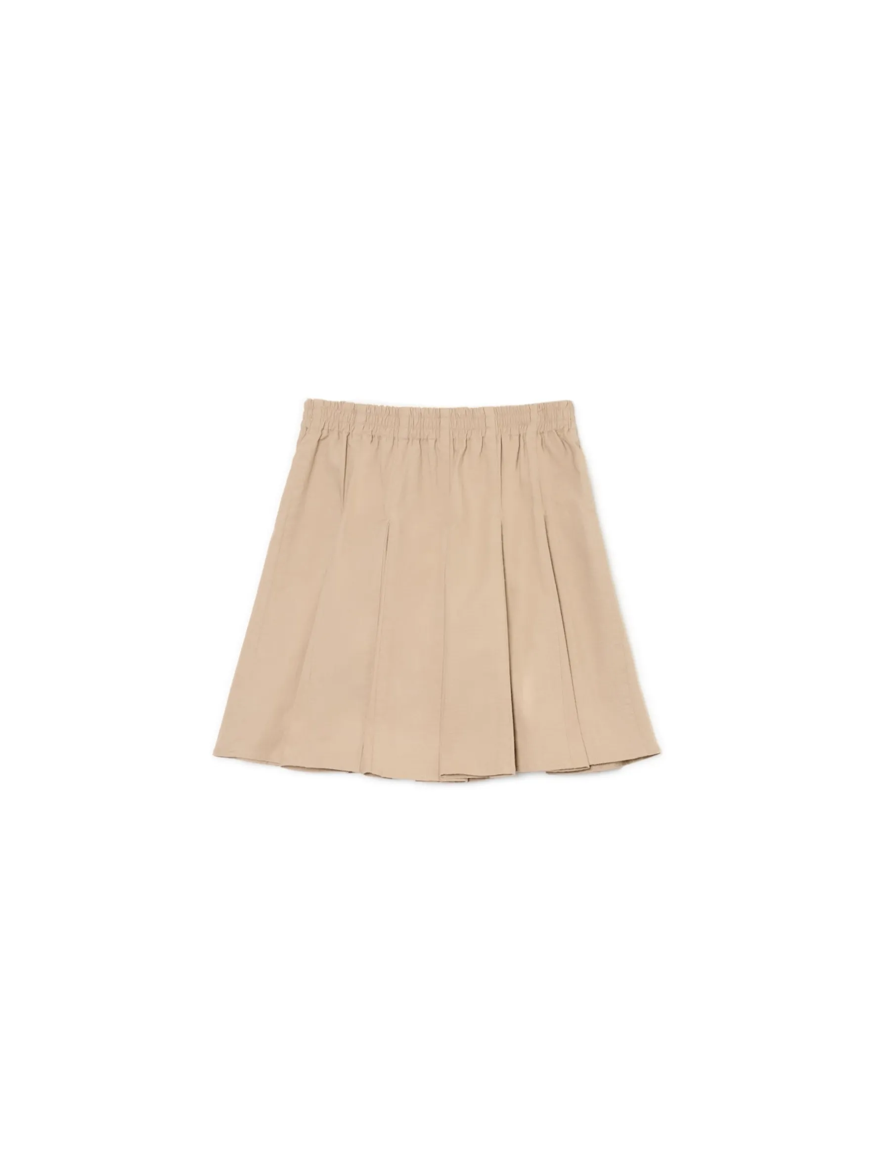 Damska spódnica o długości mini, uszyta z materiału o dużej zawartości bawełny w kolorze beżowym. Wyjątkowy model z dodatkowymi wstawkami dla zwiększenia komfortu ruchu. dzianinowy materiał z bawełną długość mini zapięcie na zamek i guzik w pasie od wewnątrz wszyta gumka
