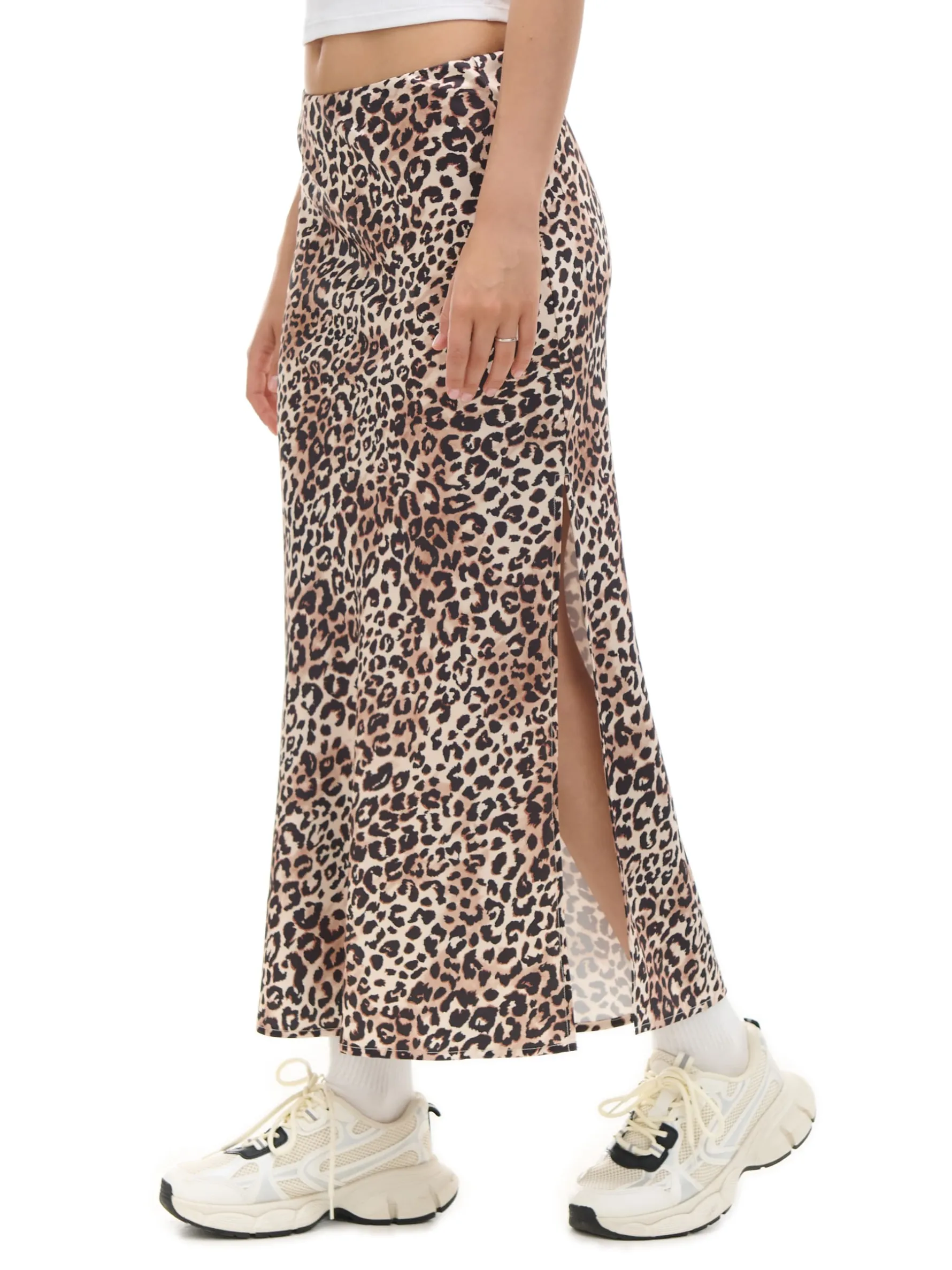 Damska spódnica o swobodnym kroju, uszyta z lekko połyskującej tkaniny ze zwierzęcym wzorem na całości. Dodatek elastycznych włókien sprawia, że pięknie układa się podczas chodzenia. tkanina z dodatkiem elastycznych włókien długość midi lekko rozkloszowany dół elastyczna gumka w pasie zwierzęcy wzór