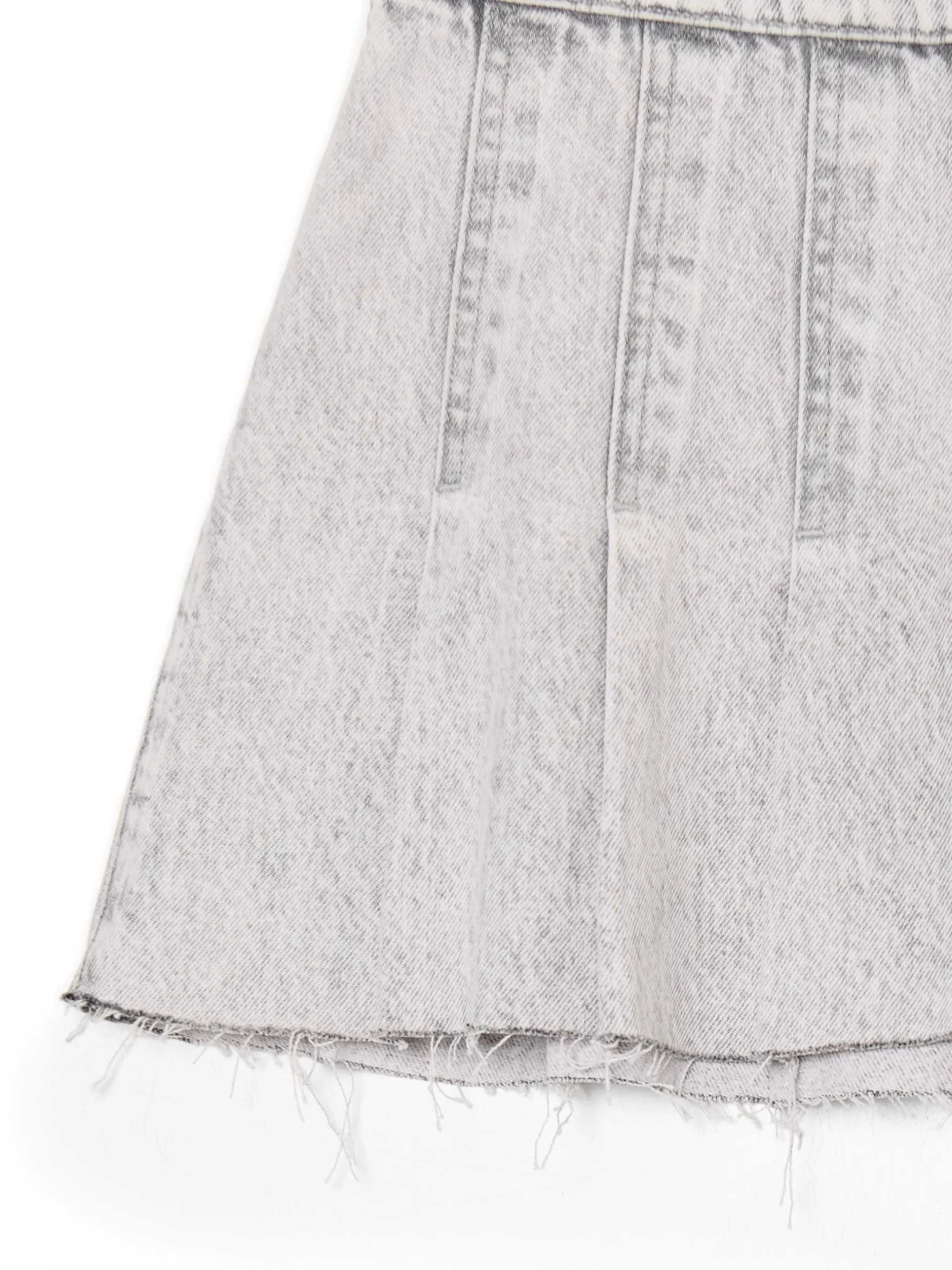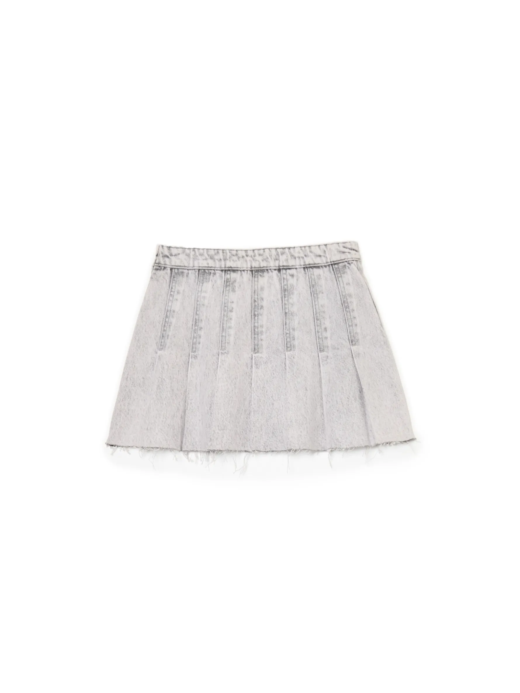 Spódnica damska o długości mini, uszyta w 100% z bawełnianej tkaniny. Ozdobne zakładki, postrzępienia i efekt sprania nadają jej streetowego vibe’u. denim o szarym odcieniu z delikatnym efektem sprania długość mini zapięcie na kryty zamek z boku plisy na całej długości ozdobne zakładki surowe wykończenie brzegów