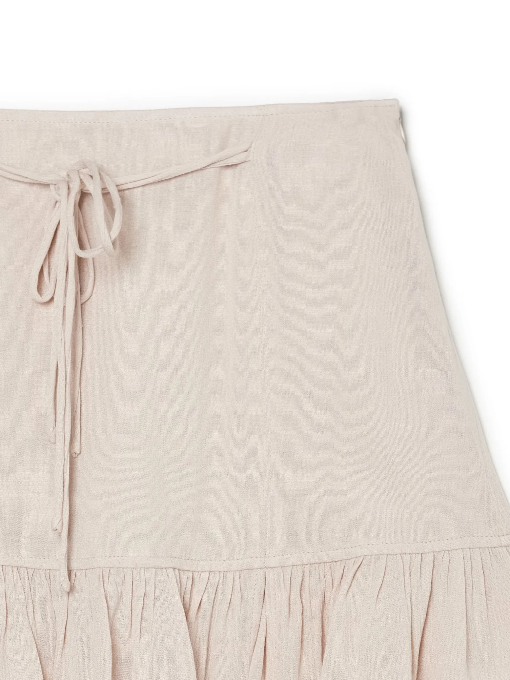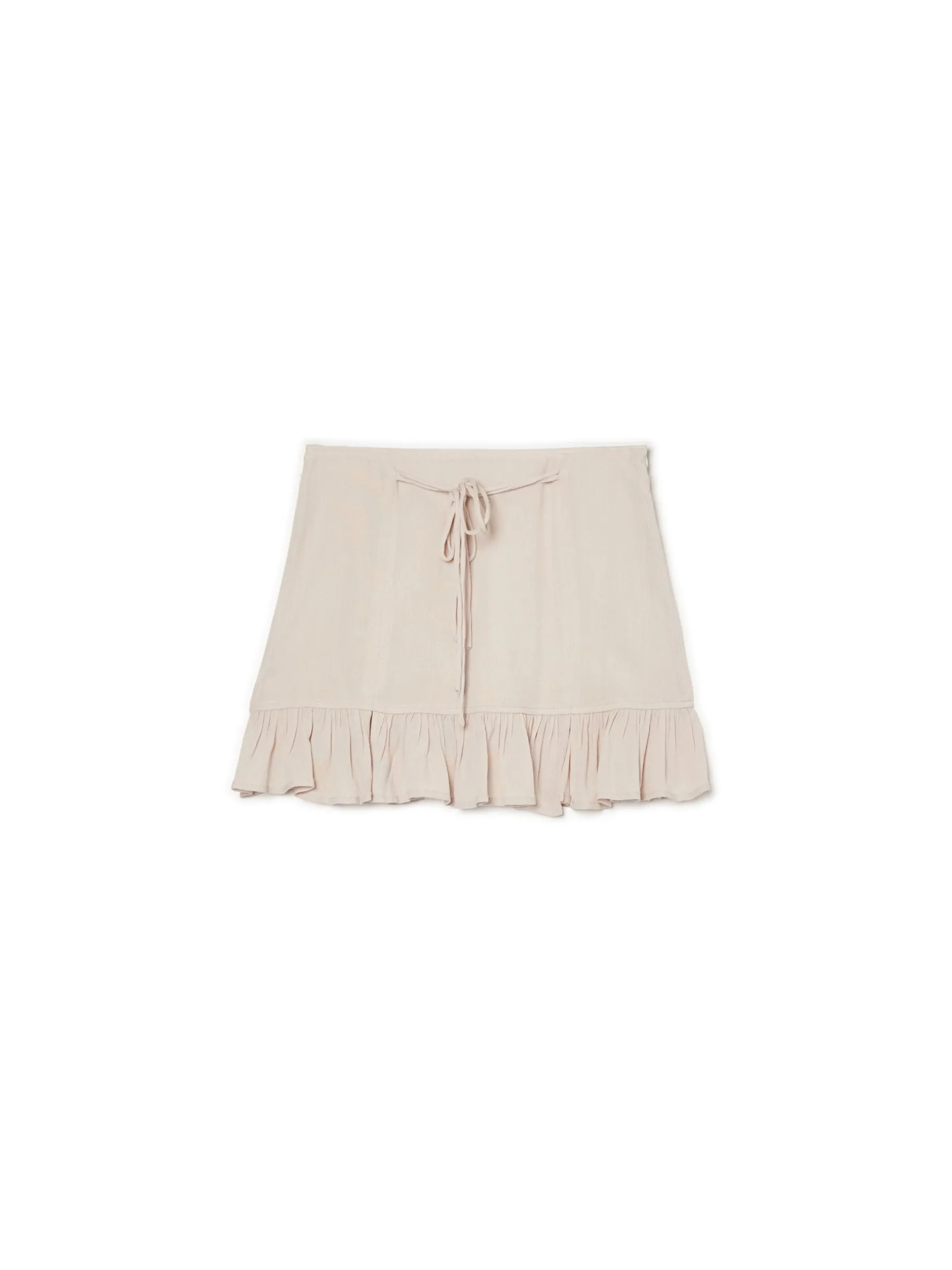 Damska spódniczka o długości mini, uszyta z tkaniny. Z przodu ozdobne wiązanie, z boku zapięcie na kryty zamek, dół wykończony falbanką. Spódnica dostępna w innej wersji kolorystycznej.