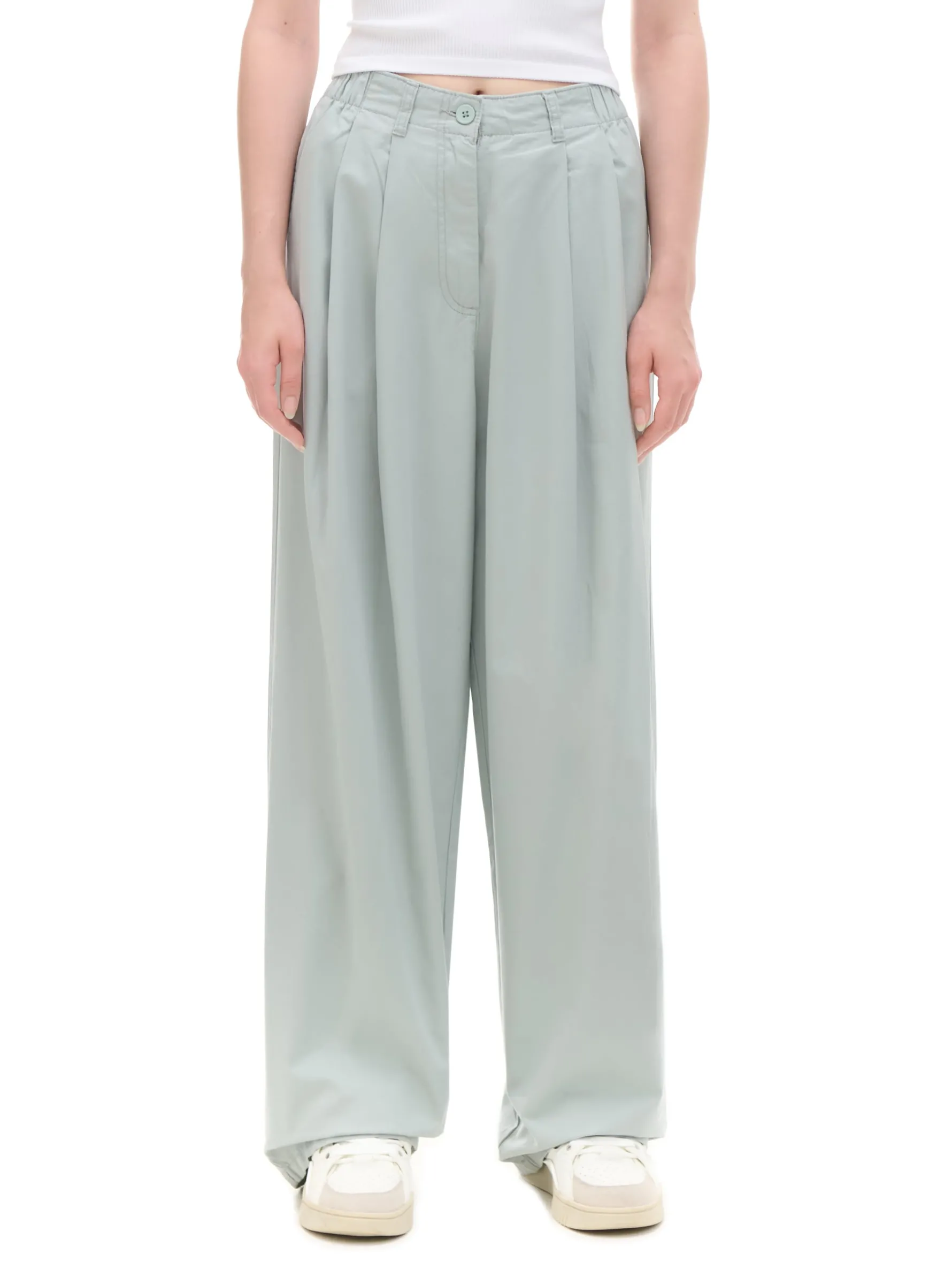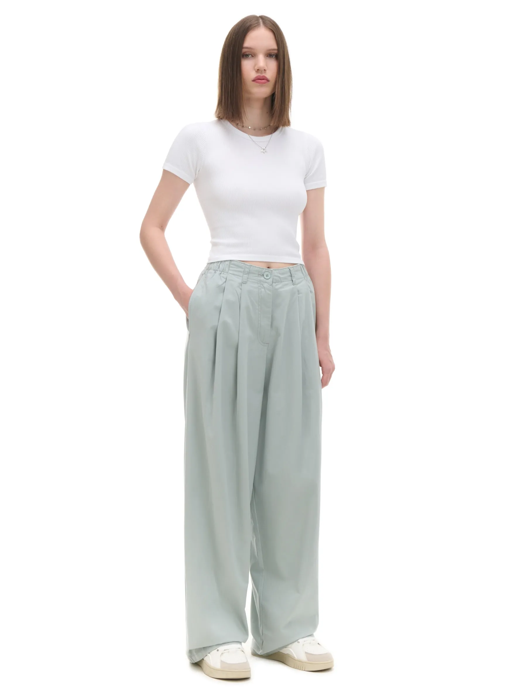 Damskie spodnie o kroju wide leg, uszyte z bawełny. Dzięki specjalnym zakładkom modelującym, ten item będzie się pięknie prezentował. 100% bawełny długie, szerokie nogawki zapięcie na zamek i guzik elastyczna gumka w pasie dwie kieszenie z przodu dwie naszyte kieszenie tylnie modelujące zakładki z przodu szlufki na pasek Wzrost modelki: 172 cm