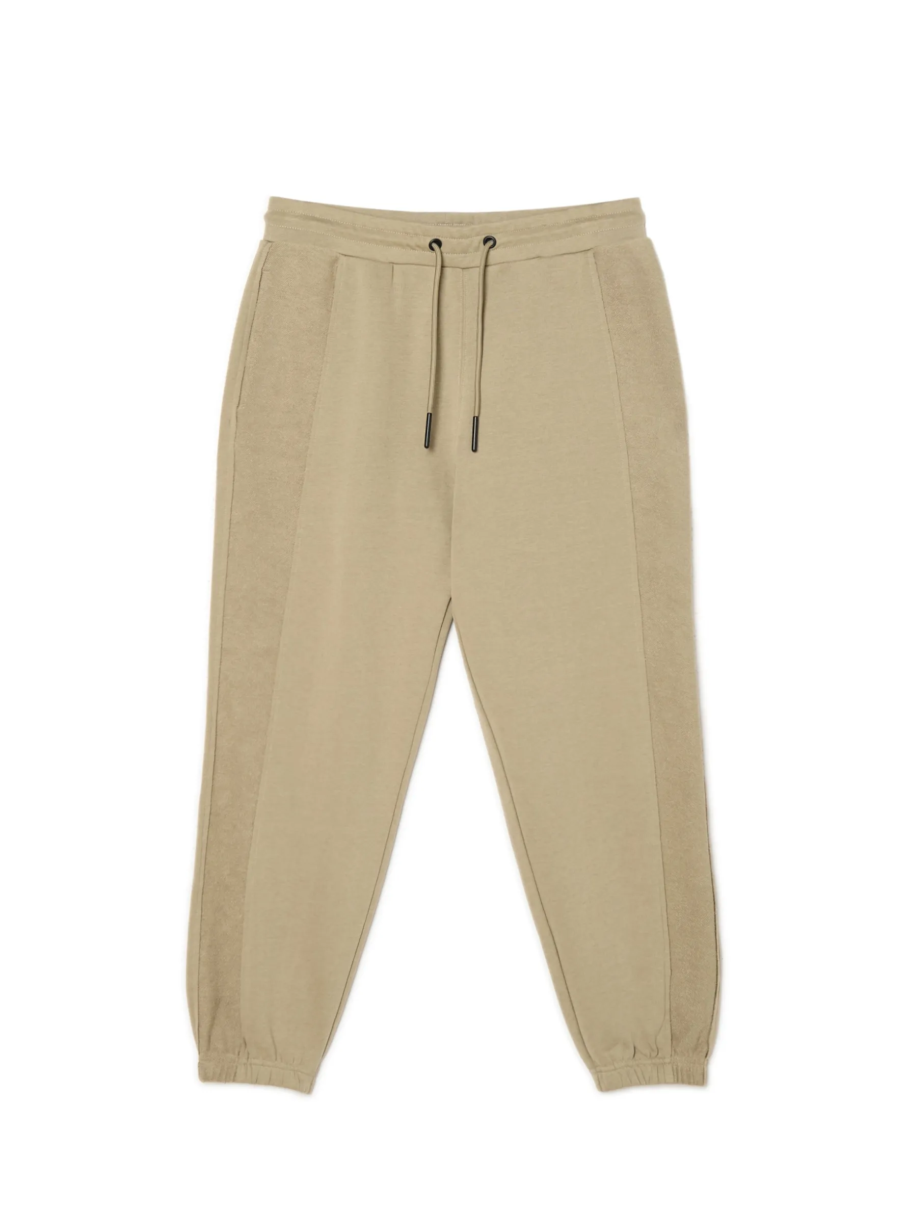 Męskie spodnie w beżowym kolorze, uszyte z mieszanki dzianin z dodatkiem bawełny french terry. W tym modelu ozdobne postrzępienia i lampasy na całej długości nogawek zwracają na siebie uwagę. dzianinowy materiał z bawełną wygodny krój comfort guma w pasie ze sznurkiem do regulacji dekoracyjne troczki z gładkiej tkaniny nogawka ze ściągaczem i lampasem dwie kieszenie z przodu naszywana kieszeń z tyłu ozdobne postrzępienia przy kieszeni