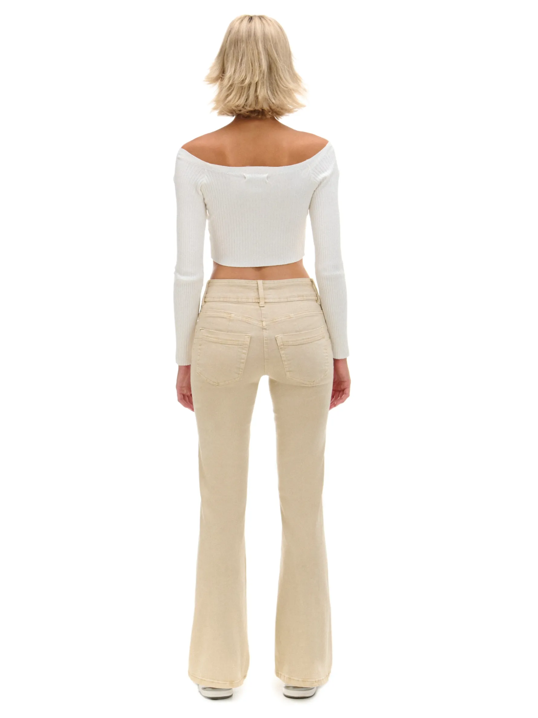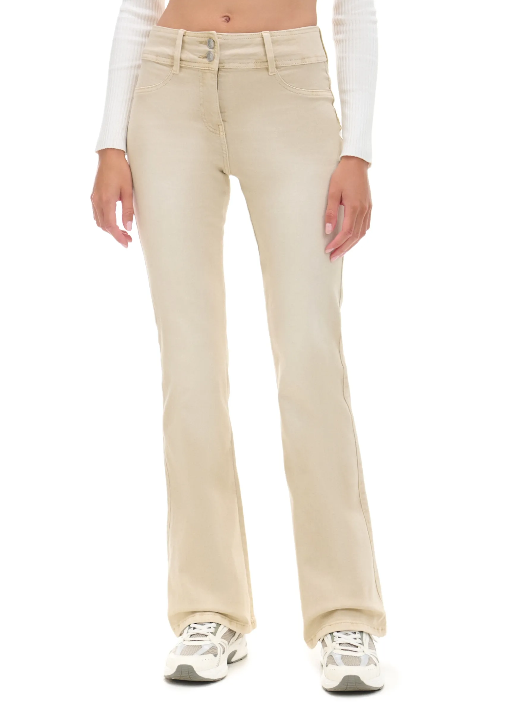 Damskie spodnie uszyte z trwałej i elastycznej tkaniny. Ciekawe zapięcie na 2 guziki i ozdobny efekt sprania na nogawkach wyróżniają ten model. bawełna z dodatkiem elastycznych włókien spodnie o kroju flare regularny stan zapięcie na dwa guziki i zamek długie nogawki rozszerzane u dołu imitacja kieszeni z przodu naszywane kieszenie z tyłu ozdobne zakładki z tyłu lekki efekt sprania na udach szerokie szlufki na pasek Wzrost modelki: 177 cm