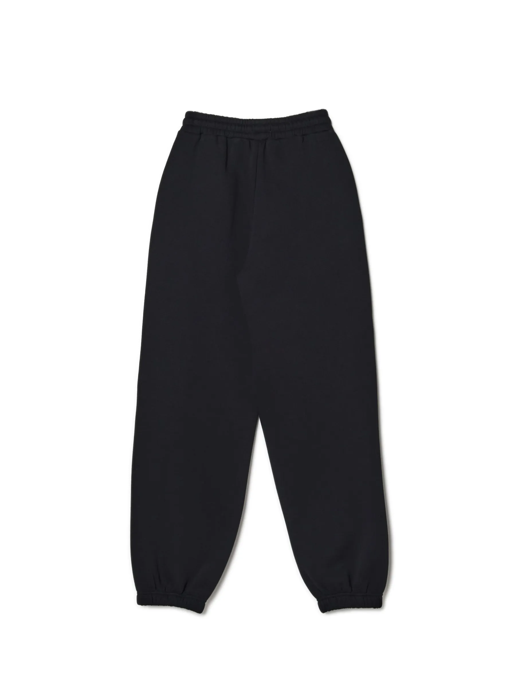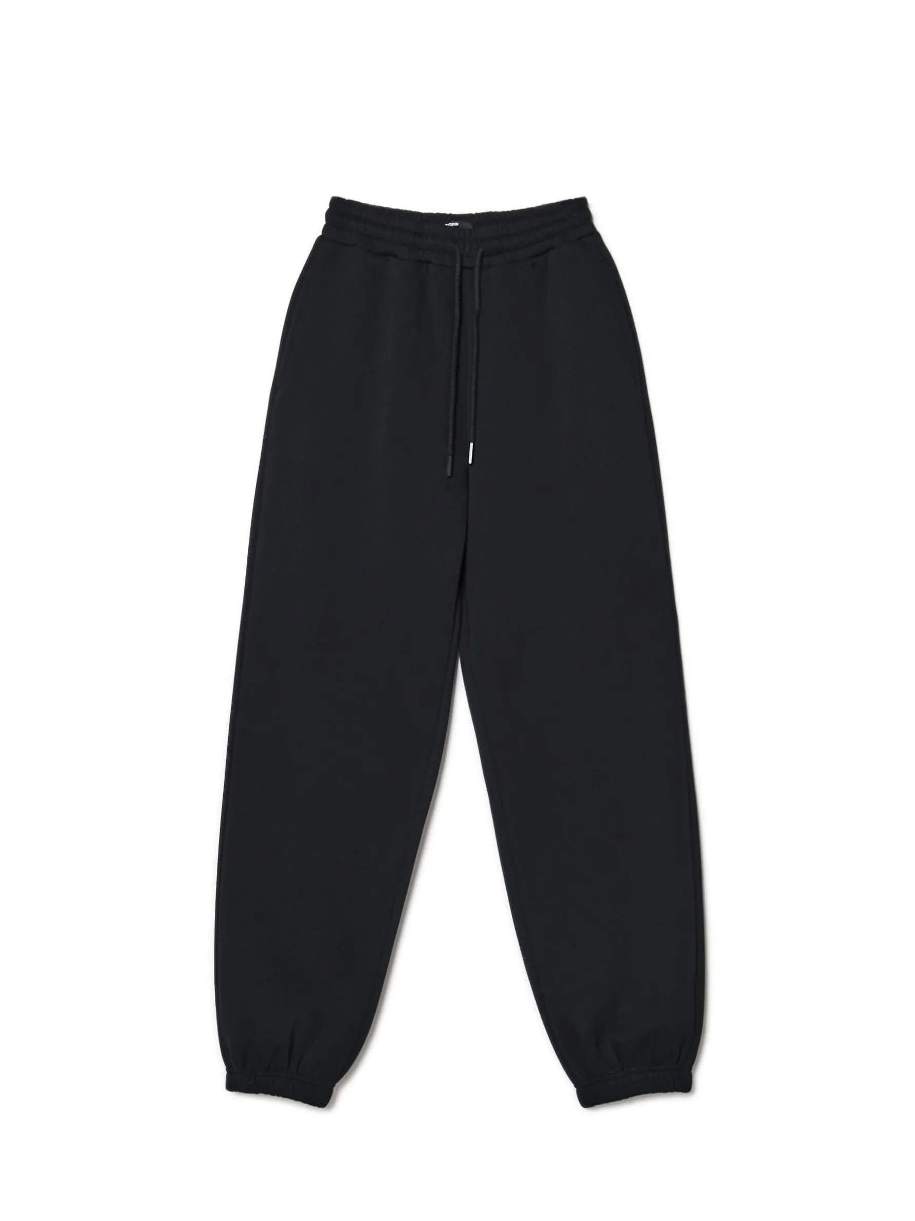 Czarne spodnie damskie typu jogger, uszyte z mieszanki dzianin z bawełną. Komfort zapewniają luźna nogawka ze ściągaczem oraz regulacja w pasie. Dostępne inne kolory. wygodne spodnie z regulacją w pasie dzianinowy materiał z bawełną elastyczna gumka w pasie długie, swobodne nogawki wykończone ściągaczem dwie kieszenie po bokach Wzrost modelki: 172 cm