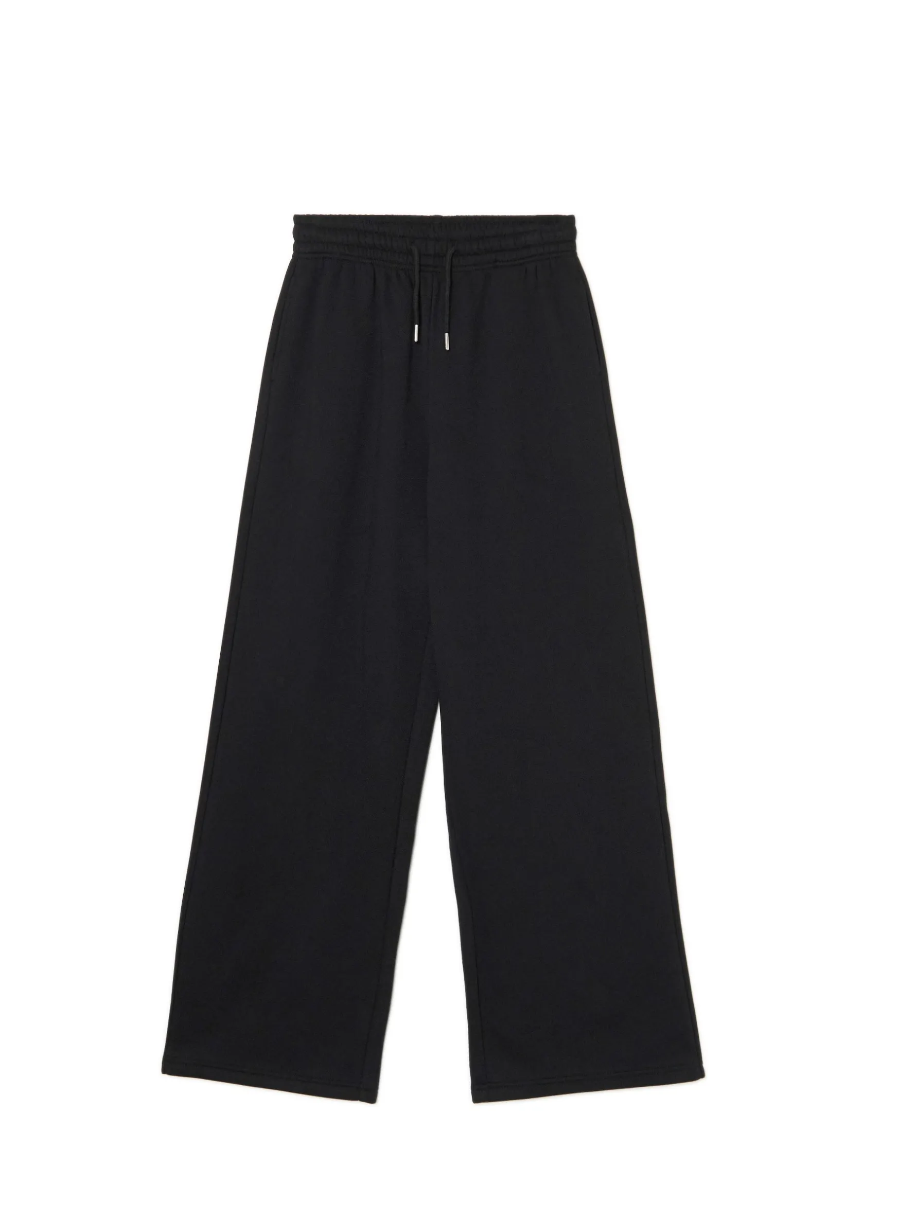 Damskie dresy wykonane z solidnego dżerseju w czarnym kolorze. Prosty krój, elastyczna guma w pasie i praktyczne kieszenie zapewniają swobodę noszenia. Idealny item na spacery z Bestie lub chillowanie na kanapie! dresowe spodnie typu basic dzianinowy materiał z bawełną guma w pasie ze sznurkiem do regulacji długie, proste nogawki dwie kieszenie po bokach naszywana kieszeń z tyłu