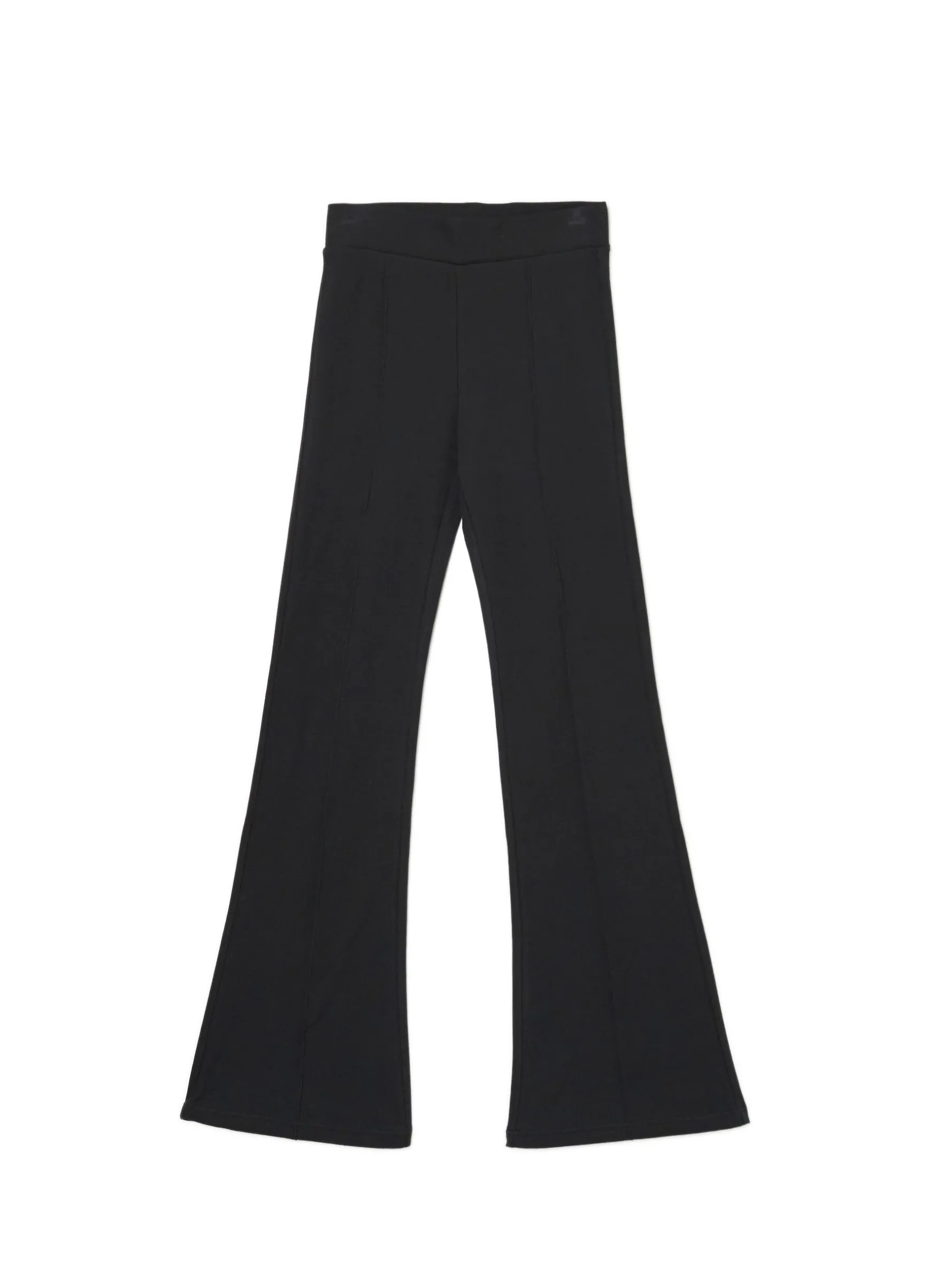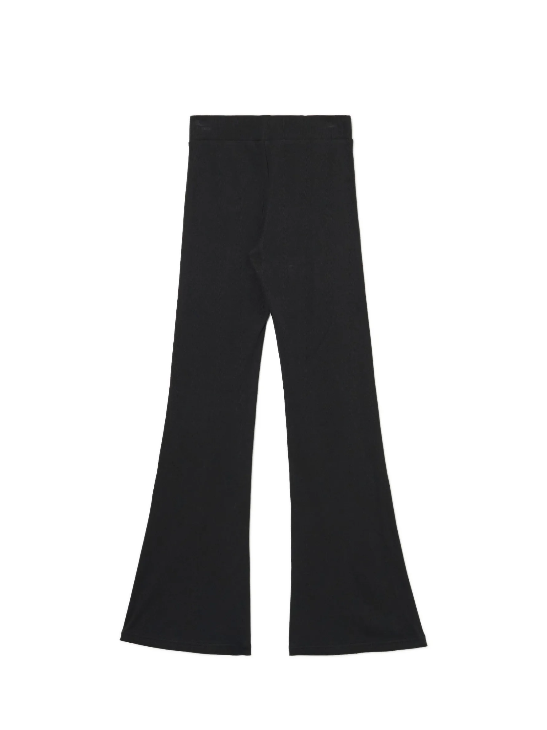 Gładkie damskie spodnie o kroju flare, idealne na aktywność fizyczną… albo chill na kanapie. wysoki stan w pasie gumka długa, rozszerzająca się nogawka
