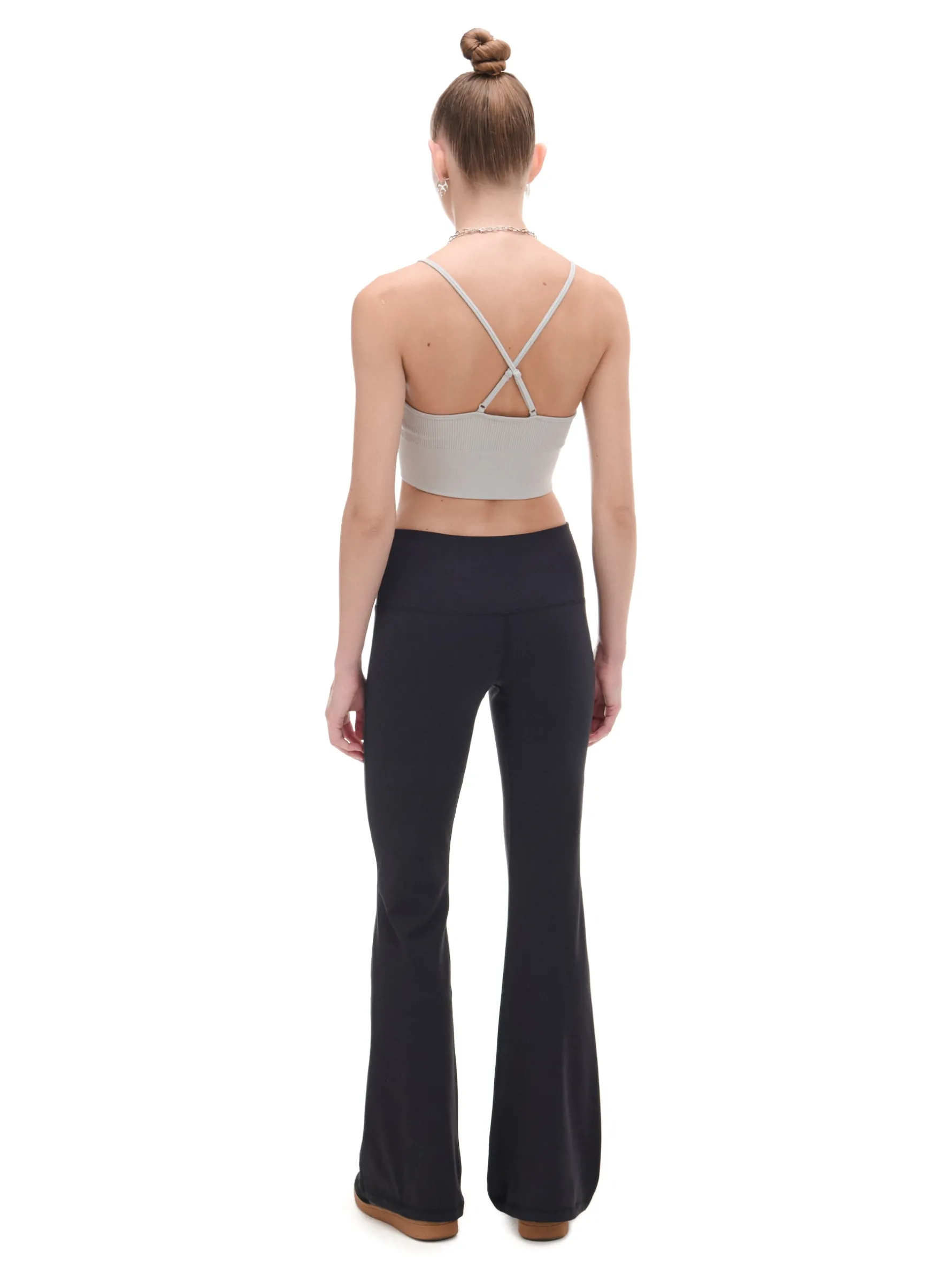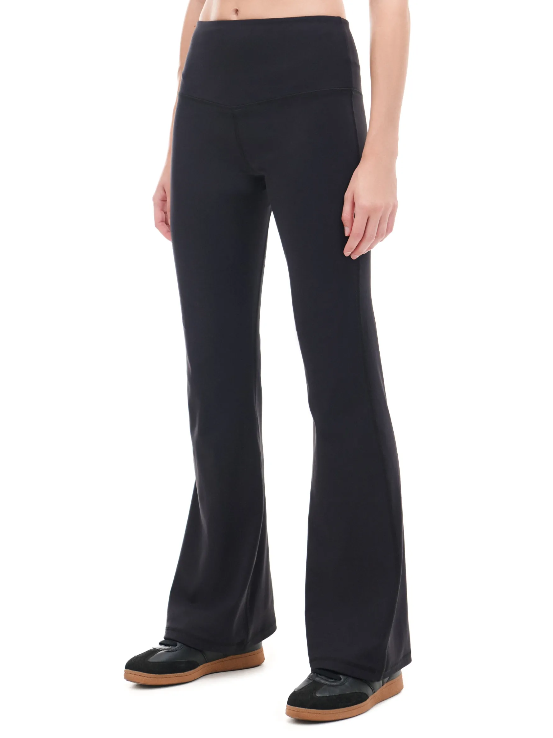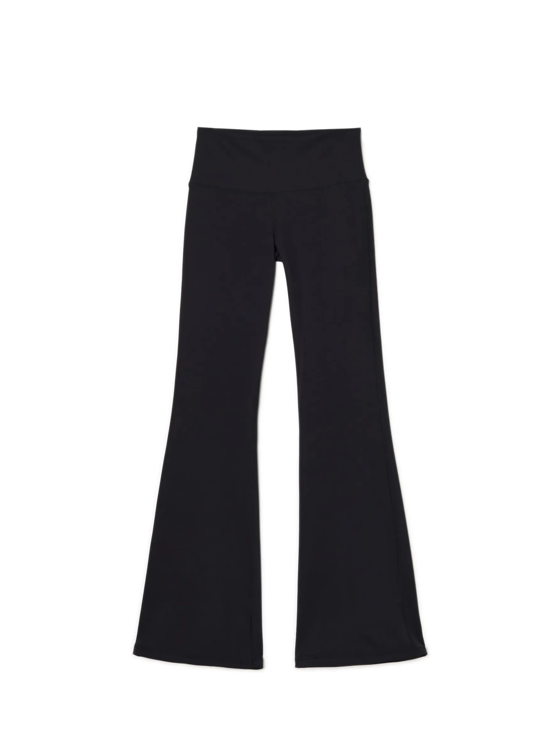 Czarne spodnie z wysokim stanem, uszyte z mieszanki dzianin z dodatkiem elastycznych włókien. Posiadają wygodne, długie nogawki rozszerzone na dole, idealne na jesień! dzianina z domieszką elastycznych włókien wysoki stan długie nogawki rozszerzane u dołu