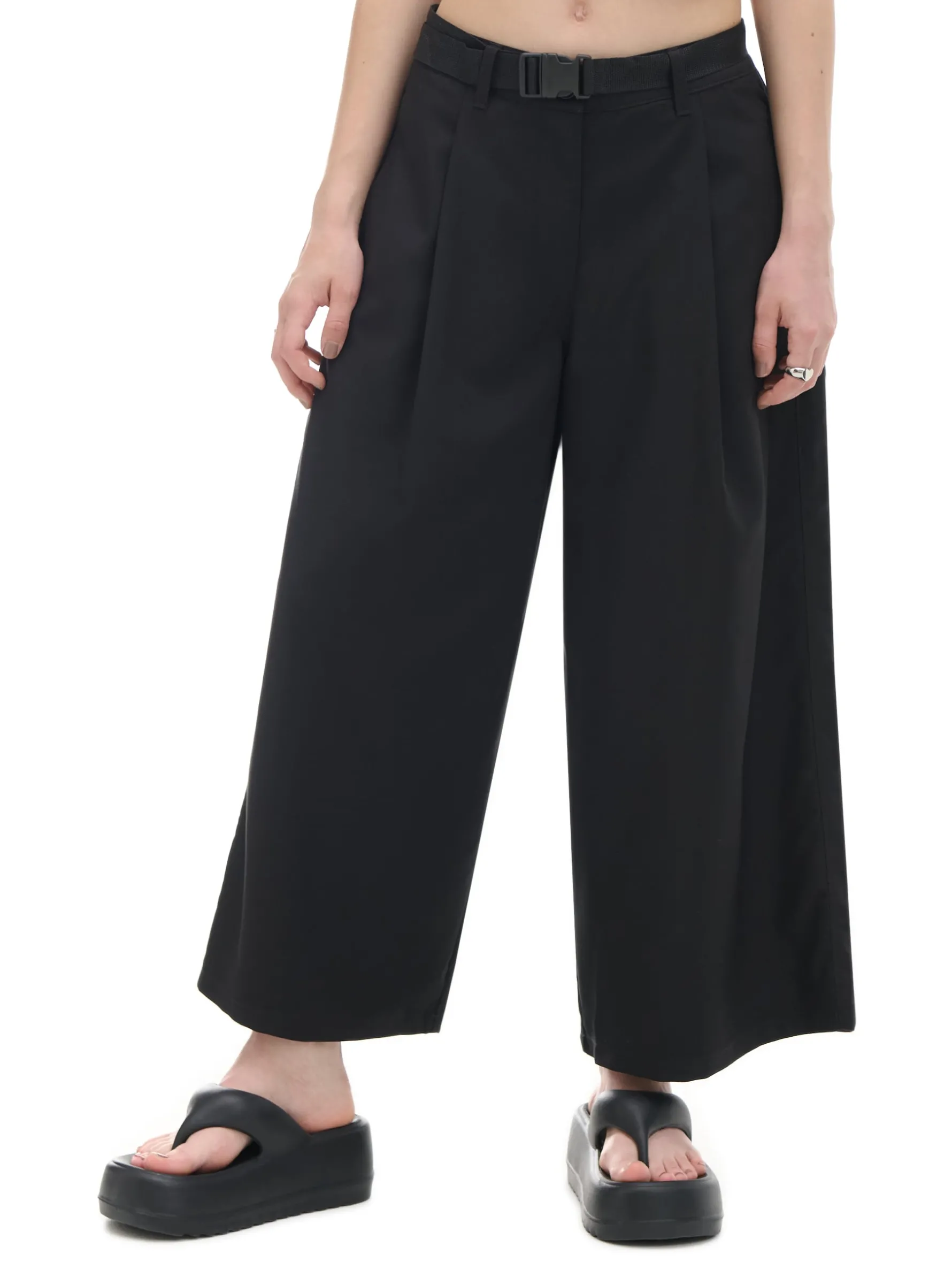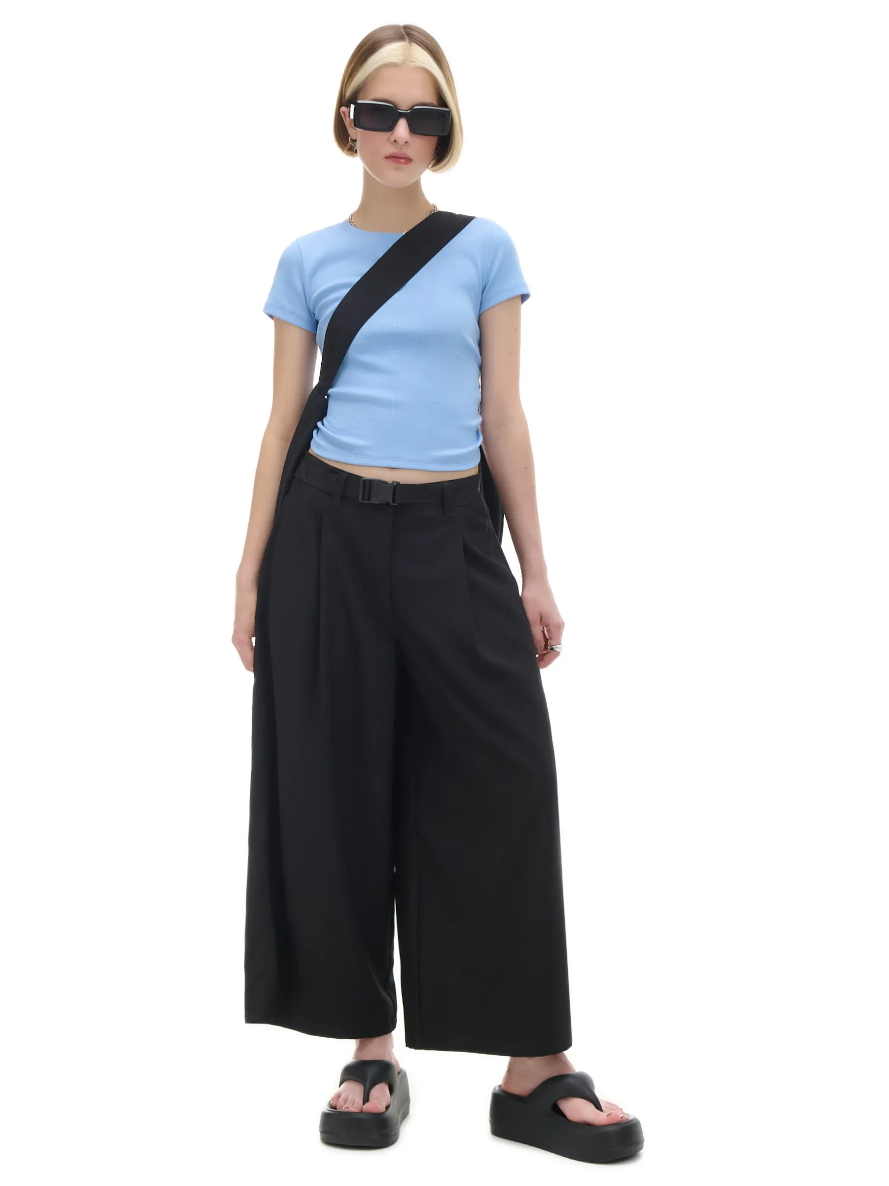 Te damskie spodnie typu kuloty uszyte z mieszanki tkanin z wiskozą w klasycznym kolorze idealnie sprawdzą się w letnie dni! lekki materiał z wiskozą swobodny, luźny krój szerokie nogawki 3/4 dwie kieszenie z przodu naszywane kieszenie z tyłu w talii materiałowy pasek z zapięciem
