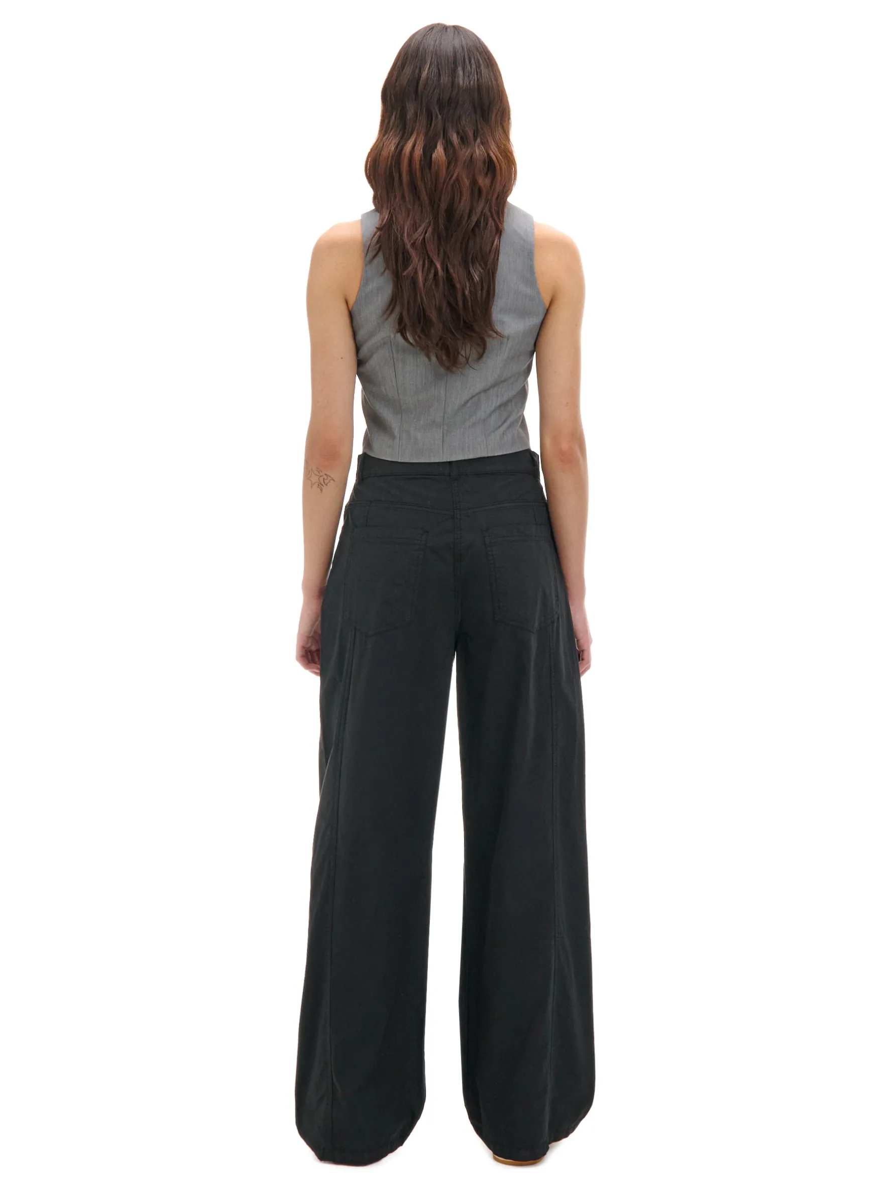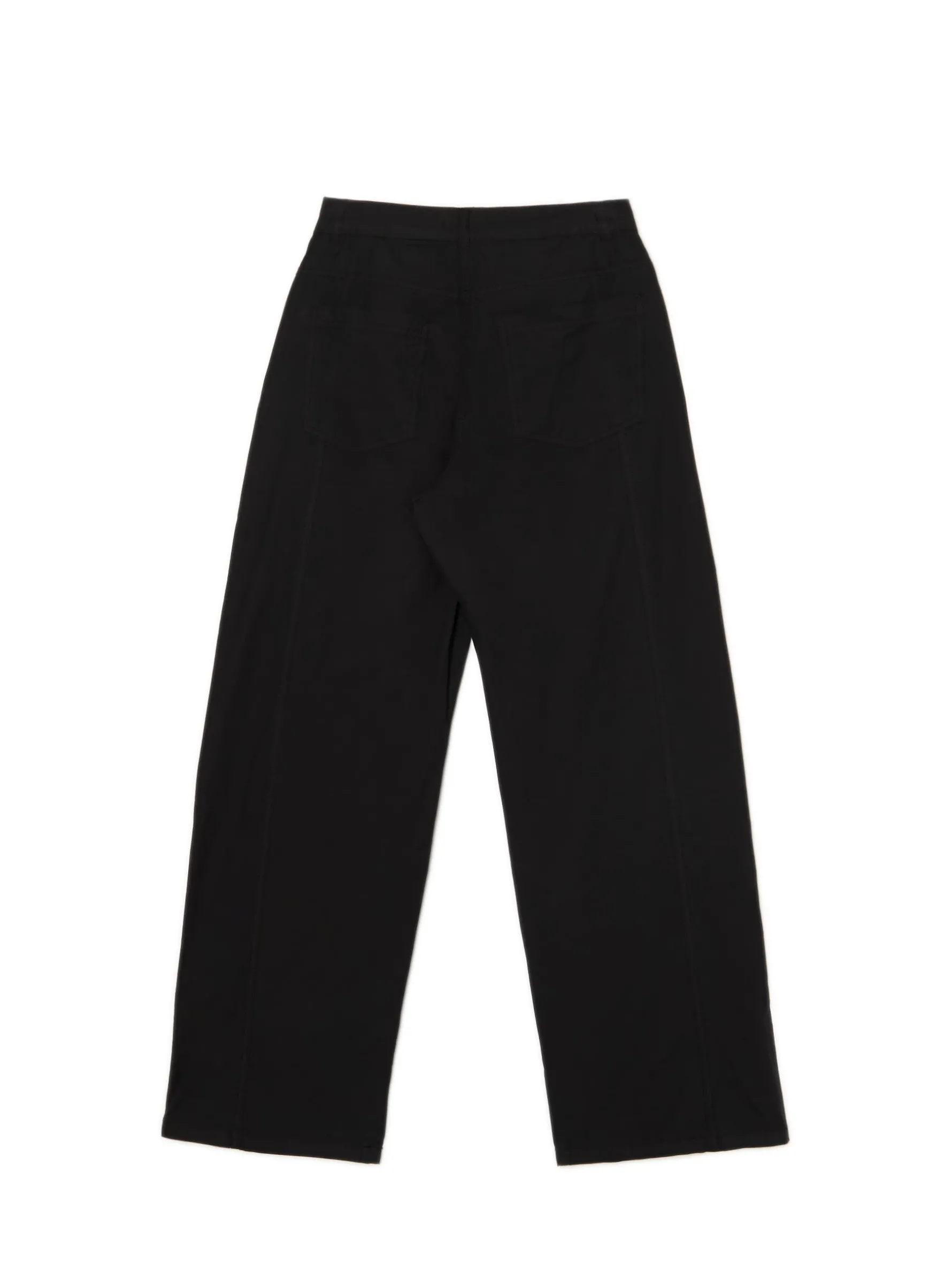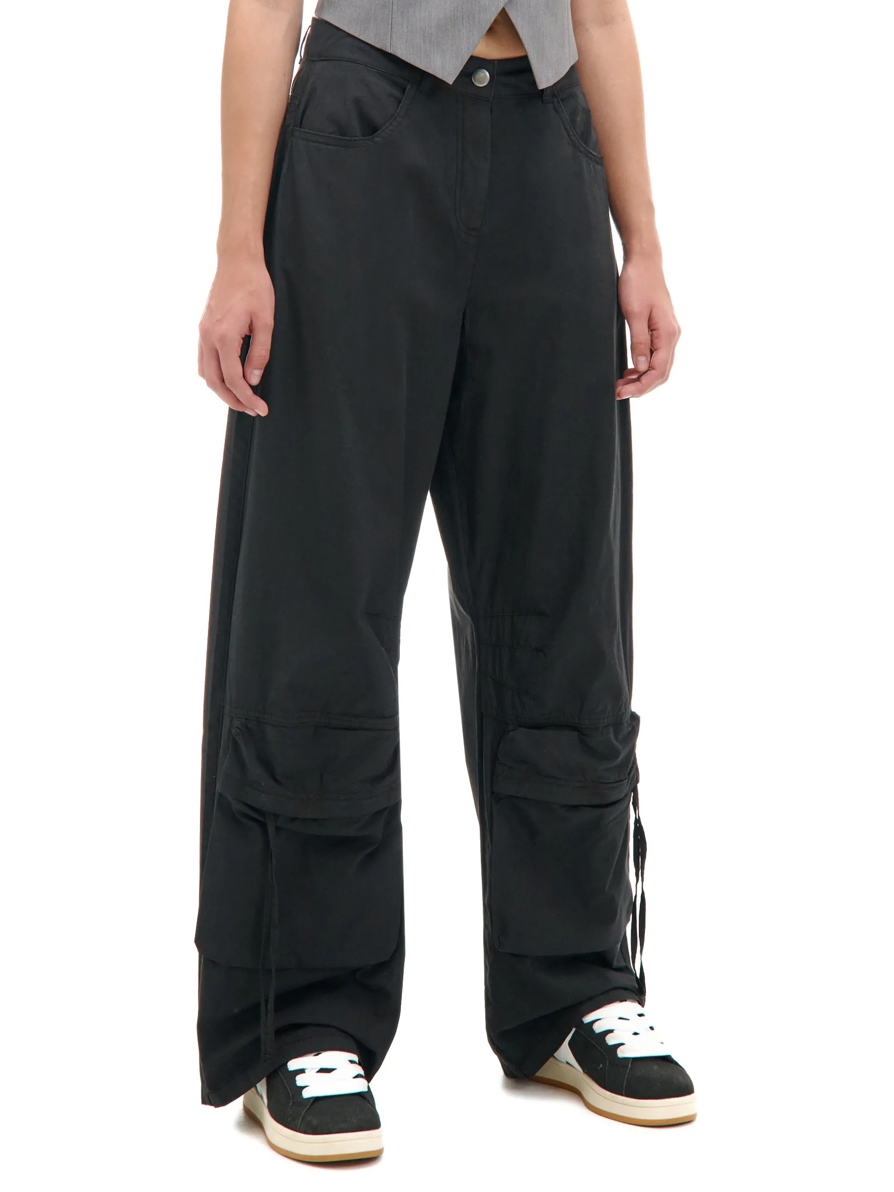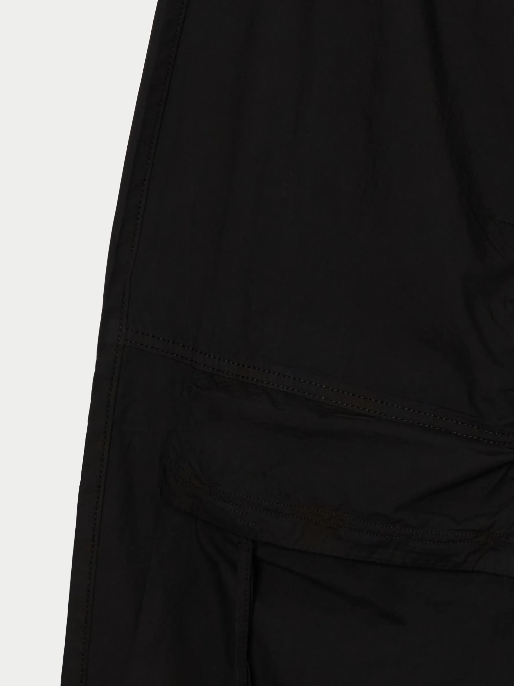Czarne męskie spodnie o luźnym kroju, uszyte z mocnej, bawełnianej tkaniny. 100% bawełny swobodny, luźny krój zapięcie na zamek i guzik długie, swobodne nogawki dwie kieszenie po bokach naszywane kieszenie z tyłu dodatkowe kieszenie cargo na nogawkach szlufki na pasek modelujące zakładki z przodu efekt sprania na całości