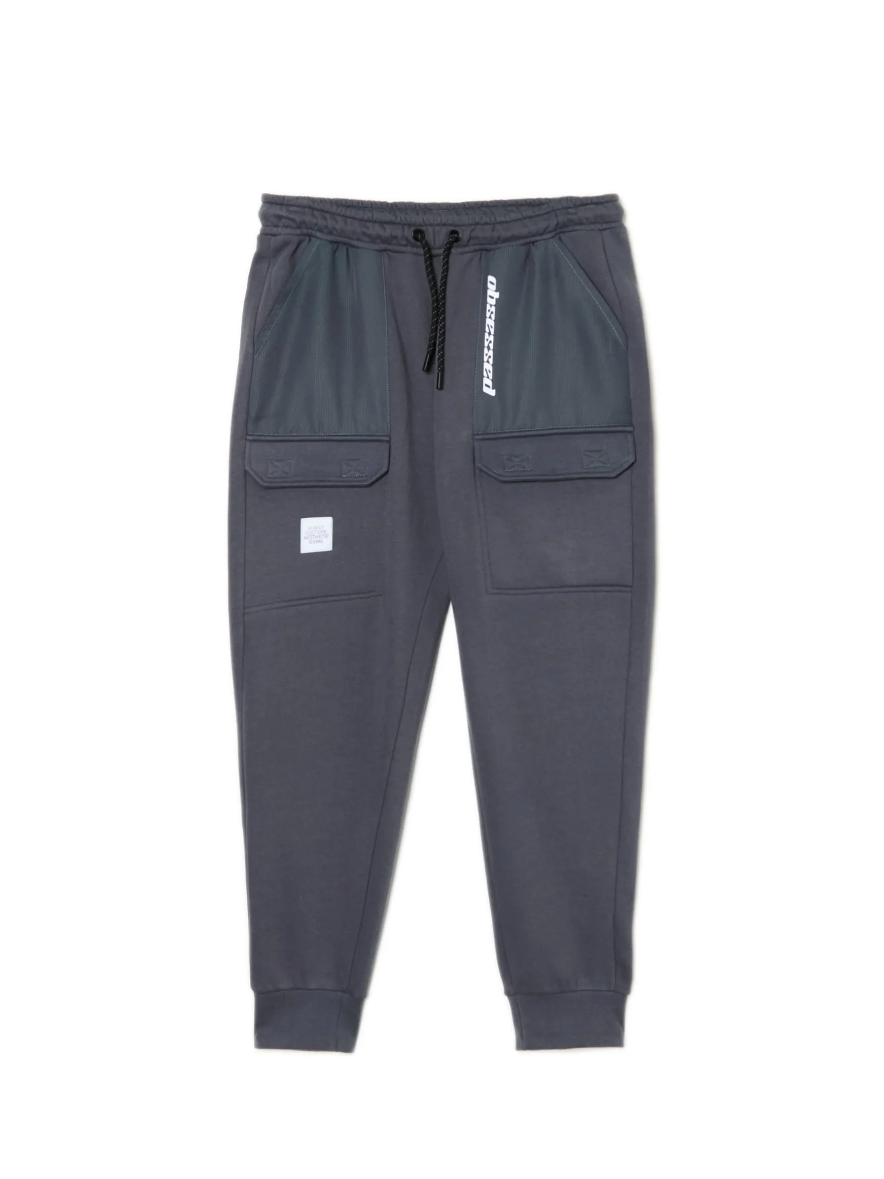 Dresowe spodnie męskie typu jogger, uszyte z mieszanki dzianin z bawełną. w pasie gumka i sznurek do regulacji liczne kieszenie, w tym kieszenie typu cargo nogawka ze ściągaczem i printem z efektem odblaskowym joggery dostępne w innym kolorze