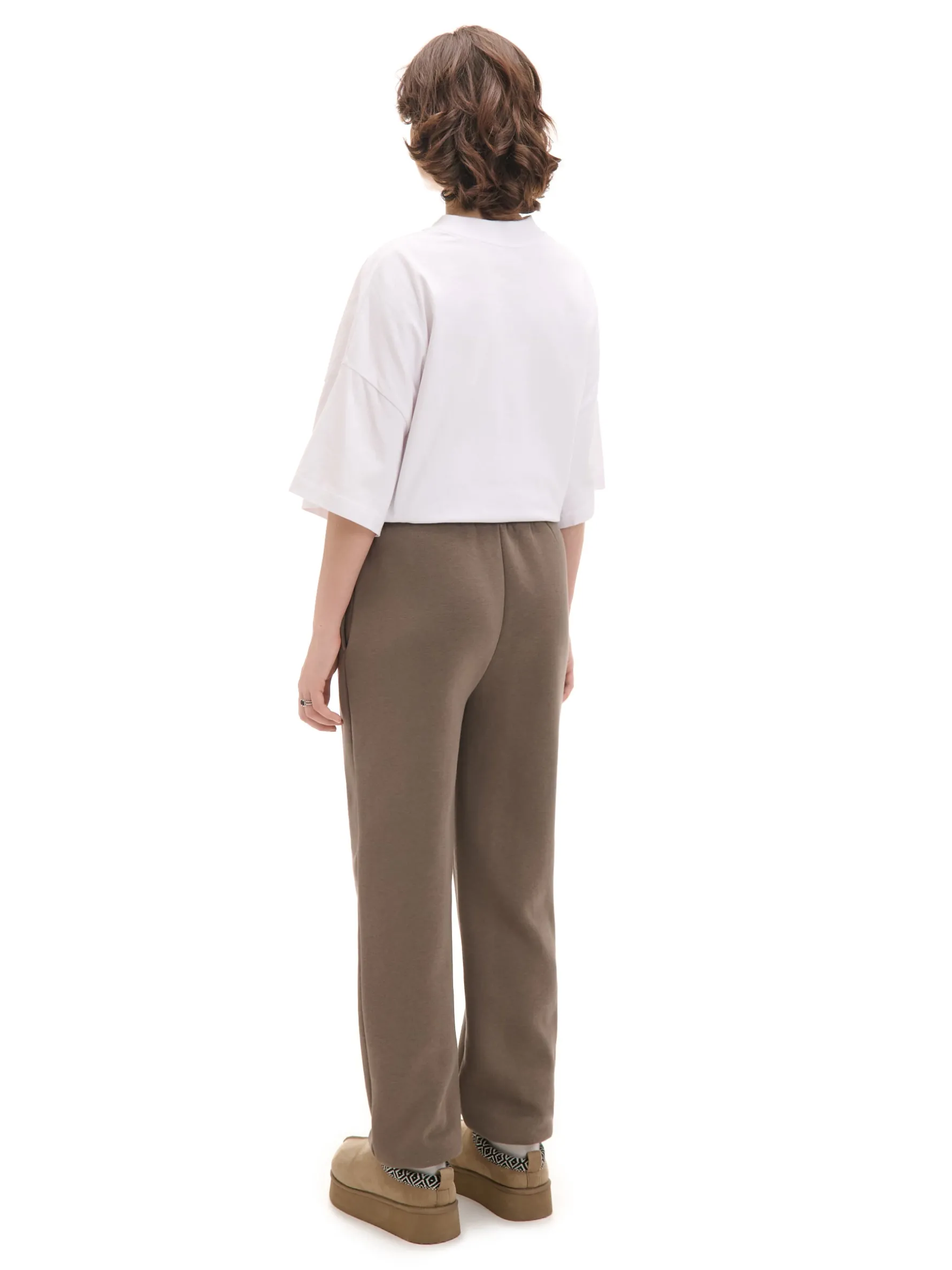 Damskie spodnie dresowe uszyte z gładkiej mieszanki dzianin. Ściągacze w pasie i przy nogawkach zapewniają dopasowanie i nie krępują ruchów podczas codziennych aktywności. spodnie typu jogger uszyte z miękkiej dzianiny z bawełną regularny stan elastyczna gumka w pasie długie nogawki wykończone ściągaczem otwarte kieszenie po bokach brzegi zakończone prążowanym materiałem niewielki haft z przodu