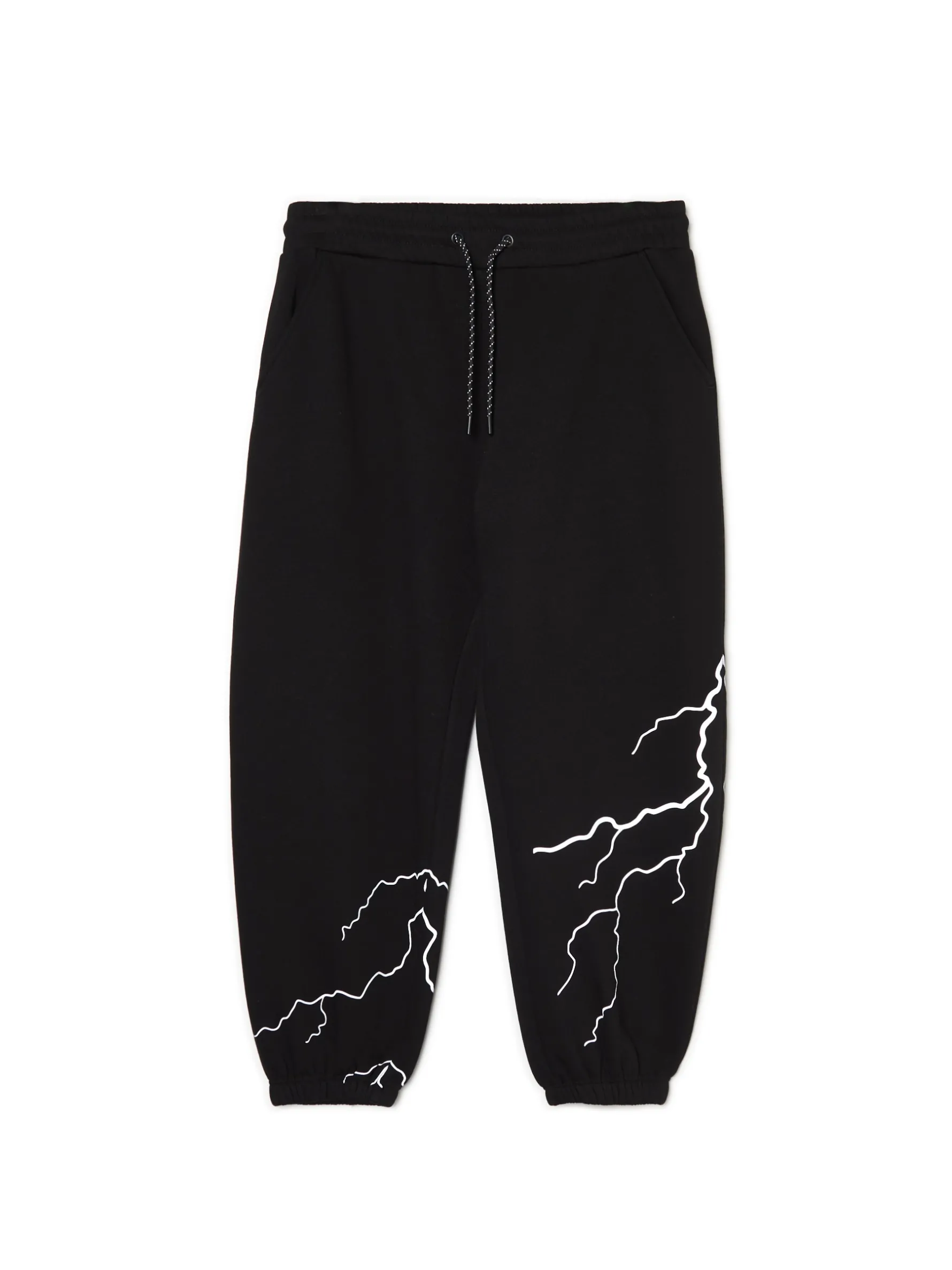 Czarne dresowe spodnie męskie typu jogger, uszyte z mieszanki dzianin zawierającej bawełnę. krój comfort w pasie gumka i sznurek do regulacji 3 kieszenie nogawka ze ściągaczem i printem z efektem reflective