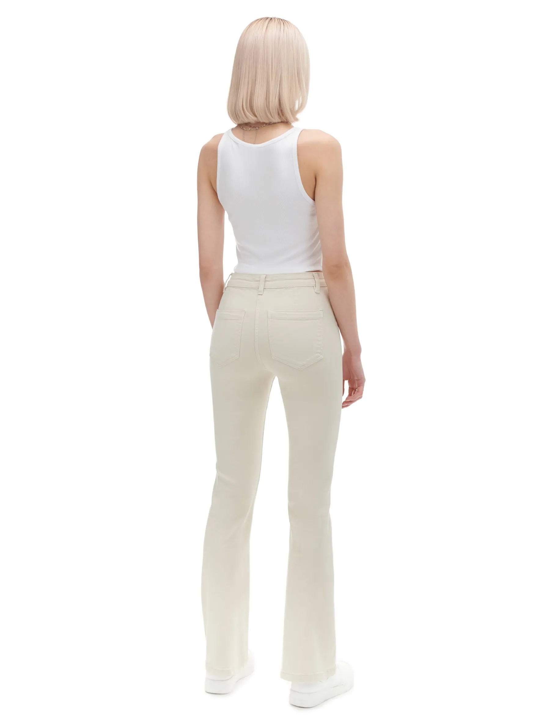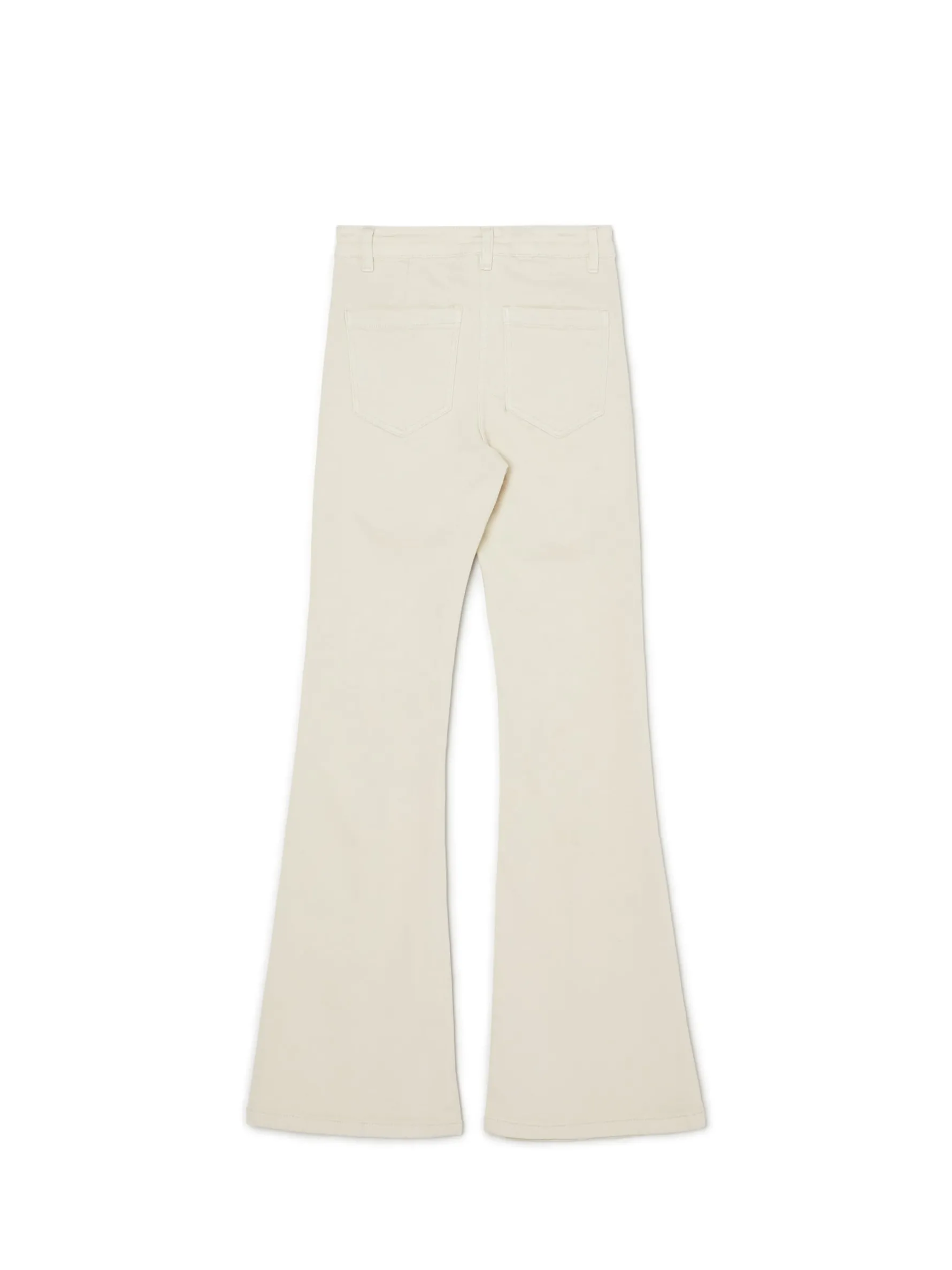 Kremowe damskie spodnie o kroju dzwonów, uszyte z bawełny z dodatkiem elastycznych włókien. regularny stan zapięcie na zamek i zatrzask dwie kieszenie z tyłu nogawka rozszerzająca od kolana w dół szlufki na pasek ozdobny szew z przodu Wzrost modelki: 177 cm Wzrost modelki: 170 cm
