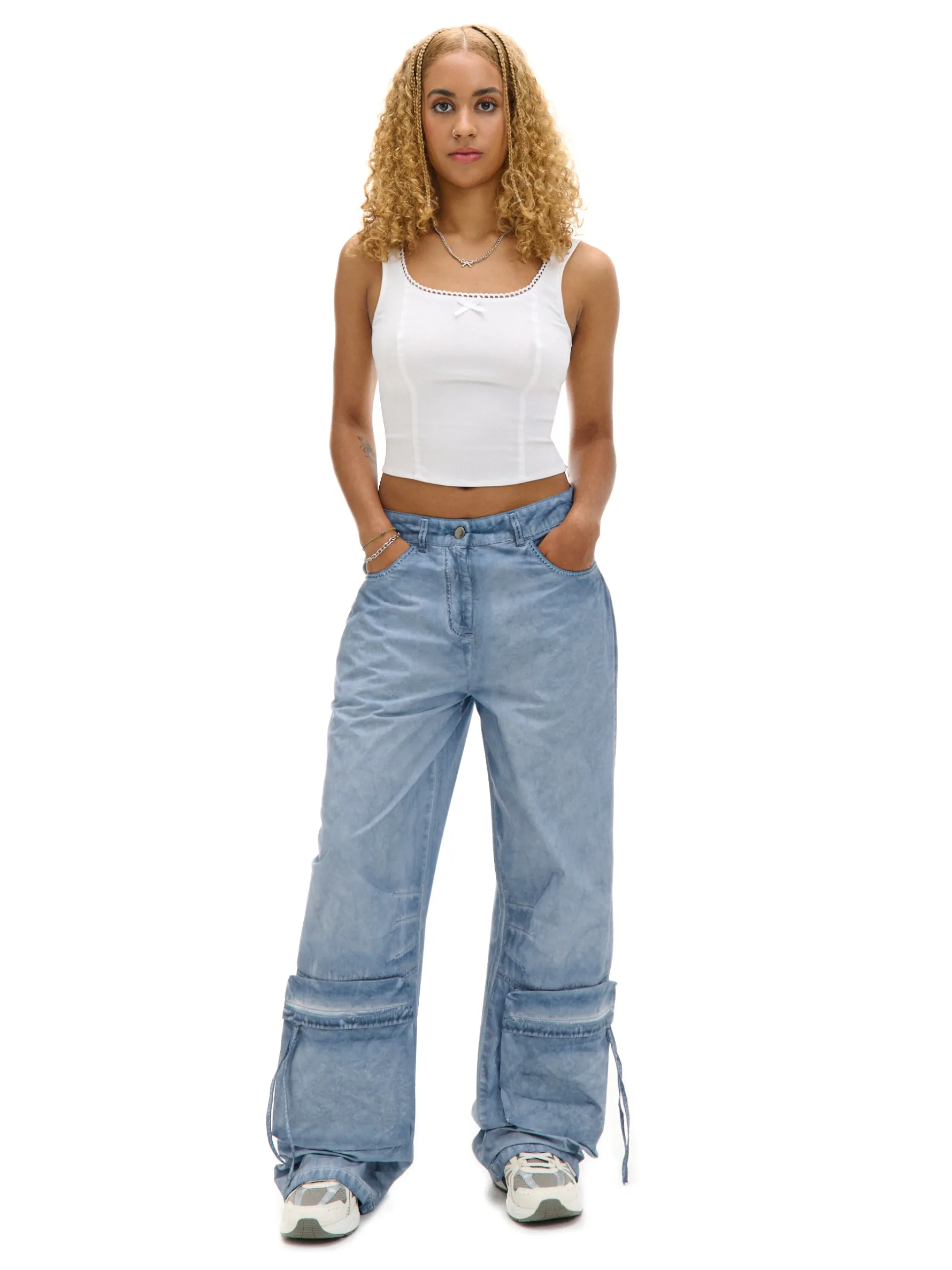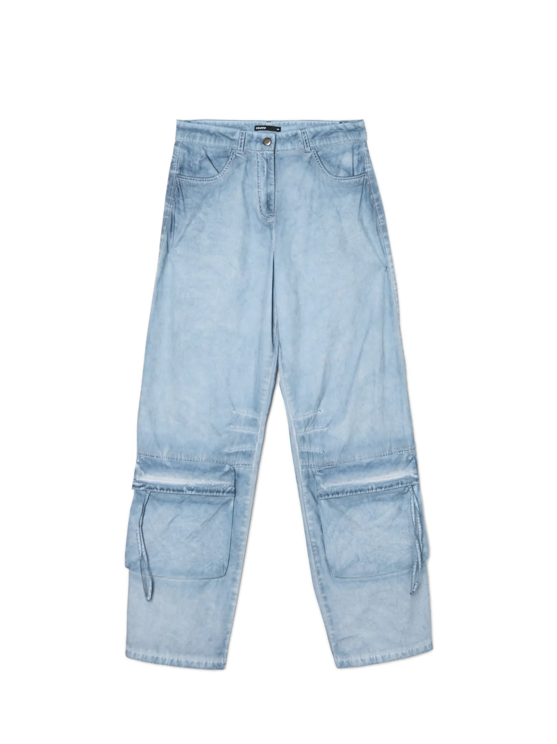 Niebieskie męskie spodnie o luźnym kroju, uszyte z mocnej, bawełnianej tkaniny. 100% bawełny swobodny, luźny krój zapięcie na zamek i guzik długie, swobodne nogawki dwie kieszenie po bokach naszywane kieszenie z tyłu dodatkowe kieszenie cargo na nogawkach szlufki na pasek modelujące zakładki z przodu efekt sprania na całości