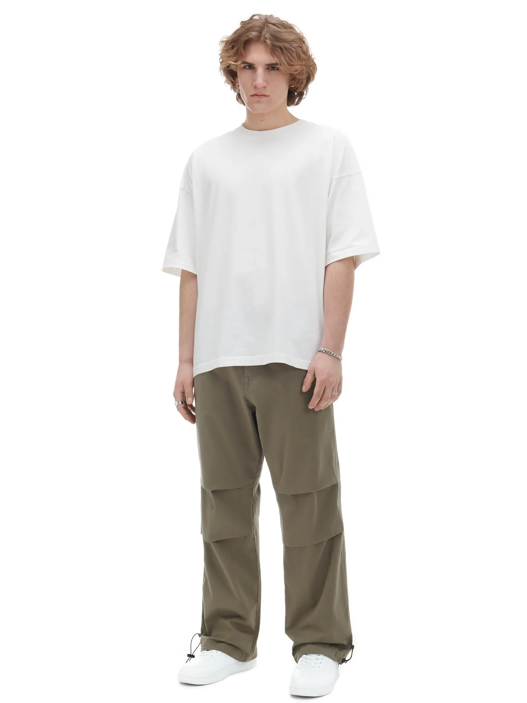 Zielone męskie spodnie o luźnym fasonie parachute, uszyte z lekkiej bawełnianej tkaniny. regularny stan rozporek z suwakiem wbudowany pasek zapinany na plastikową klamrę luźna nogawka zakończona regulacją za pomocą elastycznej gumki ze stoperem trzy kieszenie, w tym jedna z tyłu, zapinana na zatrzask Wzrost modela: 184 cm