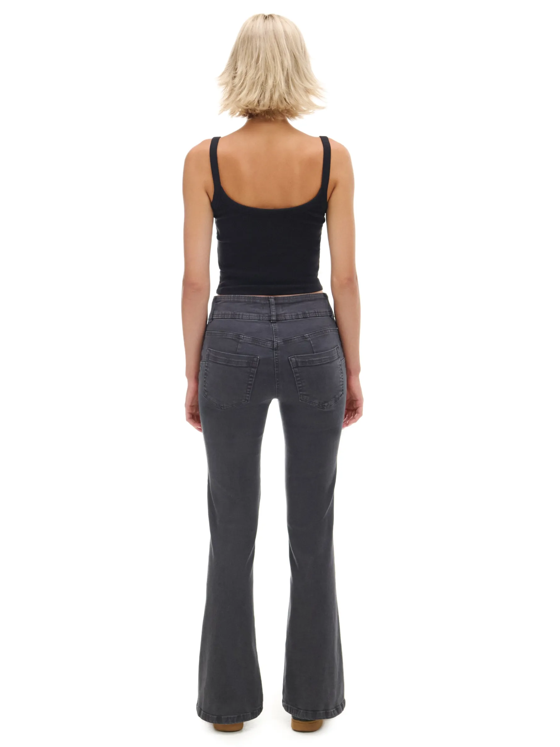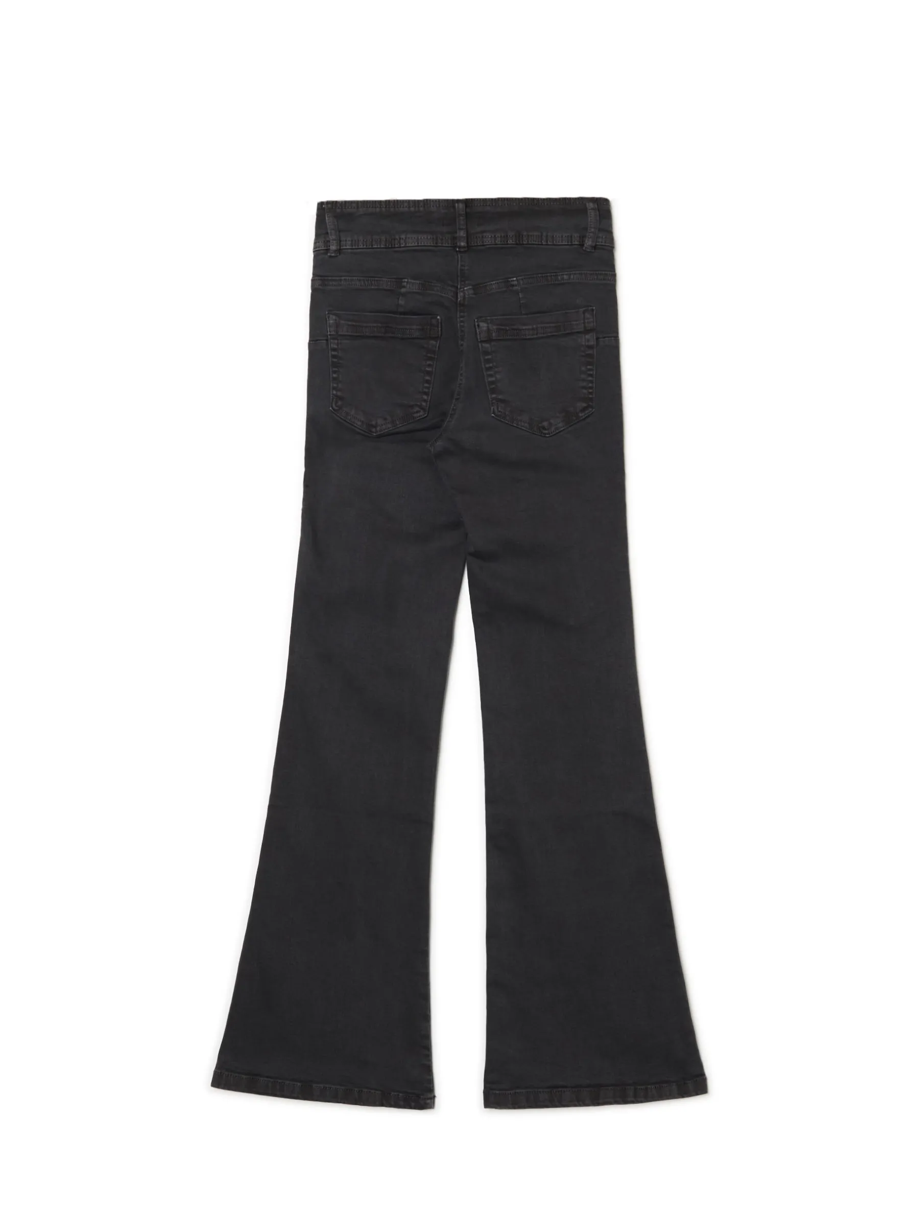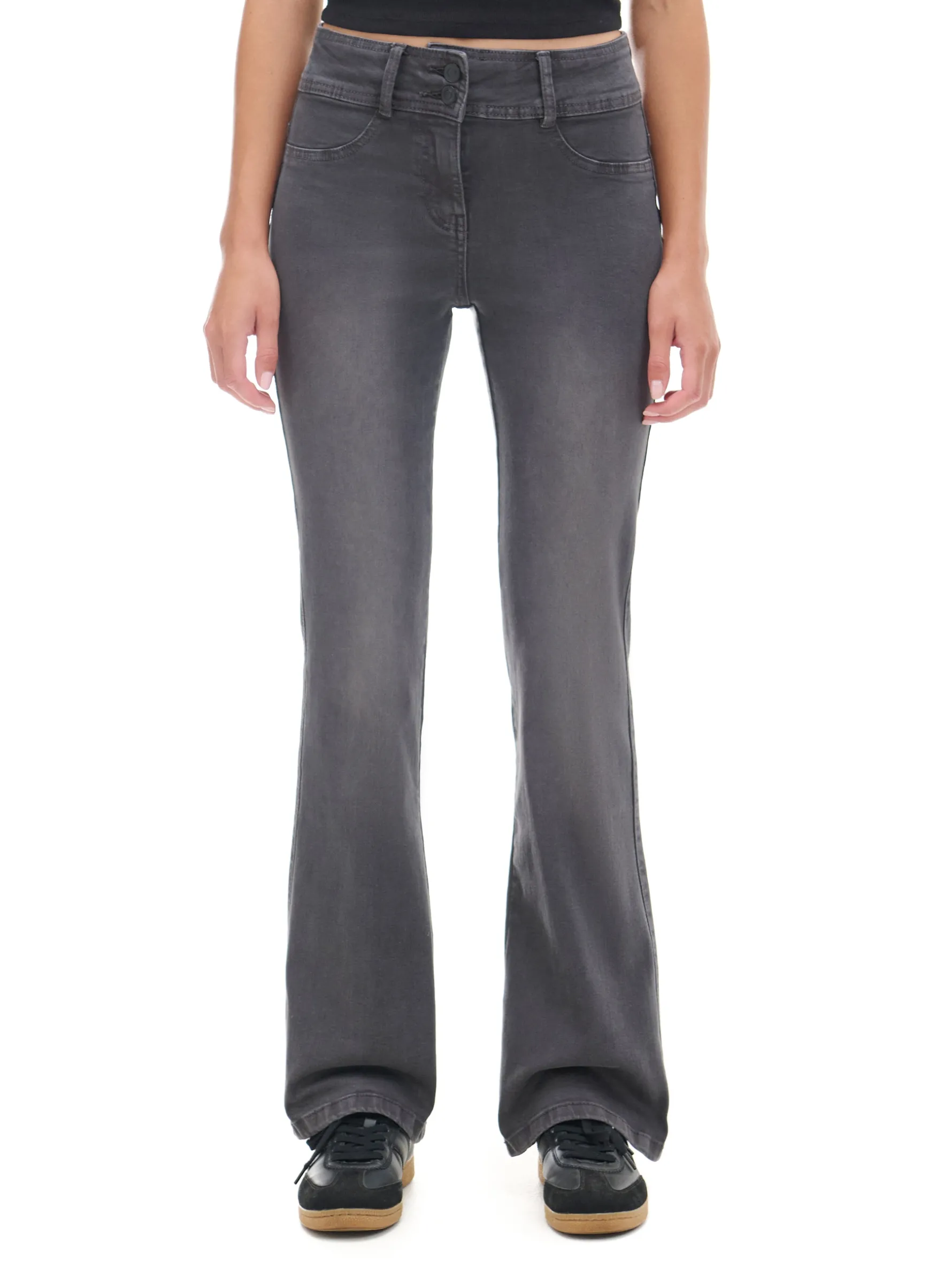 Damskie spodnie uszyte z trwałej i elastycznej tkaniny. Ciekawe zapięcie na 2 guziki i ozdobny efekt sprania na nogawkach wyróżniają ten model. bawełna z dodatkiem elastycznych włókien spodnie o kroju flare regularny stan zapięcie na dwa guziki i zamek długie nogawki rozszerzane u dołu imitacja kieszeni z przodu naszywane kieszenie z tyłu ozdobne zakładki z tyłu lekki efekt sprania na udach szerokie szlufki na pasek Wzrost modelki: 177 cm