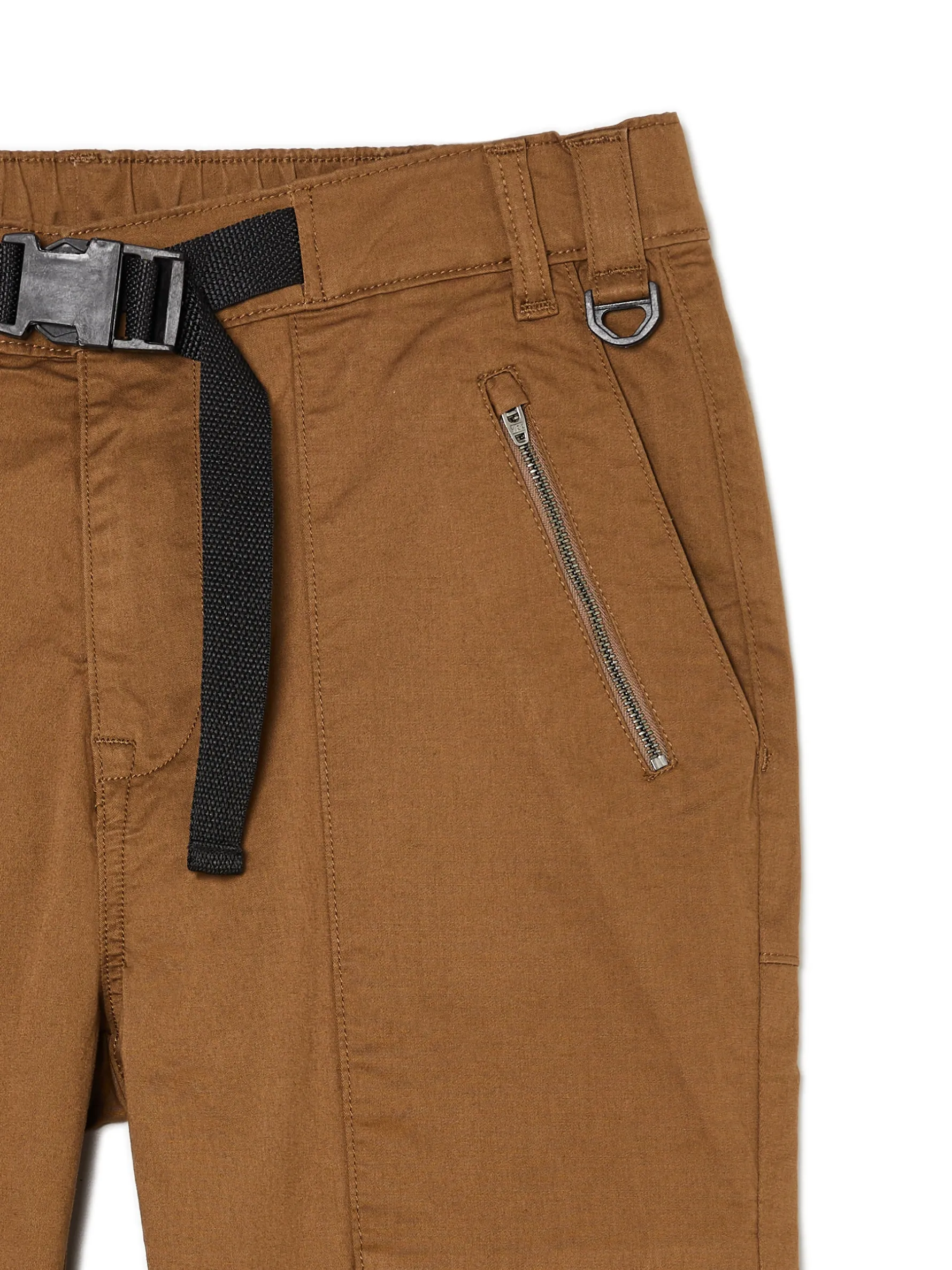 Ciemnobrązowe spodnie męskie o regularnym kroju, uszyte z bawełnianej tkaniny z dodatkiem elastycznych włókien. w pasie regulacja za pomocą klamry 6 kieszeni, w tym dodatkowe kieszenie na nogawkach prosta nogawka spodnie dostępne w innej wersji kolorystycznej