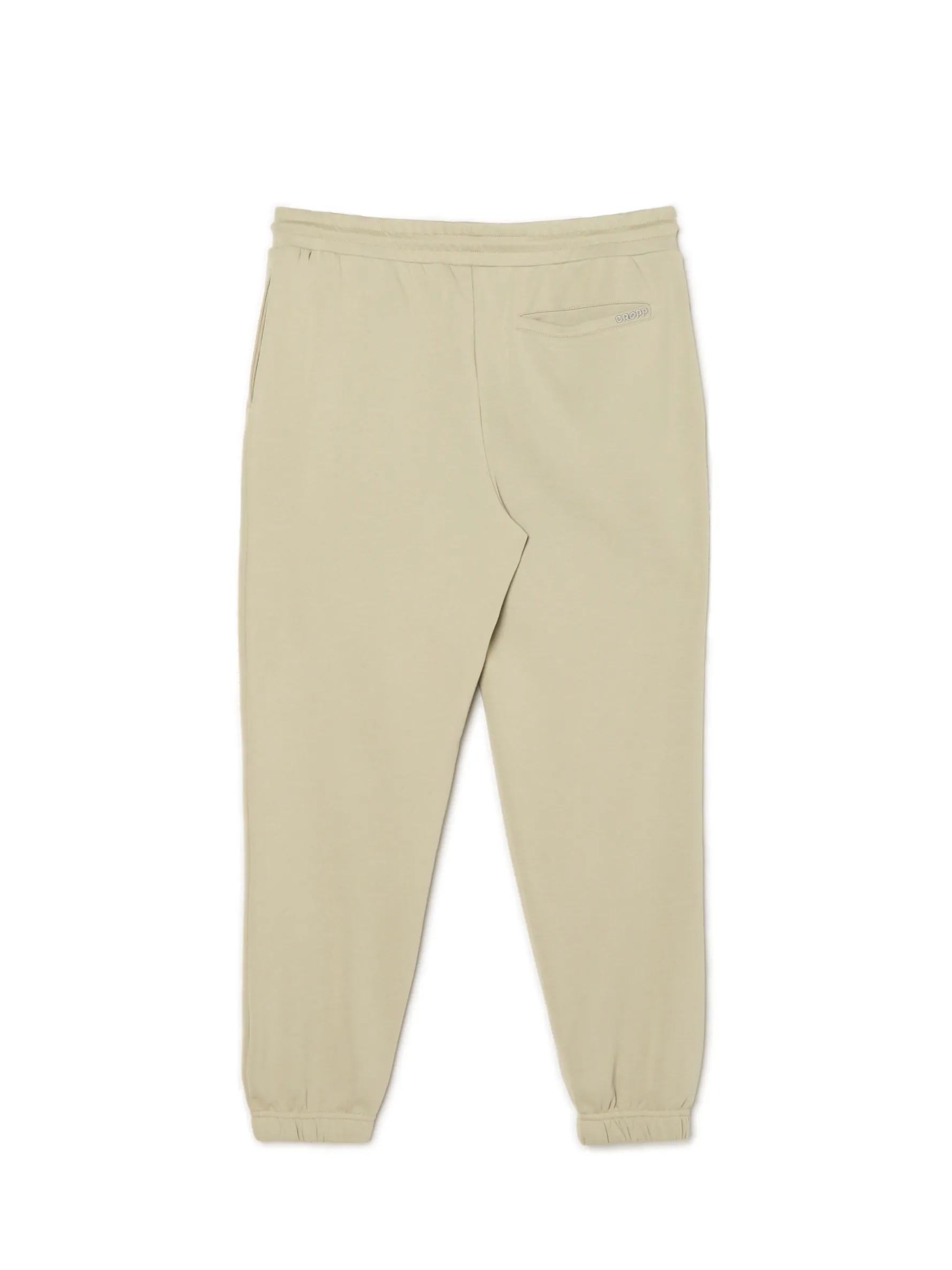 Męskie dresy typu jogger, uszyte z dzianiny zawierającej bawełnę w jednolitym, oliwkowym kolorze. dzianinowy materiał z bawełną regularny stan guma w pasie ze sznurkiem do regulacji długie, swobodne nogawki wykończone ściągaczem otwarte kieszenie z przodu listewkowa kieszeń z tyłu naszywka z napisem Cropp