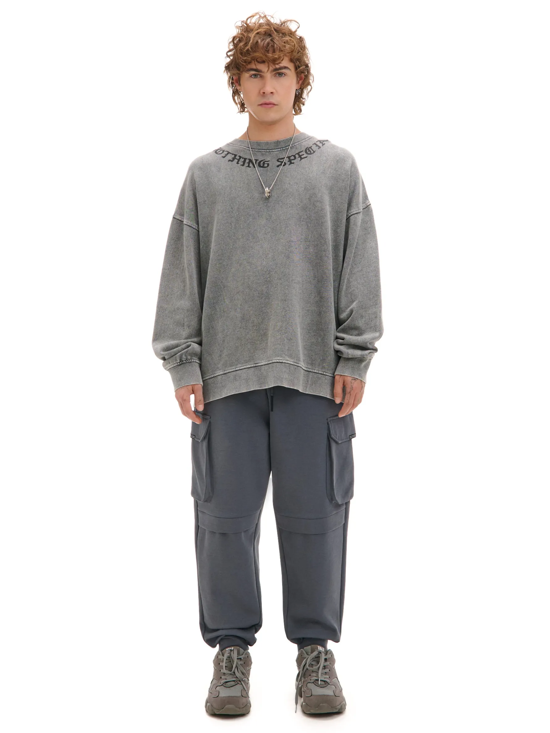Szare męskie dresy uszyte z dżersejowej dzianiny zawierającej bawełnę. Regularny stan, komfortowe zapięcie i co najważniejsze duża ilość kieszeni to must have tej jesieni. dzianina z dodatkiem elastycznych włókien regularny stan guma w pasie ze sznurkiem do regulacji długie nogawki wykończone ściągaczem 7 kieszeni, w tym jedna z zapięciem na zatrzask otwarte kieszenie po bokach 4 kieszenie z patkami na nogawkach efekt sprania na całości ozdobne wstawki na nogawkach naszywki na kieszeniach