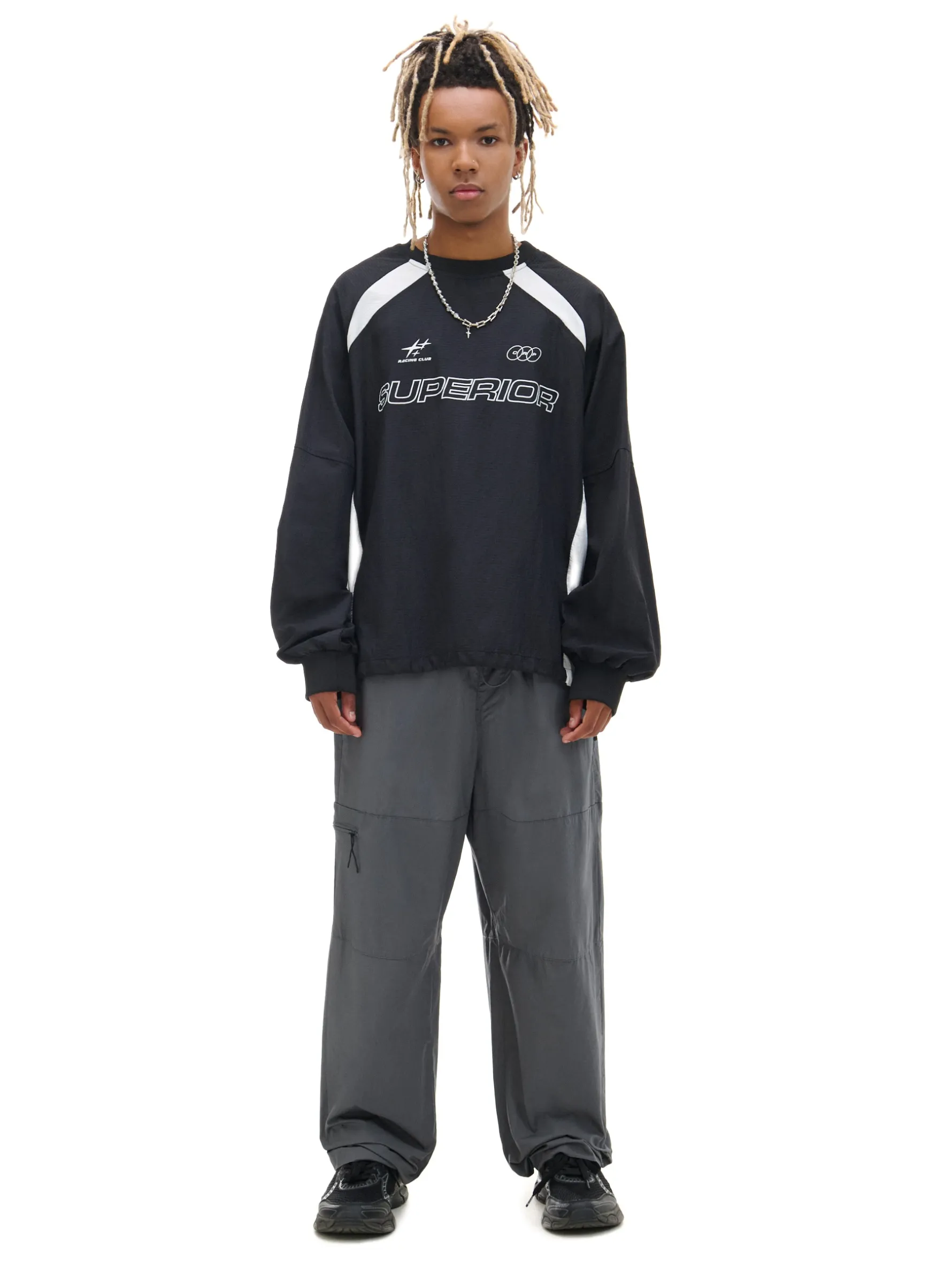 Męskie spodnie o luźnym kroju, uszyte z tkaniny zawierającej 100% bawełny. Idealny wybór na Baltic Games! krój loose w pasie elastyczna gumka, regulowana stoperem luźna, długa nogawka imitacja rozporka dwie kieszenie boczne, jedna kieszeń z tyłu jedna kieszeń zapinana na suwak na wysokości kolana