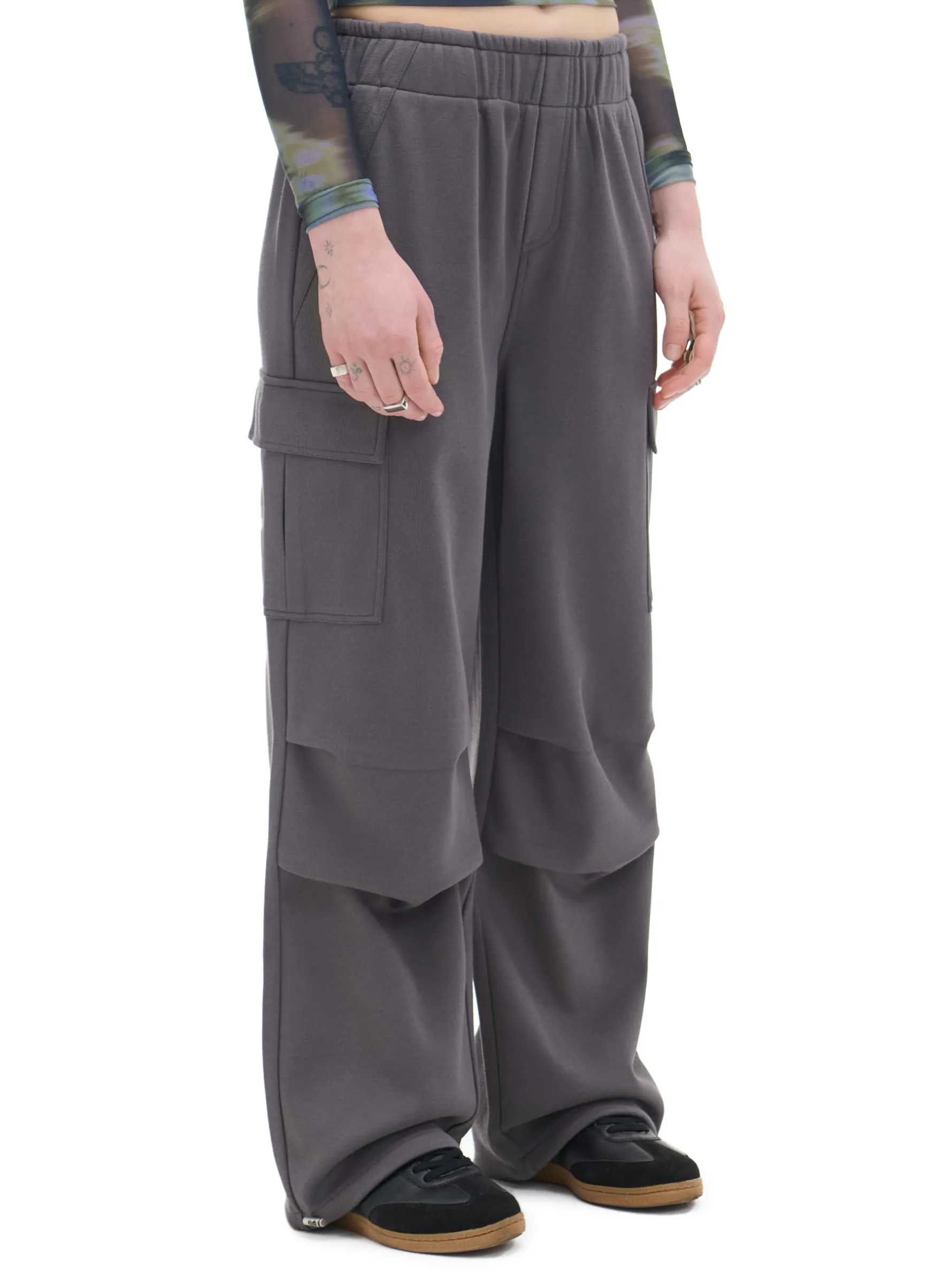 Te damskie spodnie typu cargo w stonowanym, szarym kolorze będą fitowały z Twoimi stylizacjami. materiał z dużą zawartością bawełny luźny krój typu cargo ze ściągaczami uniwersalna gumka w pasie para klasycznych kieszeni i typu cargo na nogawkach ozdobna imitacja zapięcia zagięcia w wersji parachute na kolanach ozdobne taśmy przy kieszeniach