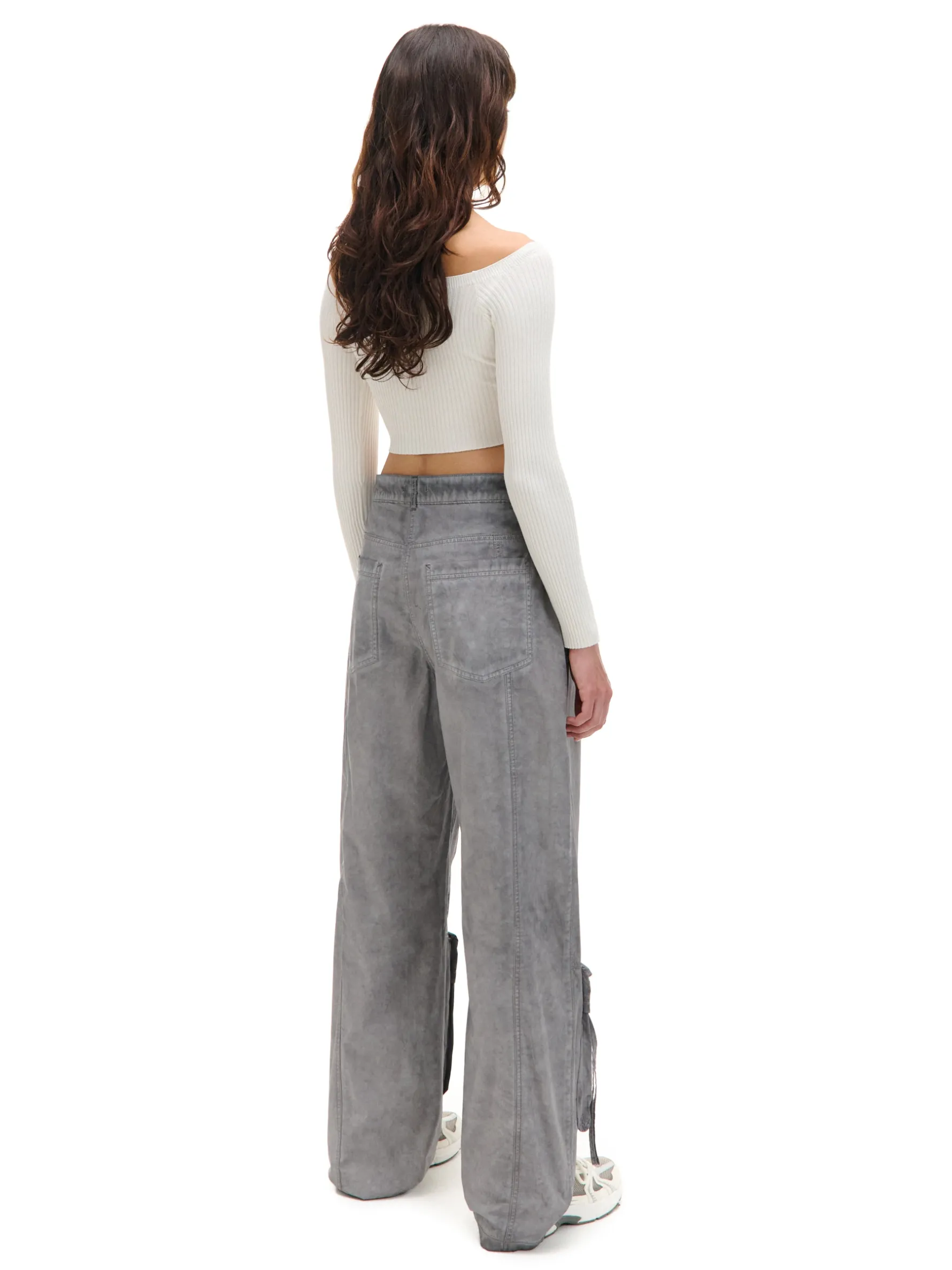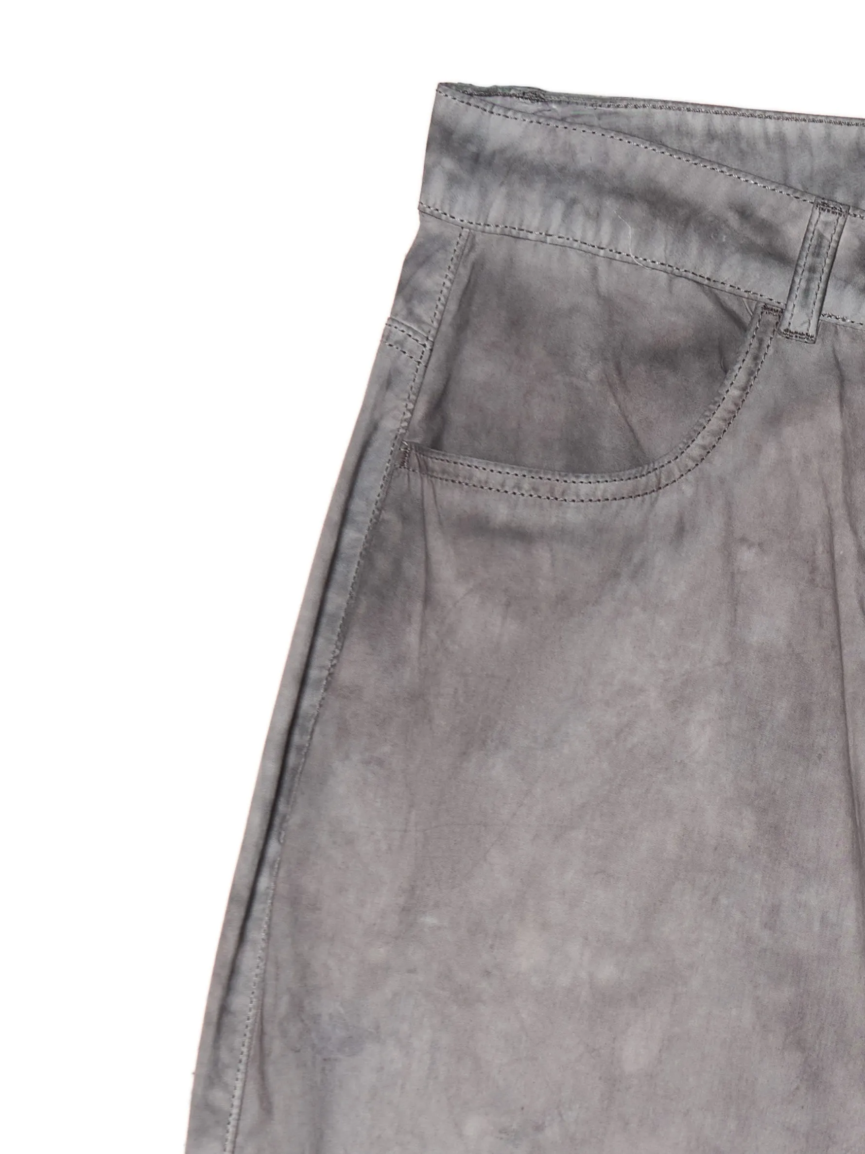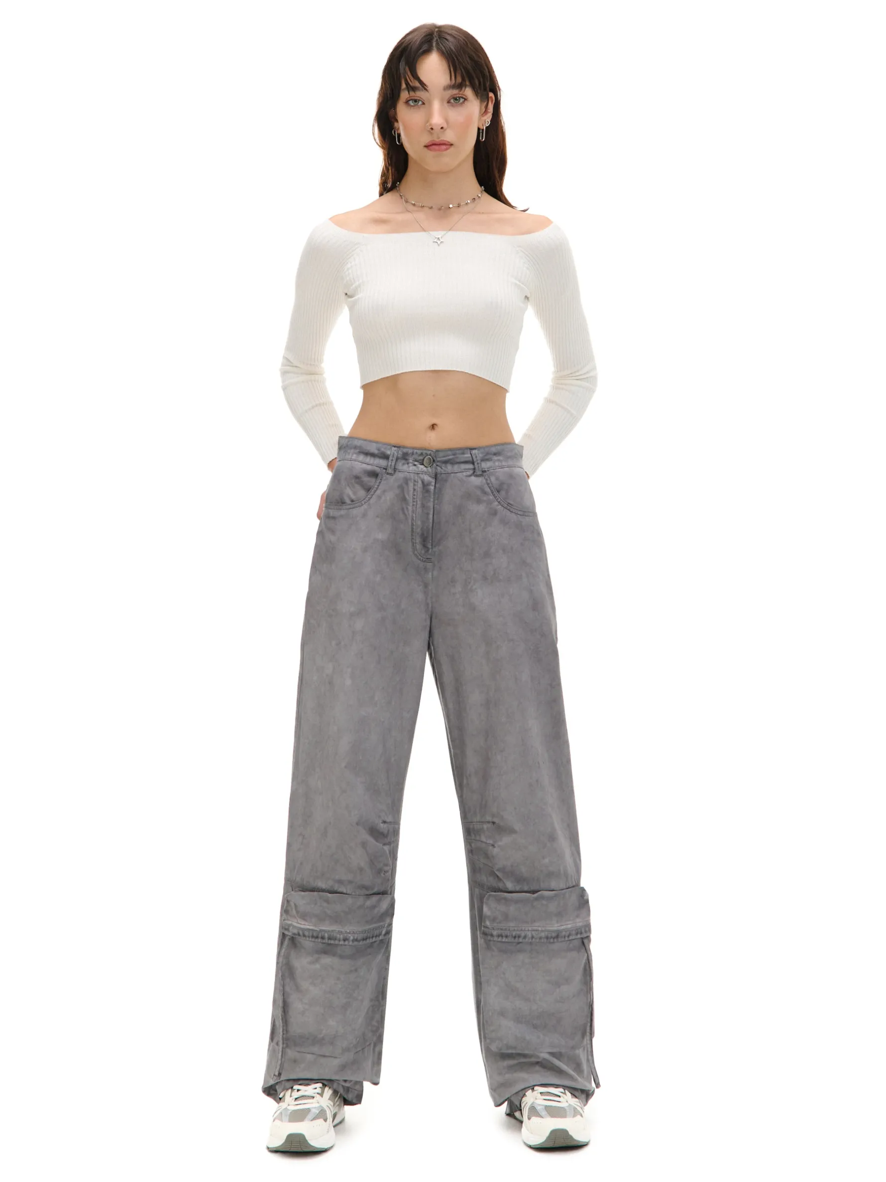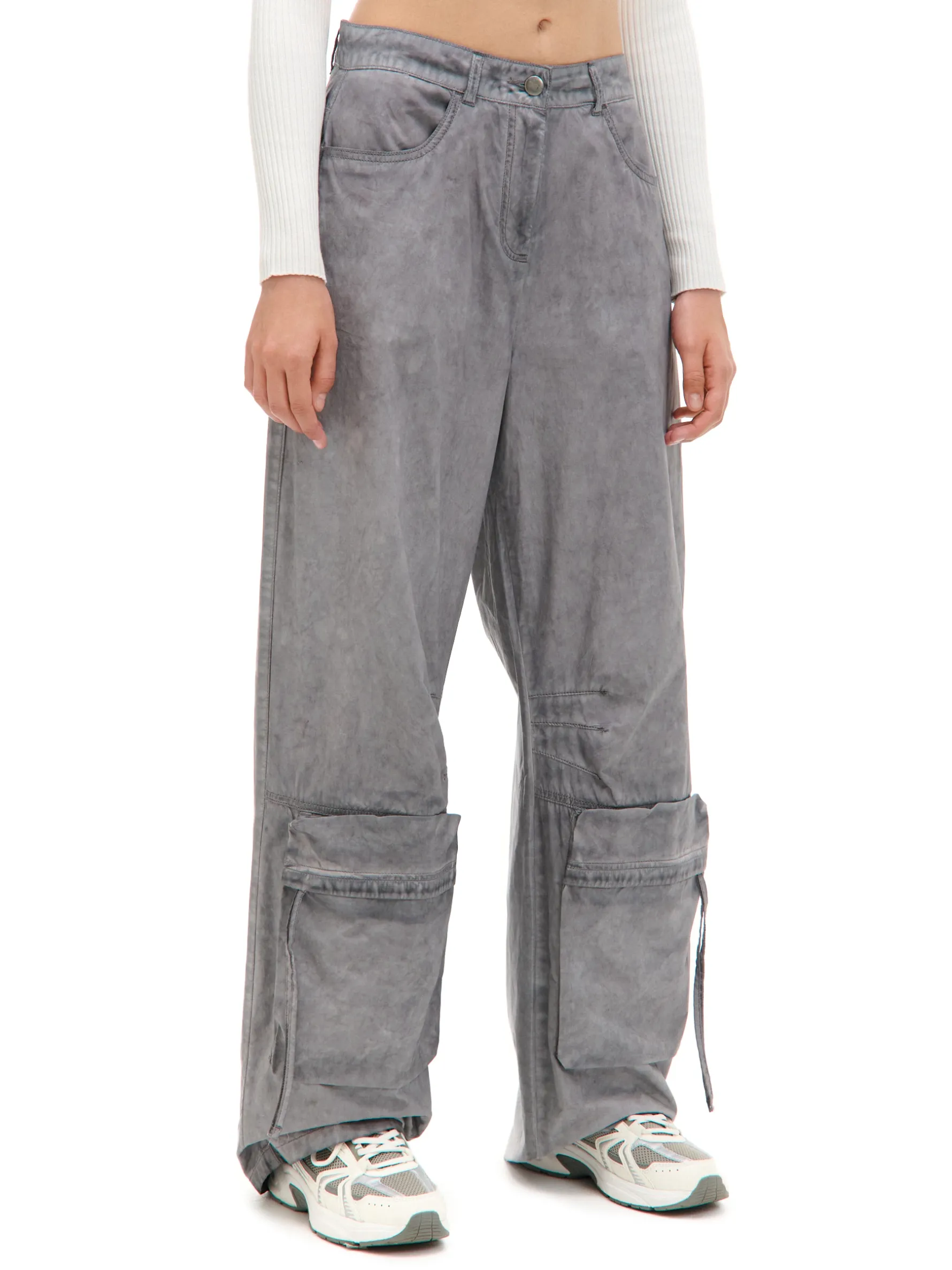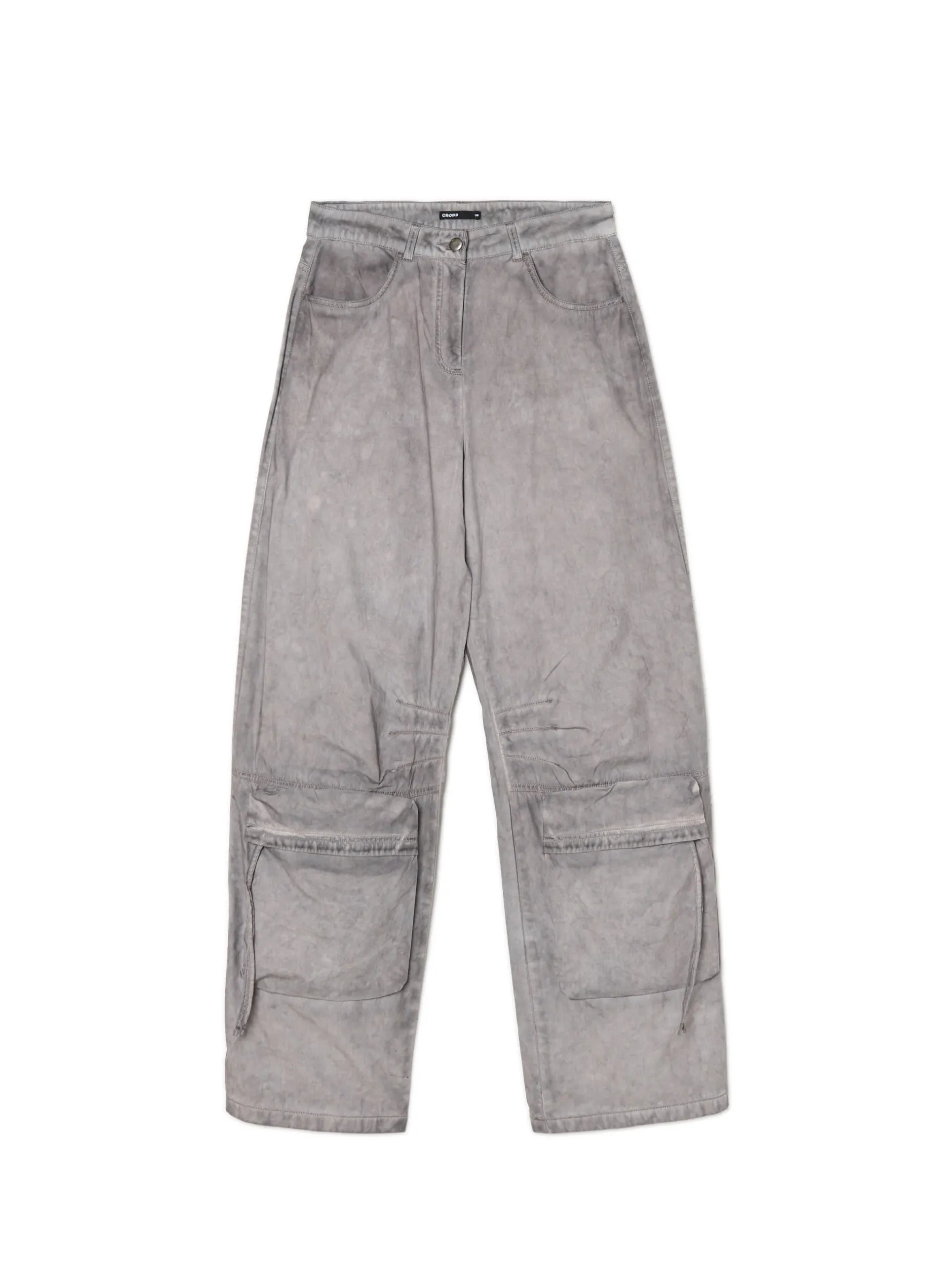 Szare męskie spodnie o luźnym kroju, uszyte z mocnej, bawełnianej tkaniny. Praktyczne kieszenie w tym dwie z patkami na suwak i efekt sprania, to must have spontanicznych wypadów z ekipą. 100% bawełny swobodny, luźny krój zapięcie na zamek i guzik długie, swobodne nogawki dwie kieszenie po bokach naszywane kieszenie z tyłu dodatkowe kieszenie cargo na nogawkach szlufki na pasek modelujące zakładki z przodu efekt sprania na całości