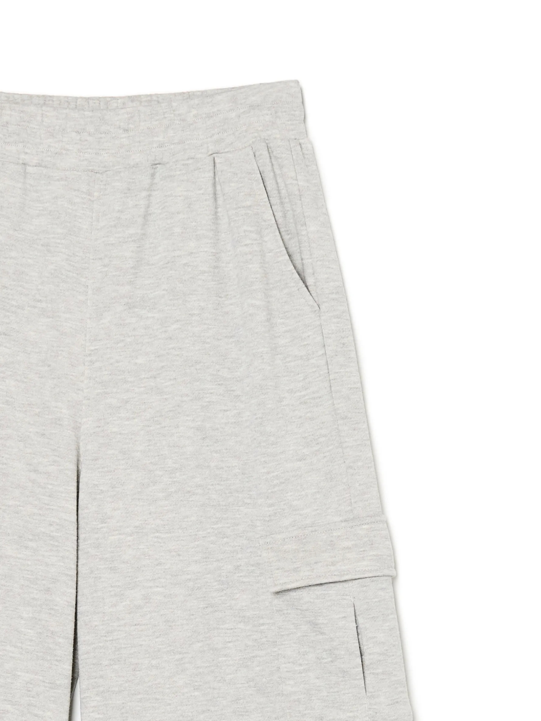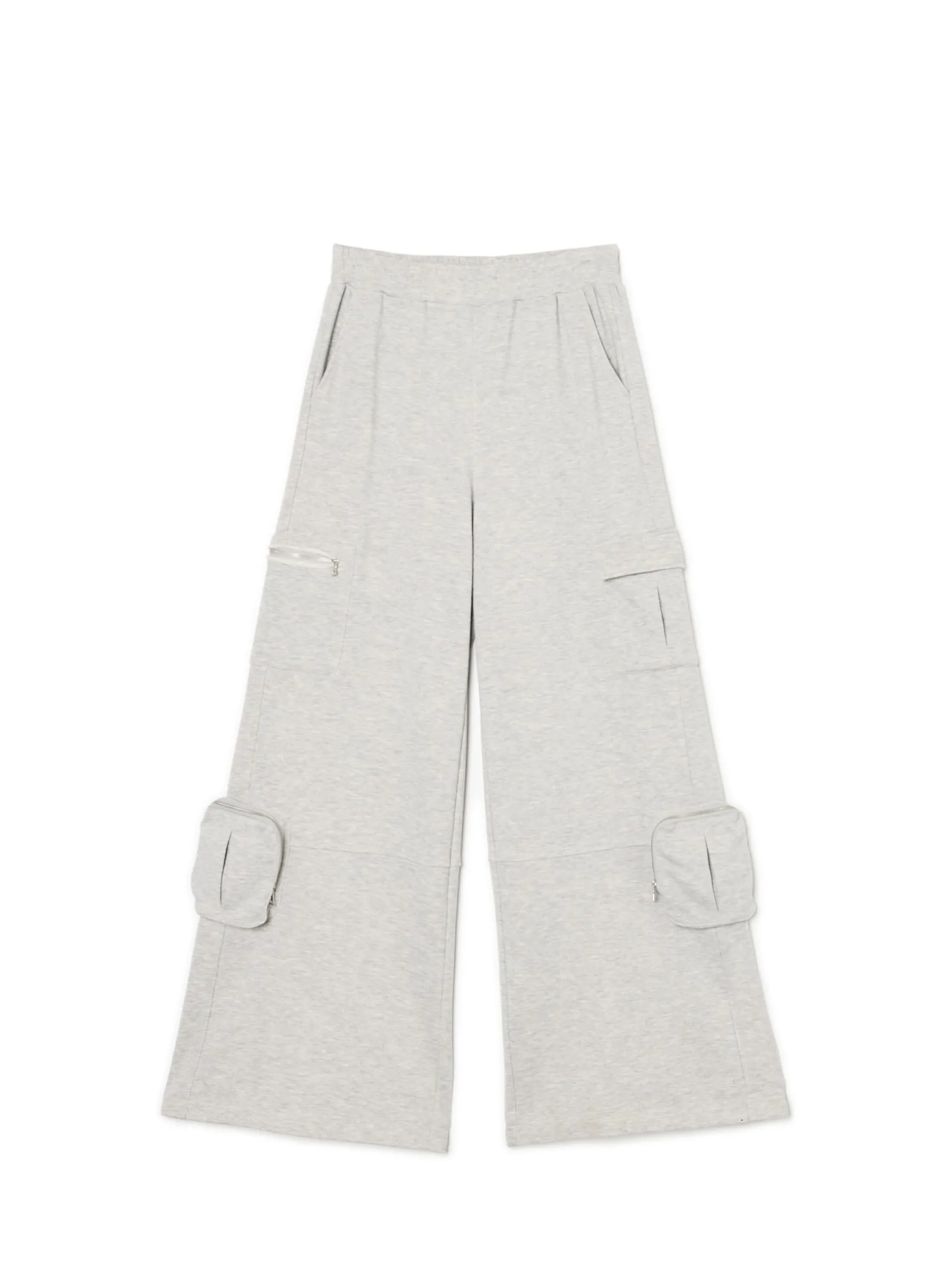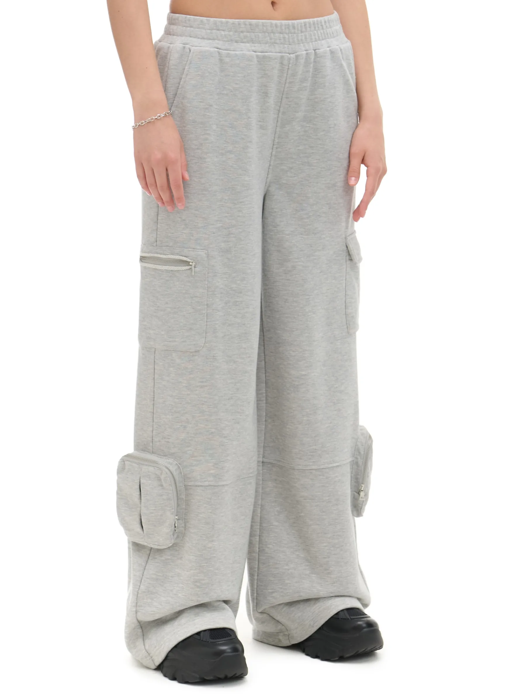 Jerseyowe spodnie o luźnym fasonie z zestawem kieszeni z przodu. Wszystkie Twoje rzeczy będę w nich bezpieczne! uszyte z dzianiny z bawełną wygodny, luźny krój gumka w pasie szerokie nogawki dwie kieszenie boczne dwie kieszenie boczne z zapięciem na zamek kieszeń typu cargo i dodatkowa na zamek