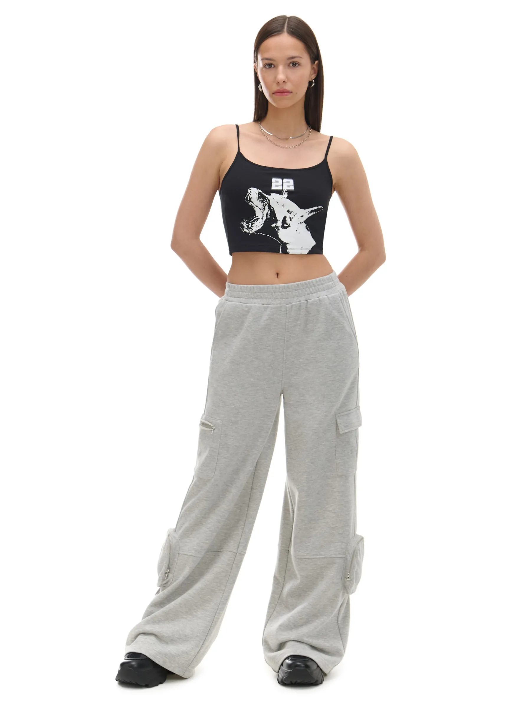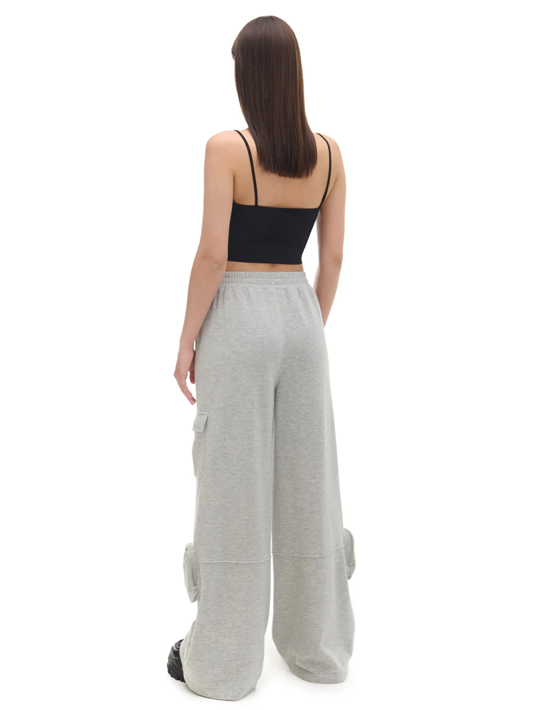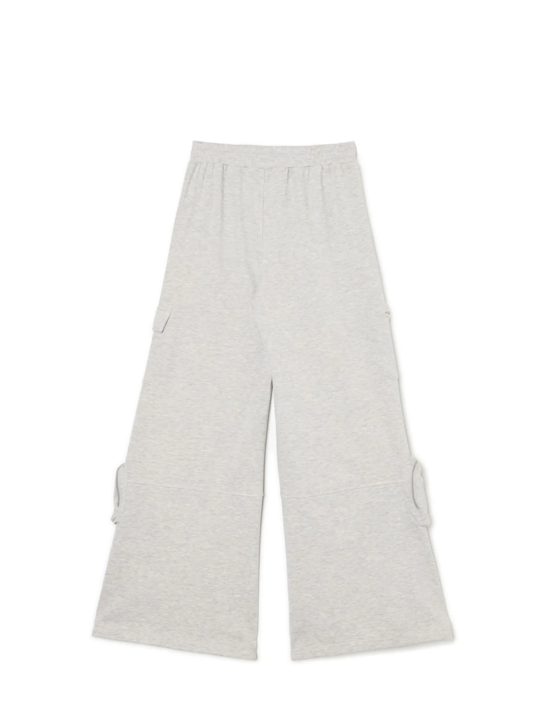Jerseyowe spodnie o luźnym fasonie z zestawem kieszeni z przodu. Wszystkie Twoje rzeczy będę w nich bezpieczne! uszyte z dzianiny z bawełną wygodny, luźny krój gumka w pasie szerokie nogawki dwie kieszenie boczne dwie kieszenie boczne z zapięciem na zamek kieszeń typu cargo i dodatkowa na zamek
