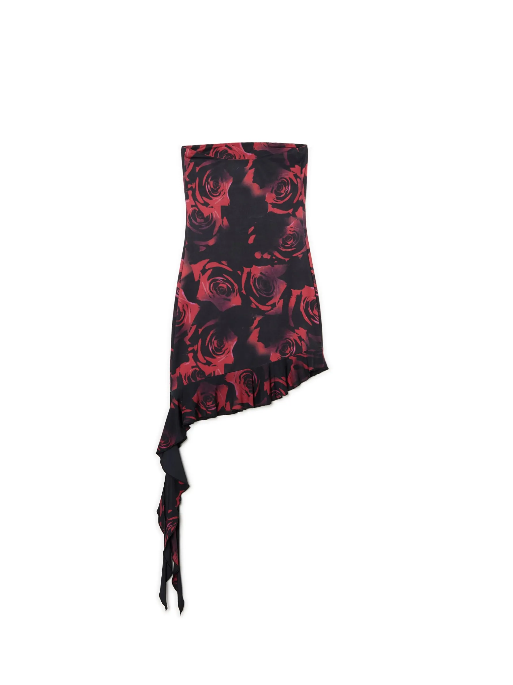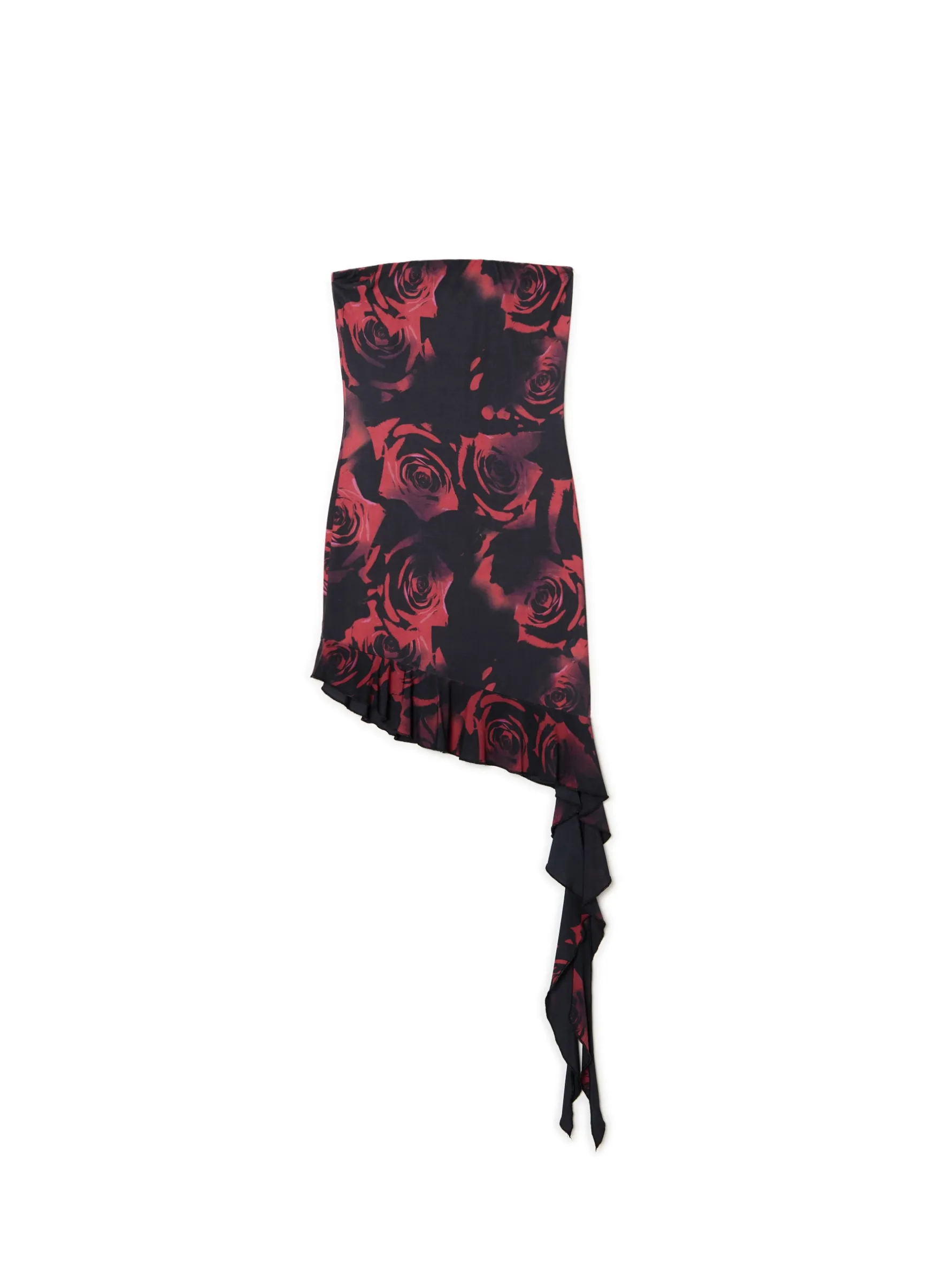 Czarno-czerwona krótka sukienka bez ramiączek, uszyta z materiału z dodatkiem elastycznych włókien. długość mini mocno dopasowany krój, podkreślający figurę brzeg dekoltu z wszytą elastyczną gumką asymetryczna spódnica, wykończona falbaną na całości nadruk z motywem czerwonych róż