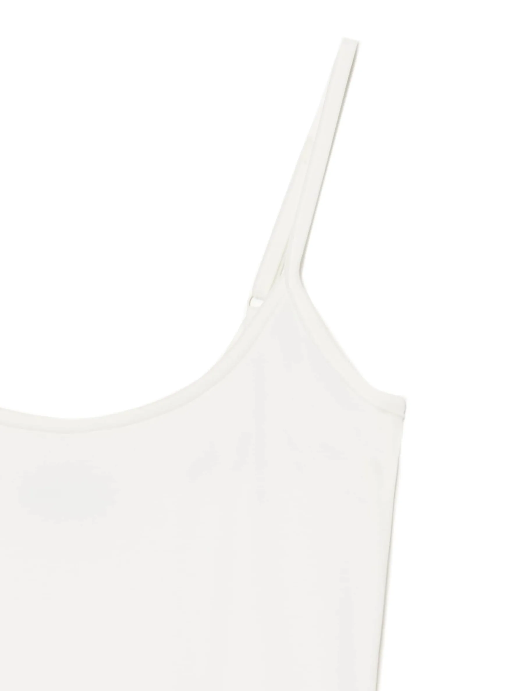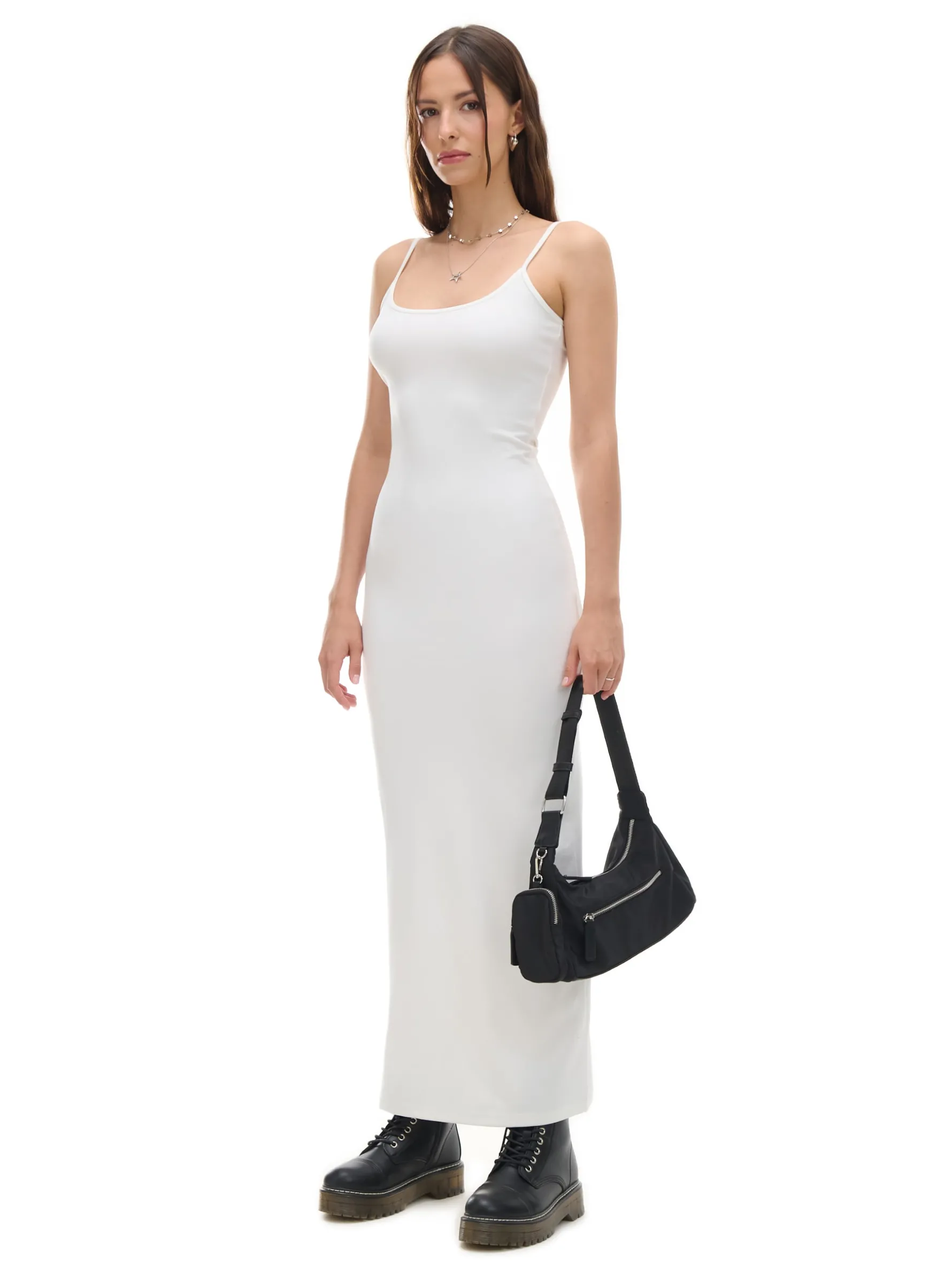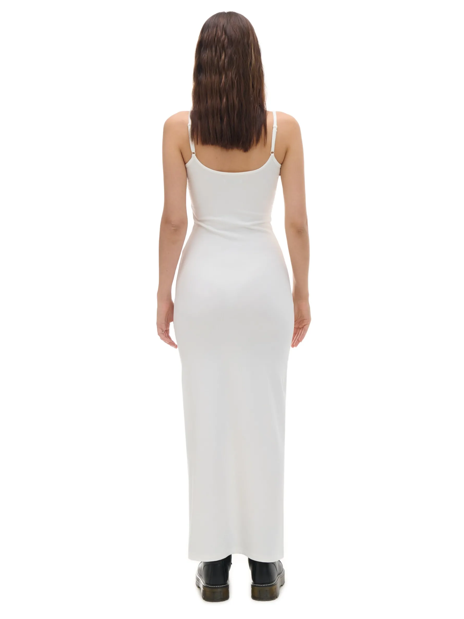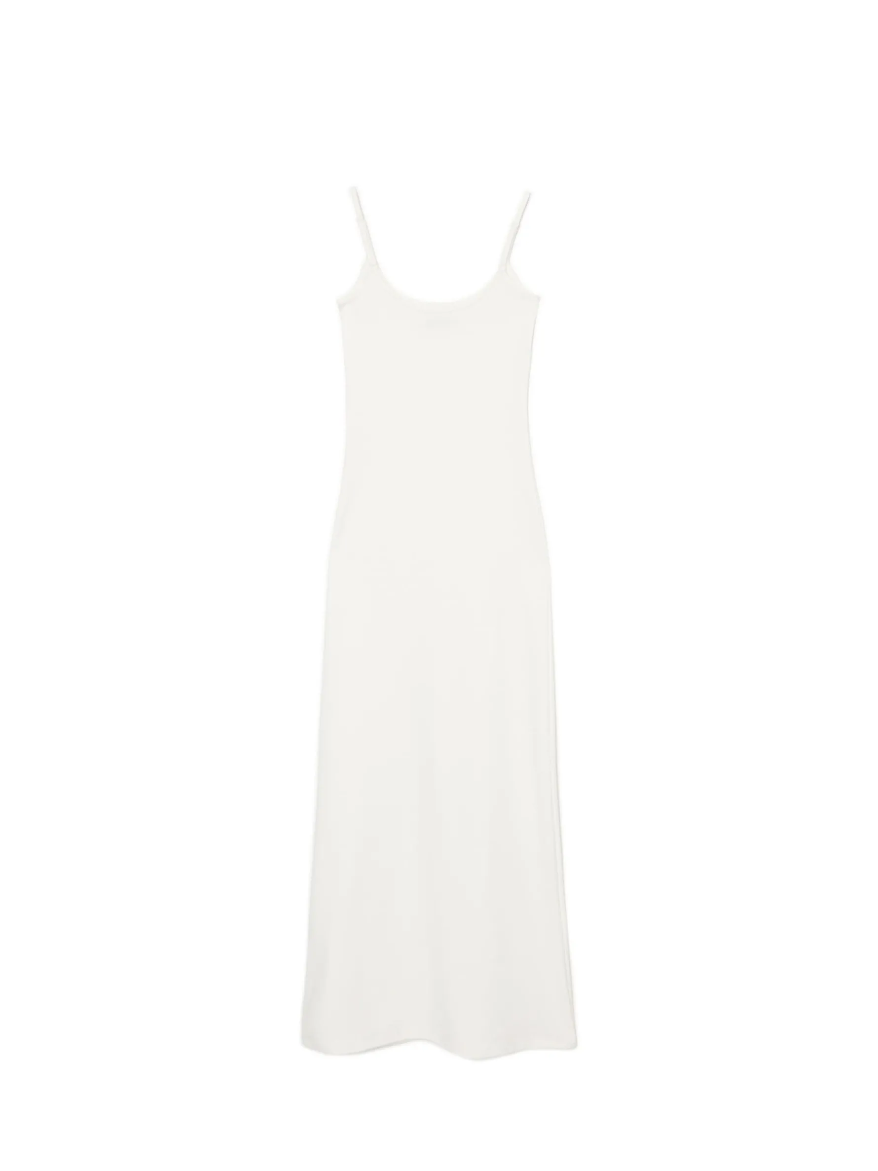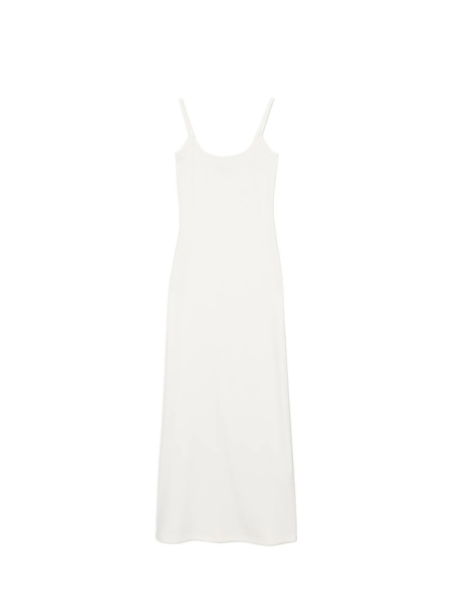 Długa sukienka, uszyta z białej dzianiny. dzianina z domieszką elastycznych włókien długość maxi dopasowany krój podkreślający sylwetkę okrągły dekolt wąskie ramiączka z regulacją długości