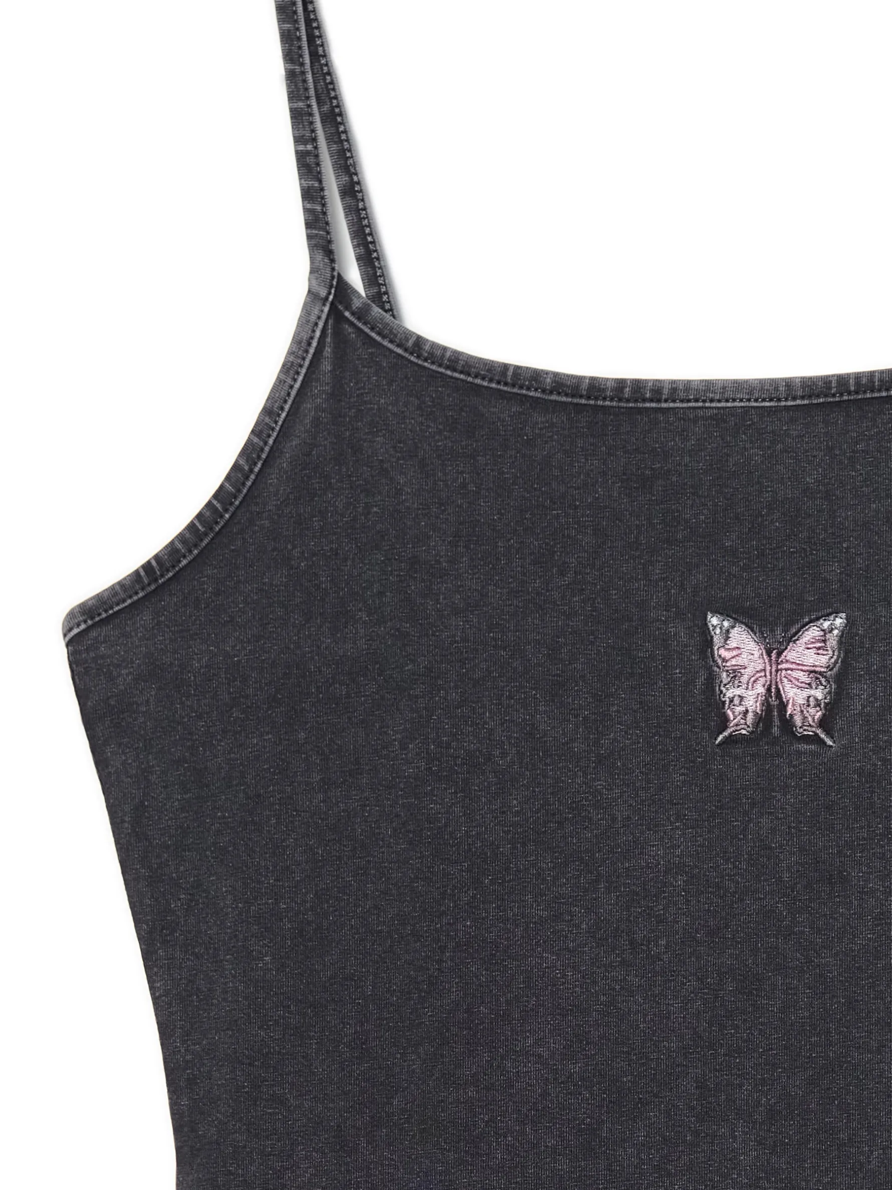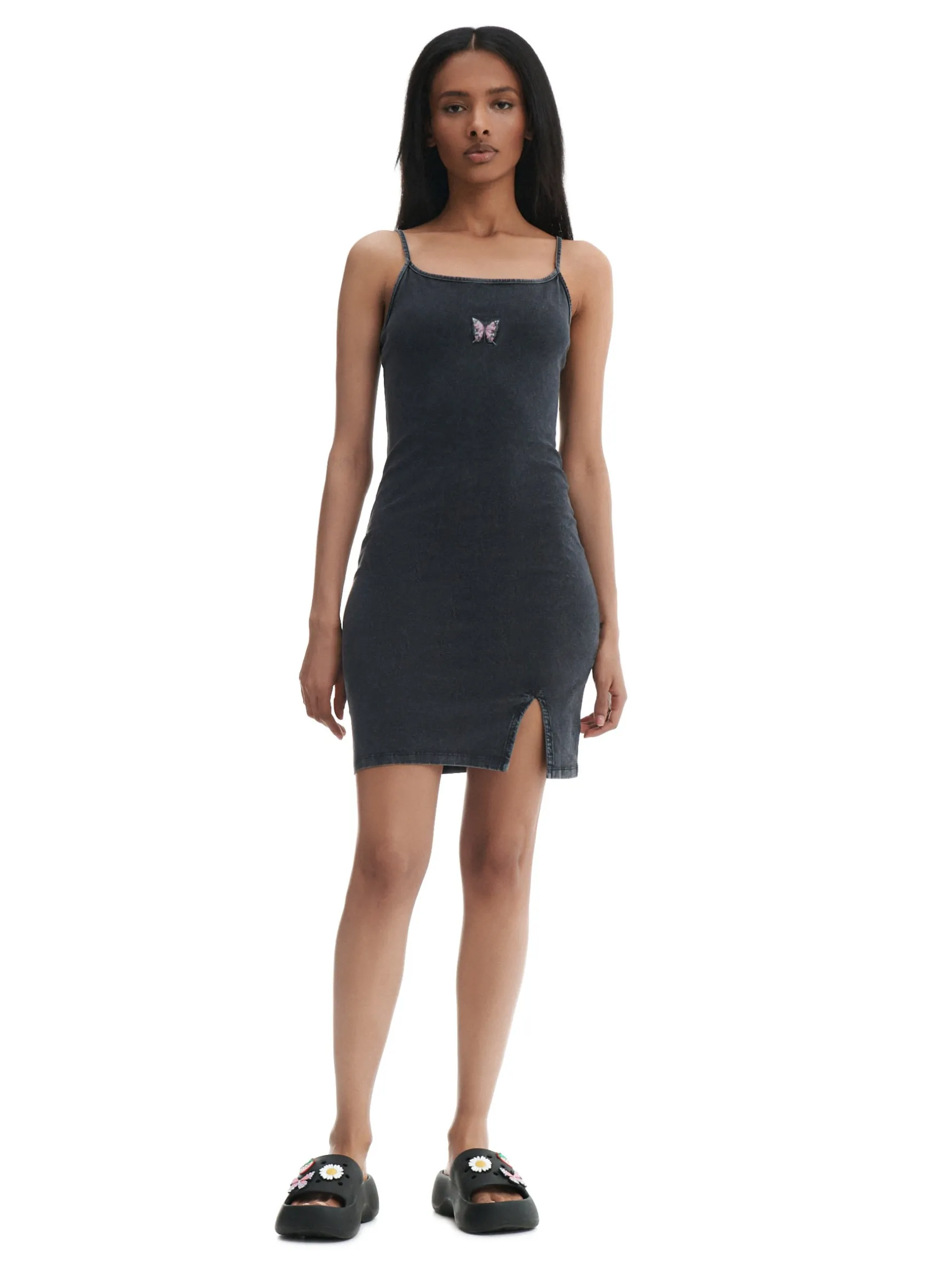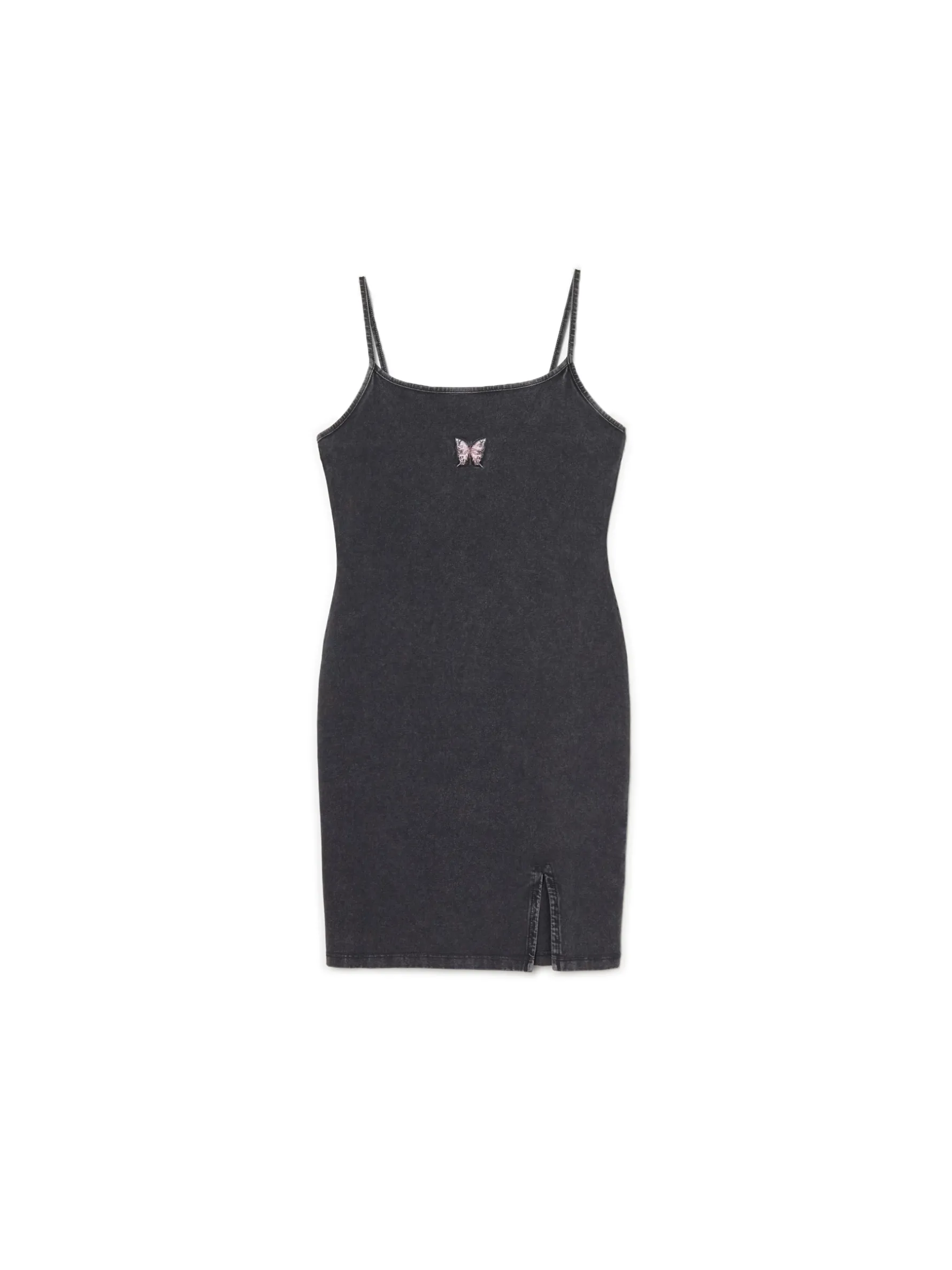 Krótka sukienka damska o dopasowanym kroju, uszyta z elastycznej, bawełnianej dzianiny. cienkie ramiączka z przodu ozdobny haft z motylem i rozcięcie sukienka dostępna w innej wersji kolorystycznej