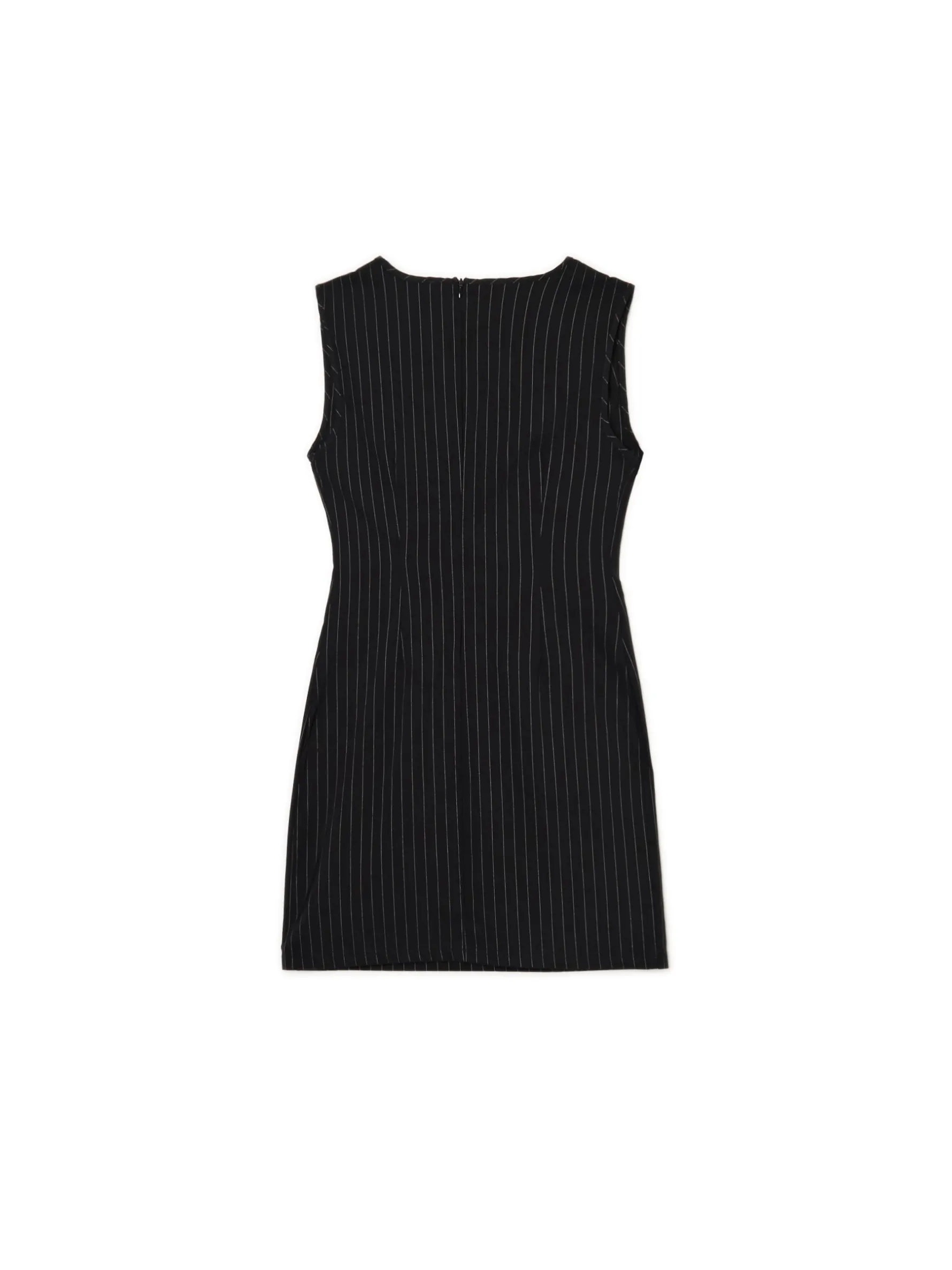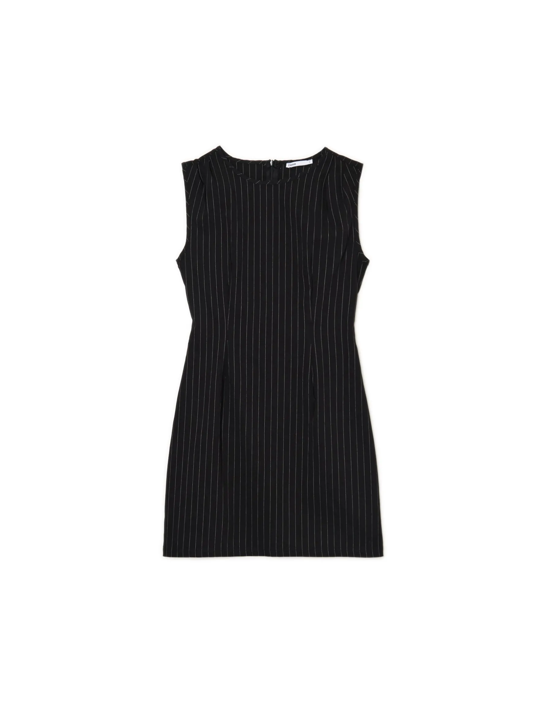 Krótka sukienka, uszyta z niegniecącej się bengaliny o wysokiej zawartości wiskozy. Domieszka elastanu gwarantuje wygodę i dopasowanie. Idealna mała czarna, jeśli chcesz być office siren! długość mini dopasowany krój brak rękawów krój typu princeska zabudowany dekolt typu łódka na plecach kryty suwak wzór w delikatne pionowe prążki w talii przeszycia modelujące sylwetkę