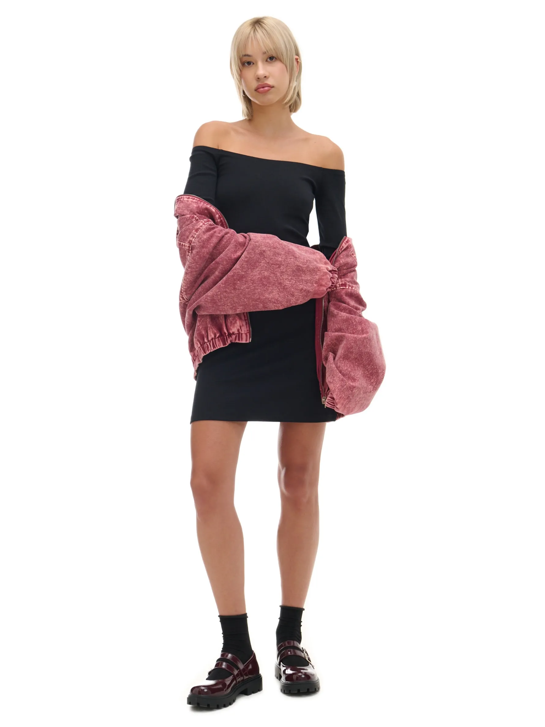 Damska sukienka o długości mini, uszyta z dzianinowego materiału z bawełną. Ozdobą są długie rękawy rozszerzane ku dołowi, nadające lekkości całej stylizacji. bawełna z dodatkiem elastycznych włókien delikatne taliowanie dekolt w łódkę wykończony gumką lekko rozszerzane rękawy opadające ramiona Wzrost modelki: 177 cm