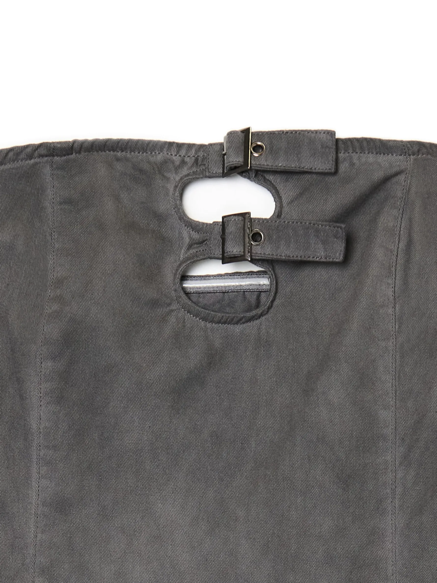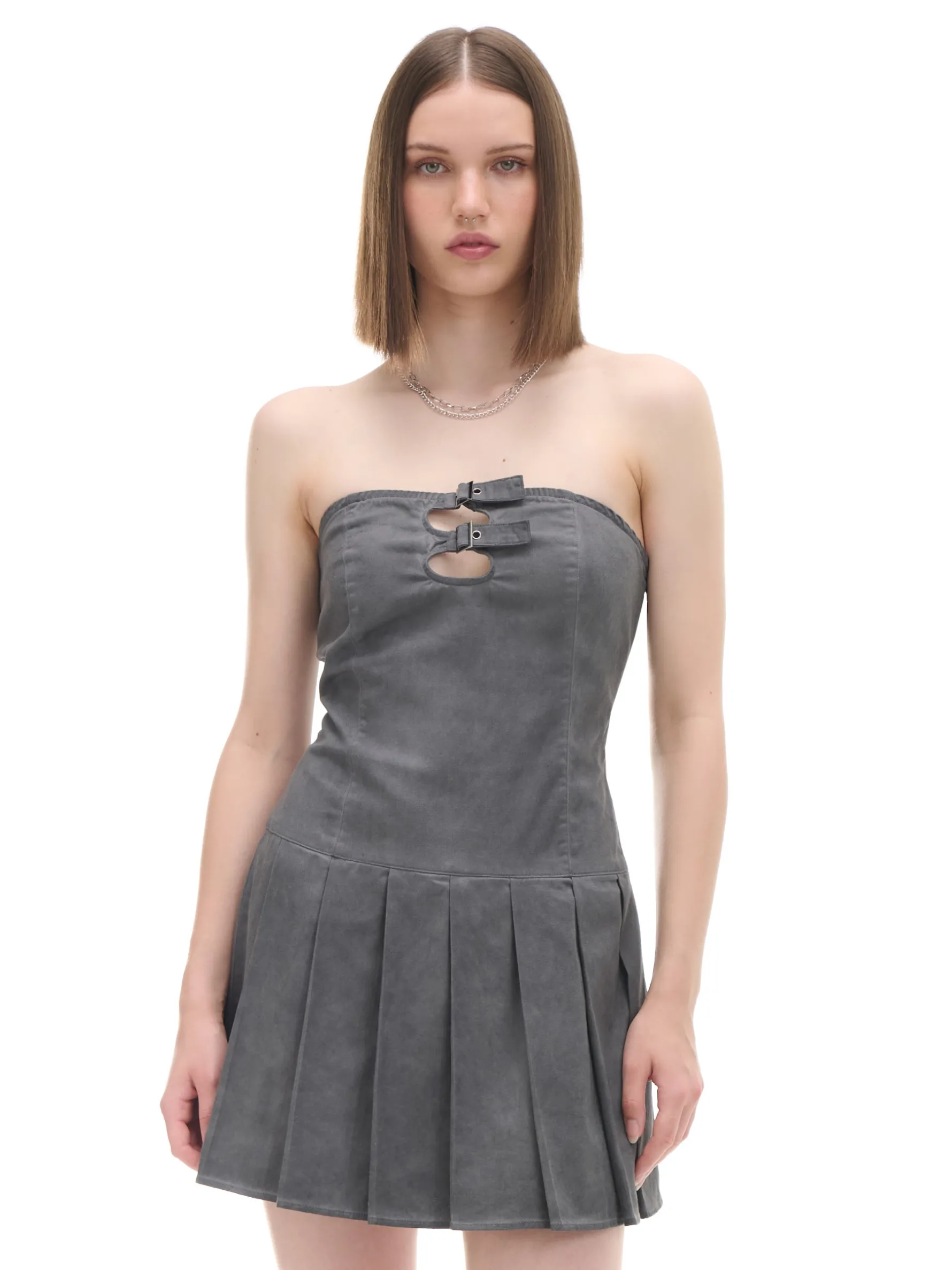 Krótka letnia sukienka, uszyta z szarej bawełnianej tkaniny. Plażowe must-have dla fanek stylu Y2K! długość mini i dopasowany krój bez ramiączek ozdobne paski ze sprzączkami przy dekolcie zapięcie na kryty zamek z boku krótka spódnica z plisami