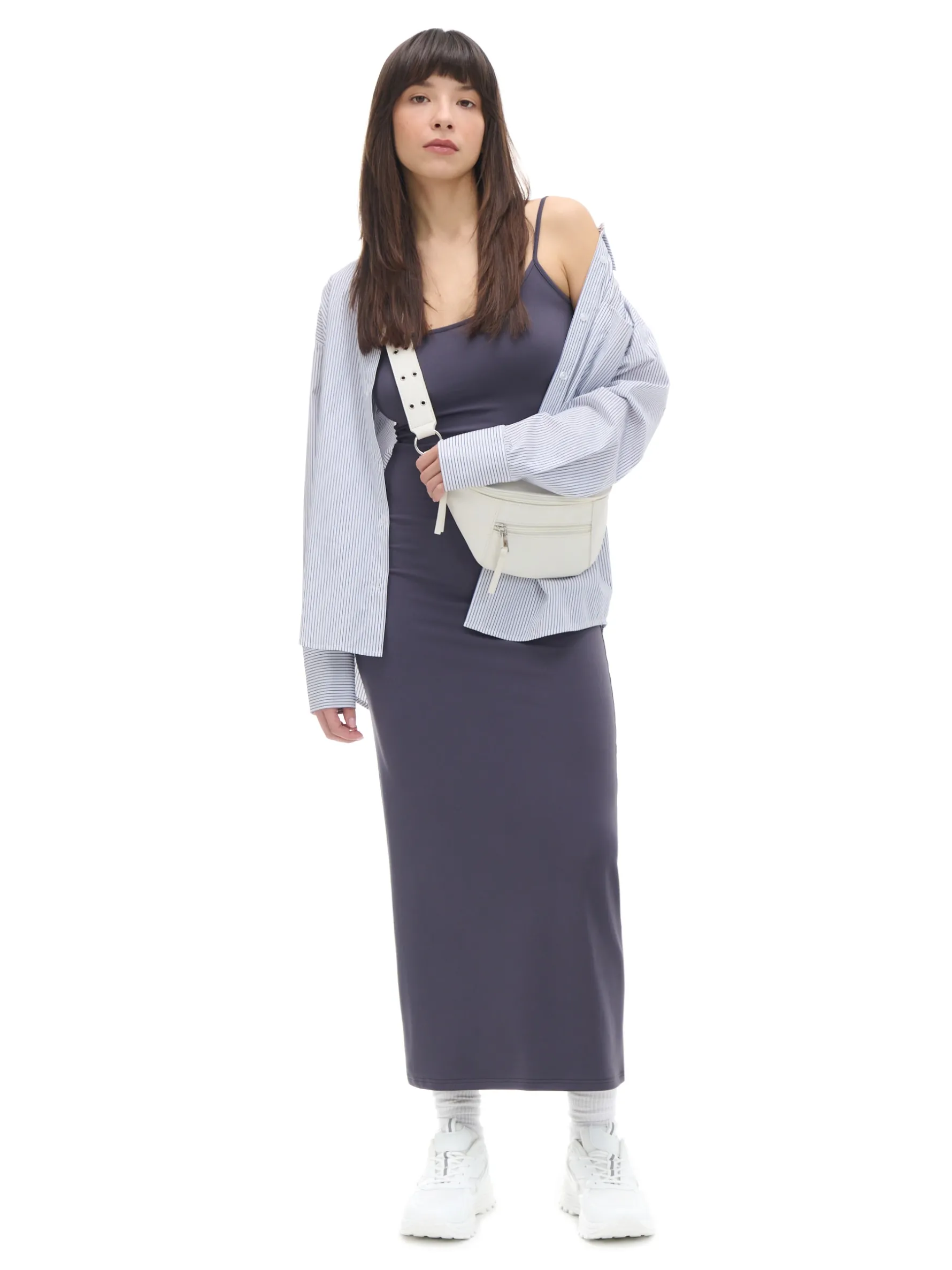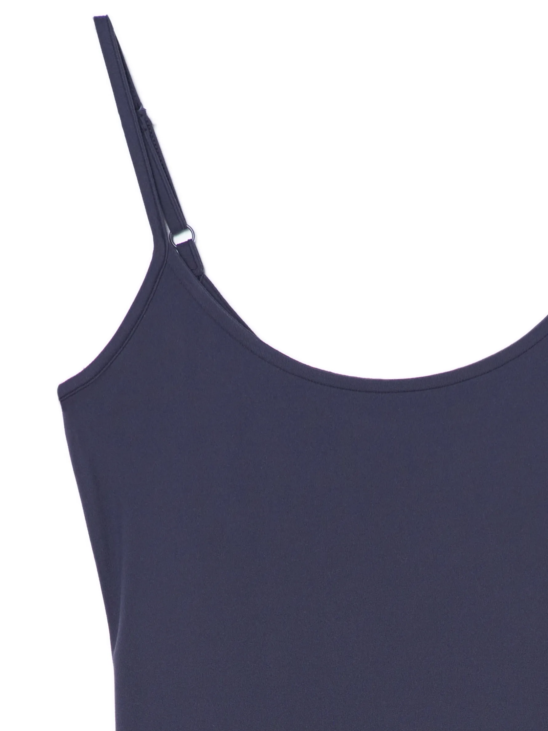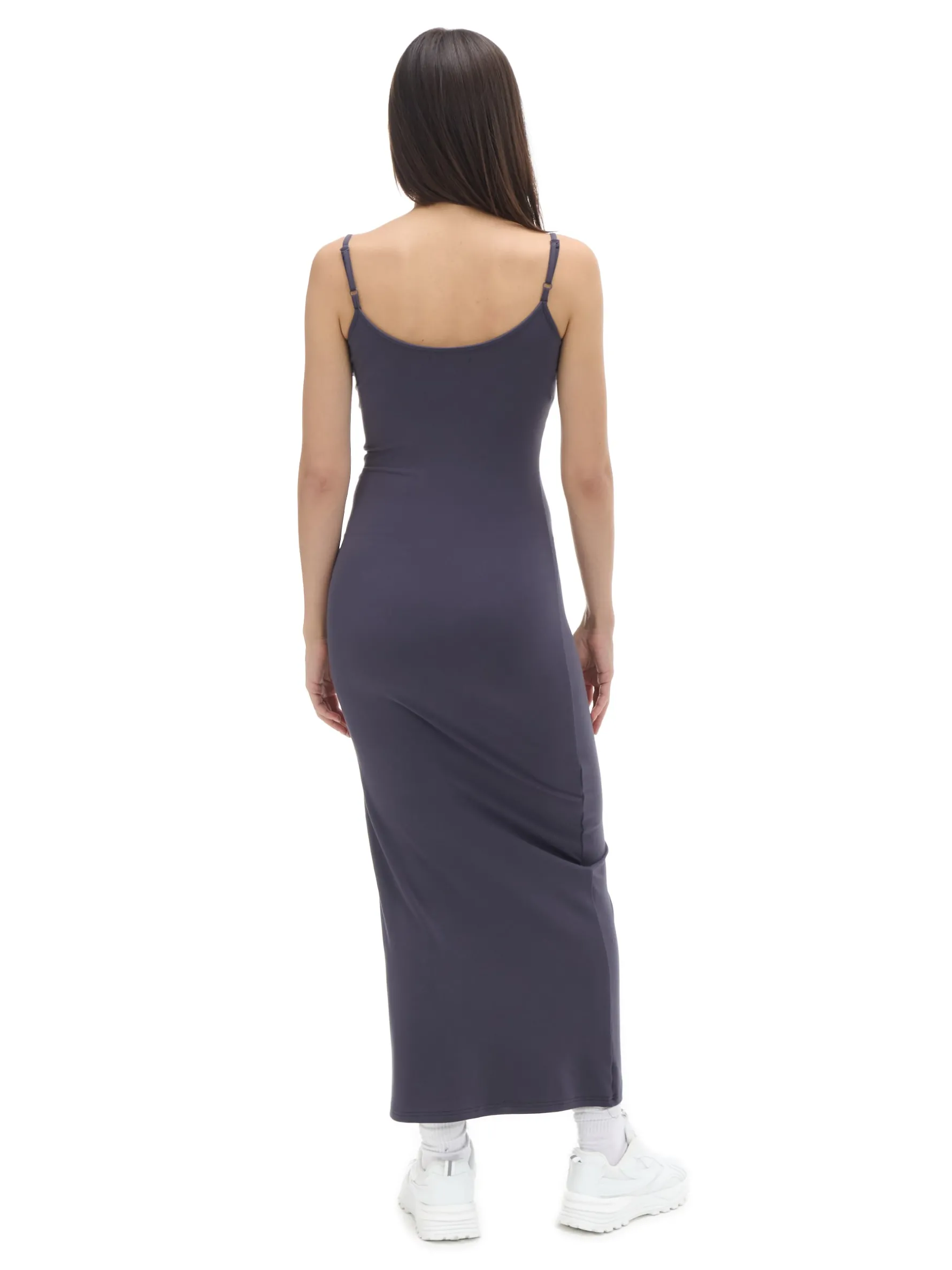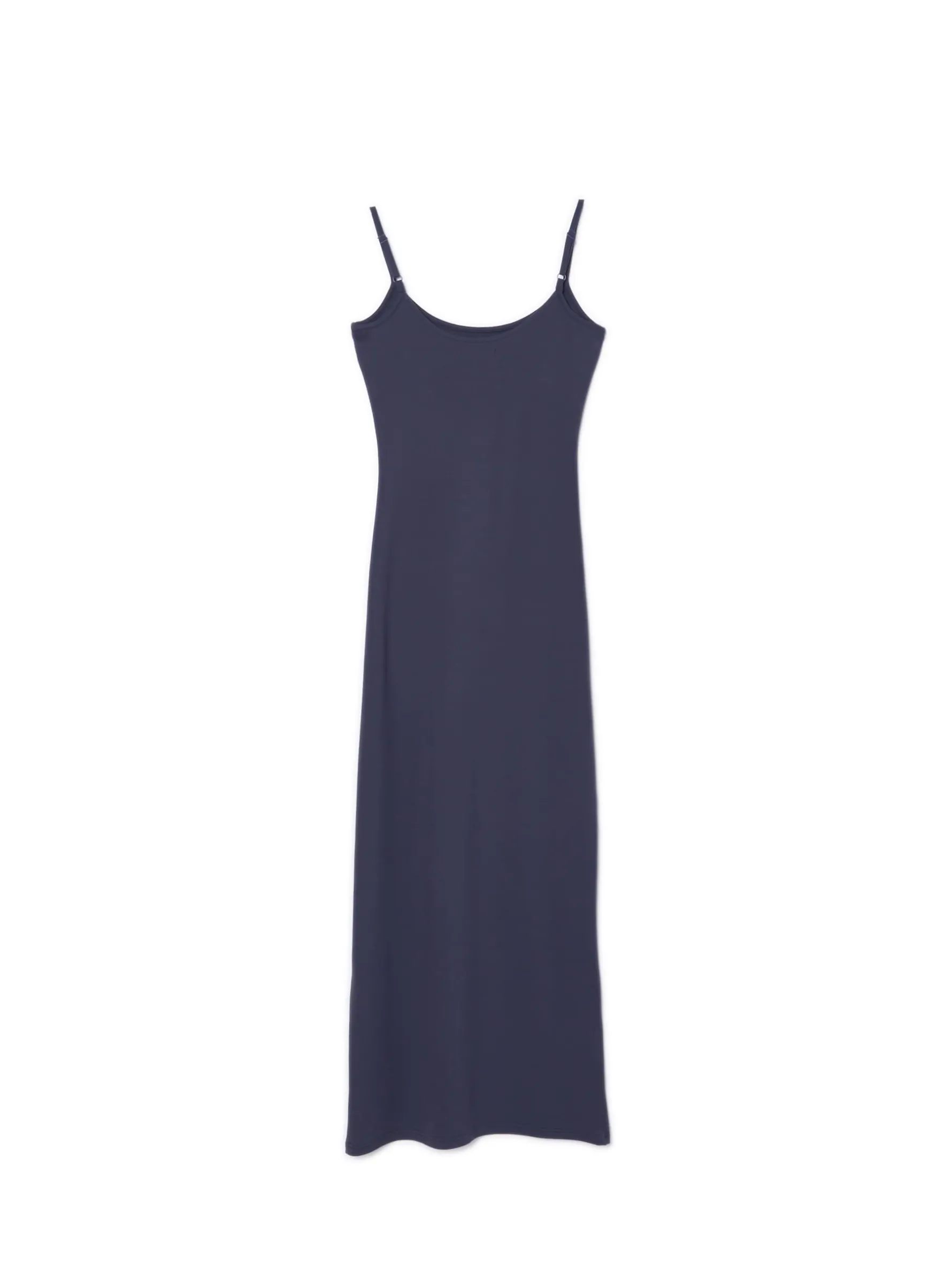 Długa sukienka, uszyta z granatowej dzianiny. dzianina z domieszką elastycznych włókien długość maxi dopasowany krój podkreślający sylwetkę okrągły dekolt wąskie ramiączka z regulacją długości