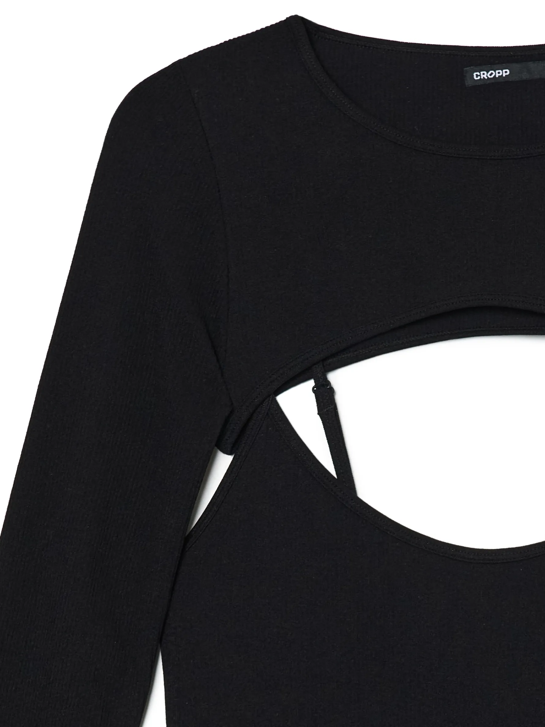 Czarna sukienka damska o długości maxi, uszyta mieszanki materiałów o gładkiej teksturze. Ten model po założeniu tworzy efektowne wycięcia na przodzie i plecach. materiał z dodatkiem elastycznych włókien długość midi i dopasowany krój głęboki dekolt wąskie ramiączka z regulacją długości długie, dopasowane rękawy rozcięcie z boku Wzrost modelki: 177 cm