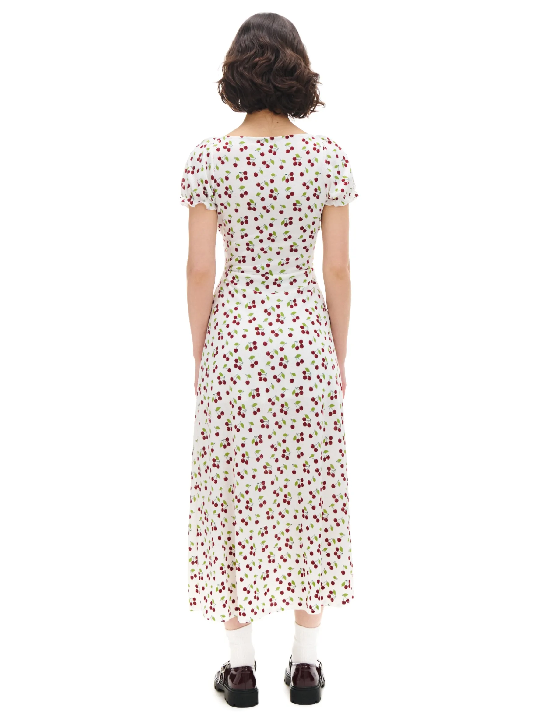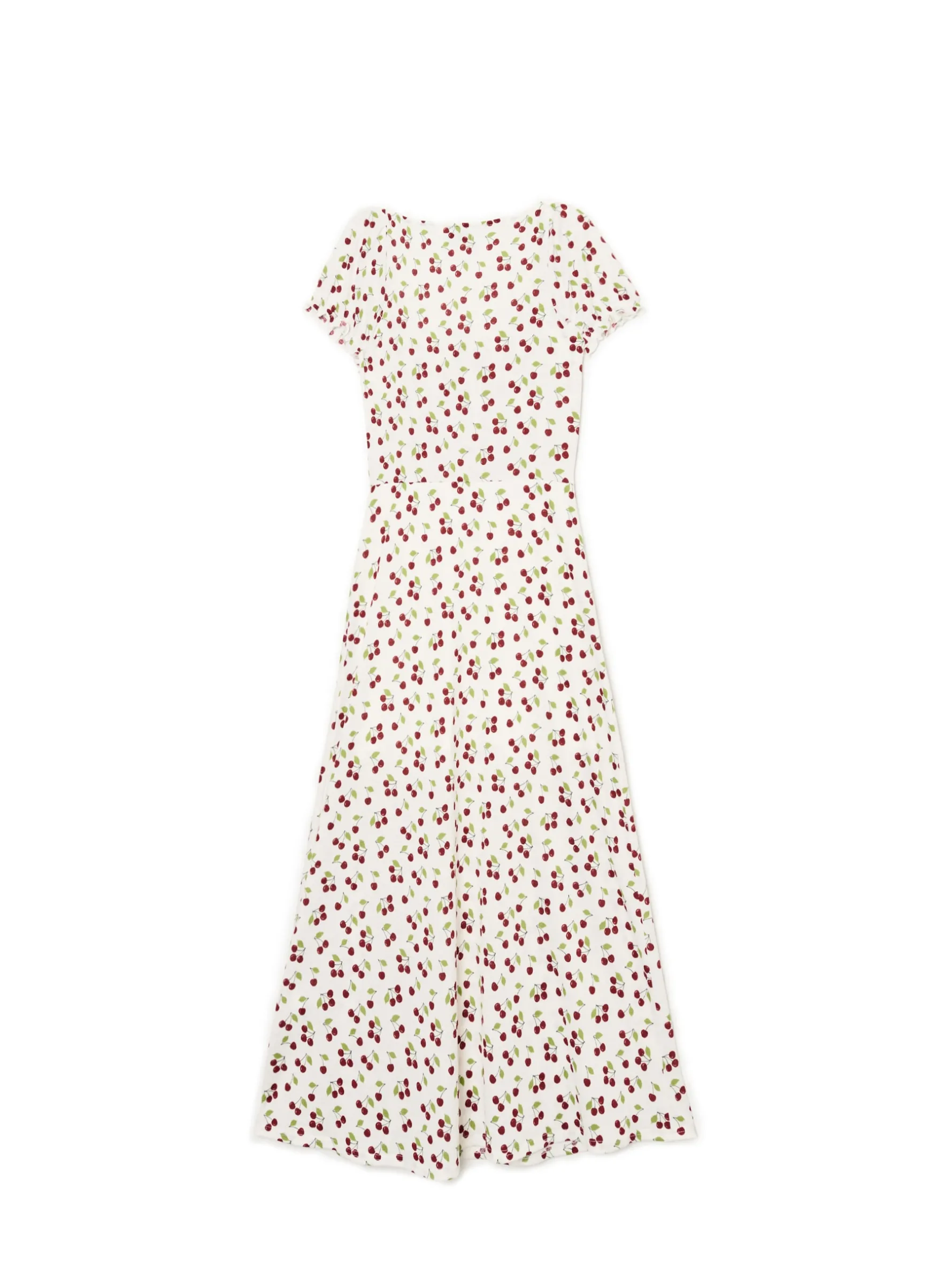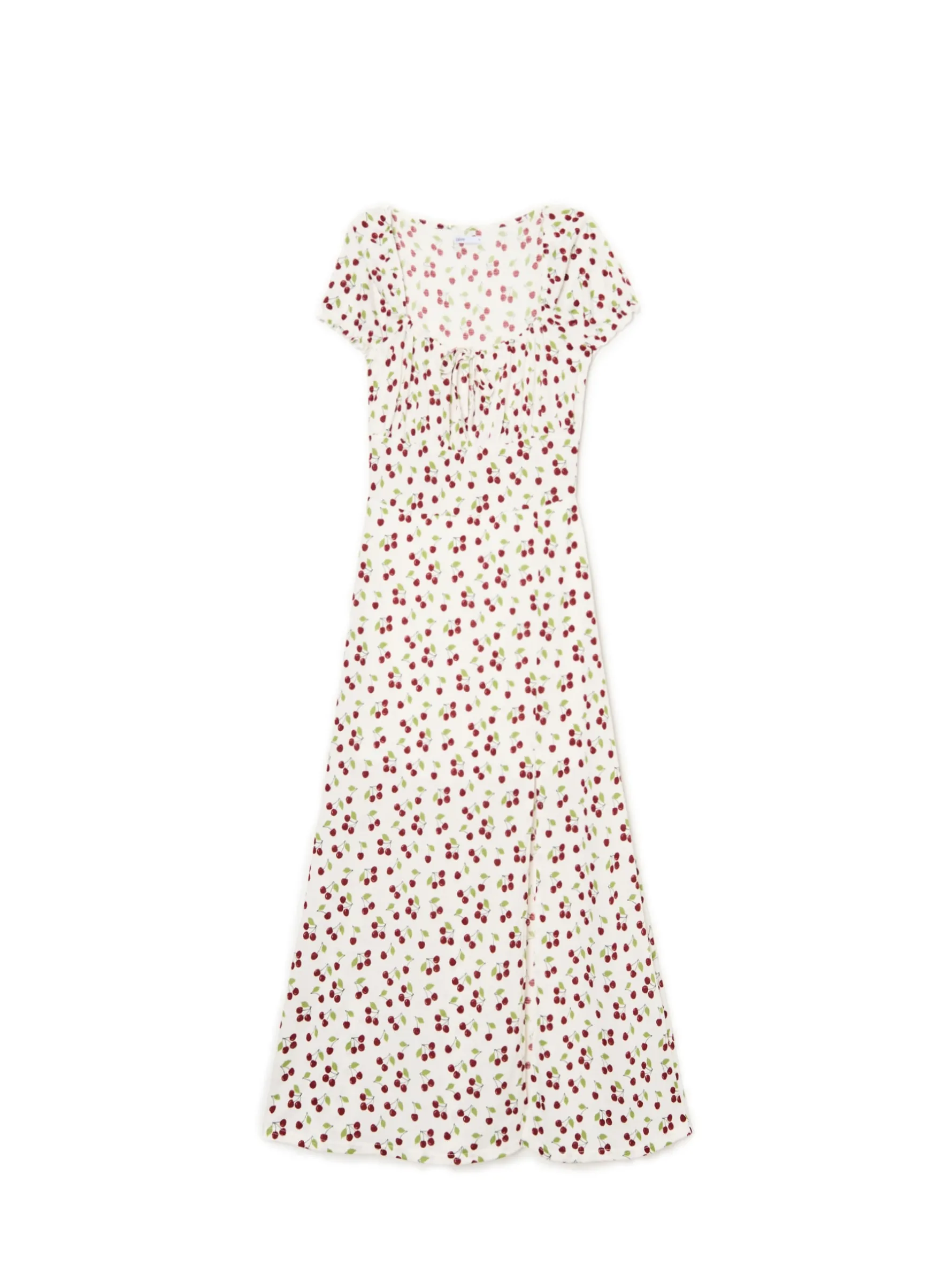 Lekka sukienka, uszyta z wzorzystej dzianiny z roślinnym motywem. Dostępne inne warianty kolorystyczne. długość midi fason typu empire – odcięcie tuż po biustem krótkie, bufiaste rękawy dekolt z rozcięciem i wiązaniem lekko rozkloszowana spódnica z rozcięciem nadruk w wiśnie na całej powierzchni Wzrost modelki: 172 cm