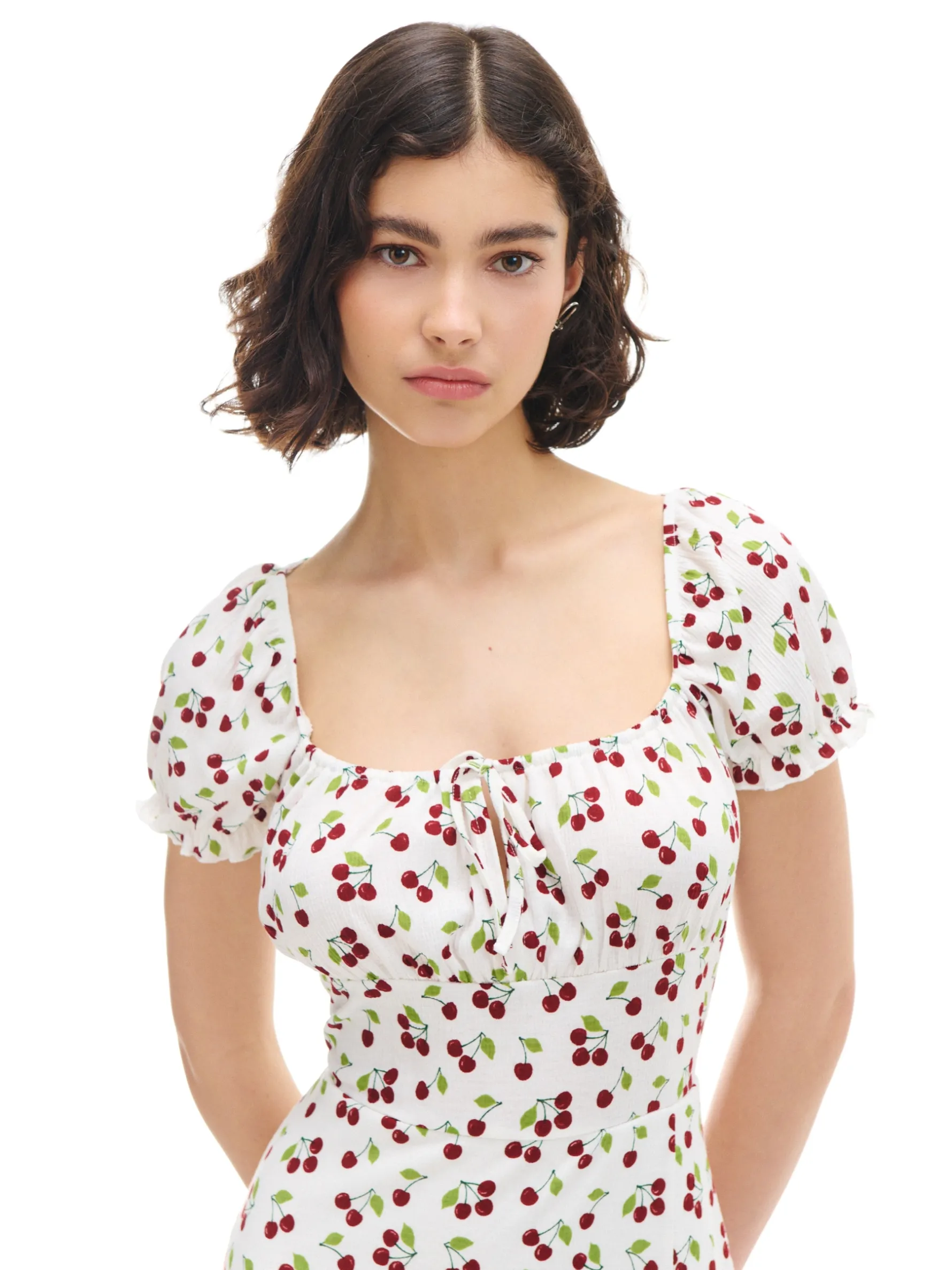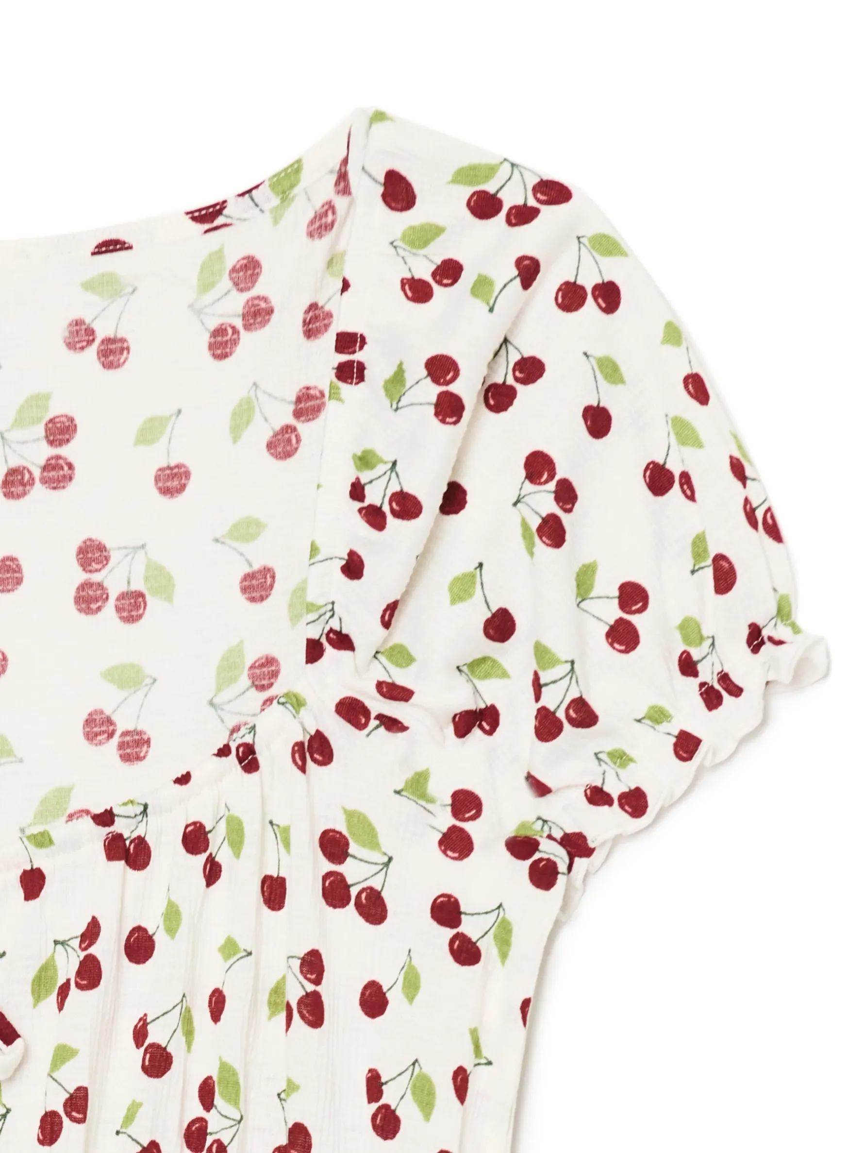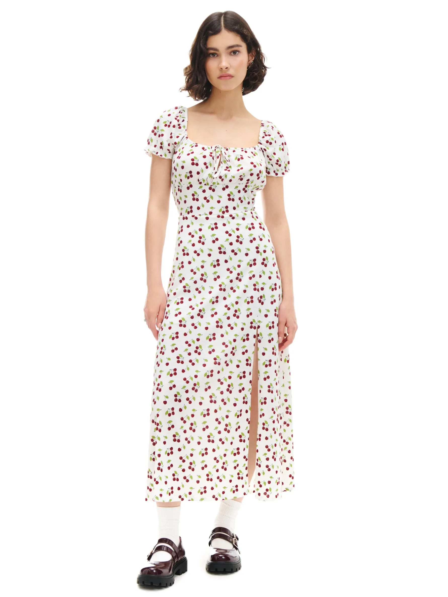 Lekka sukienka, uszyta z wzorzystej dzianiny z roślinnym motywem. Dostępne inne warianty kolorystyczne. długość midi fason typu empire – odcięcie tuż po biustem krótkie, bufiaste rękawy dekolt z rozcięciem i wiązaniem lekko rozkloszowana spódnica z rozcięciem nadruk w wiśnie na całej powierzchni Wzrost modelki: 172 cm