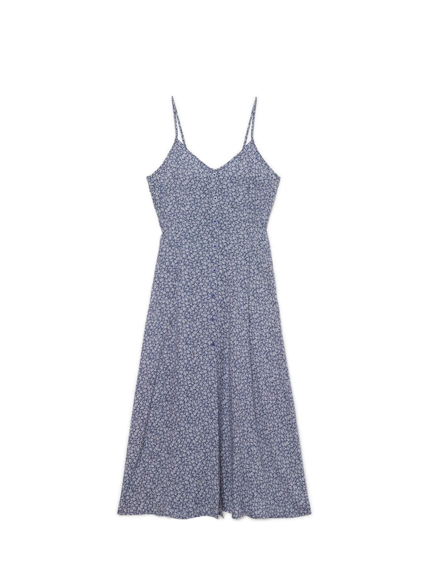 Delikatna, zwiewna sukienka o długości midi zapinana na guziki. Cienkie ramiączka i elastyczny fragment na plecach są idealnym rozwiązaniem na ciepłe dni! 100% wiskozy lekko rozkloszowany dół szeroka gumka w talii odcięcie w talii jednorzędowe zapięcie na guziki wąskie ramiączka z regulacją długości autorski, kwiatowy print na całości