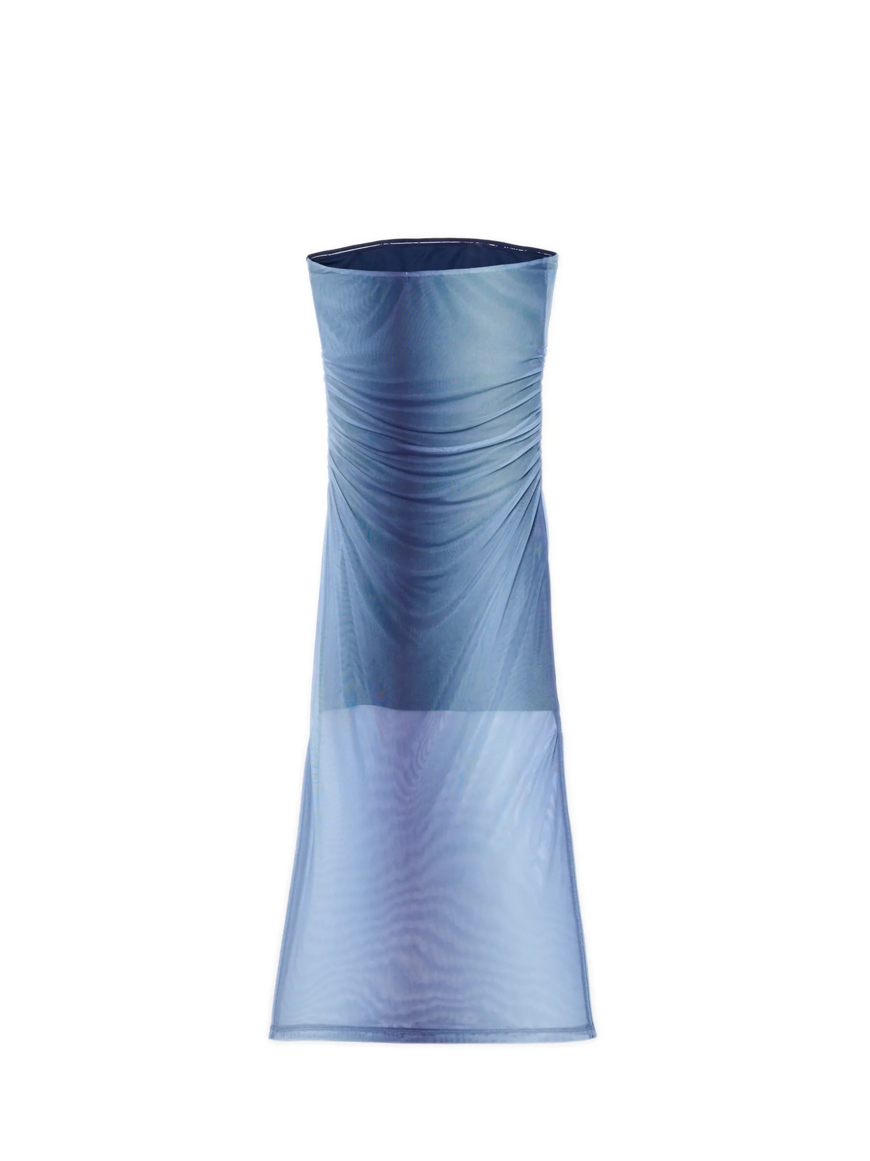 Dopasowana sukienka uszyta z lekkiego materiału w niebieskim odcieniu z dodatkiem elastycznych włókien. Symetryczne marszczenia i ten artystyczny print wyróżnią Cię w tłumie! dzianina z domieszką elastycznych włókien dopasowany krój podkreślający sylwetkę bez rękawów dekoracyjne marszczenie pod biustem wewnątrz wykończenie na podszewce nadruk all over