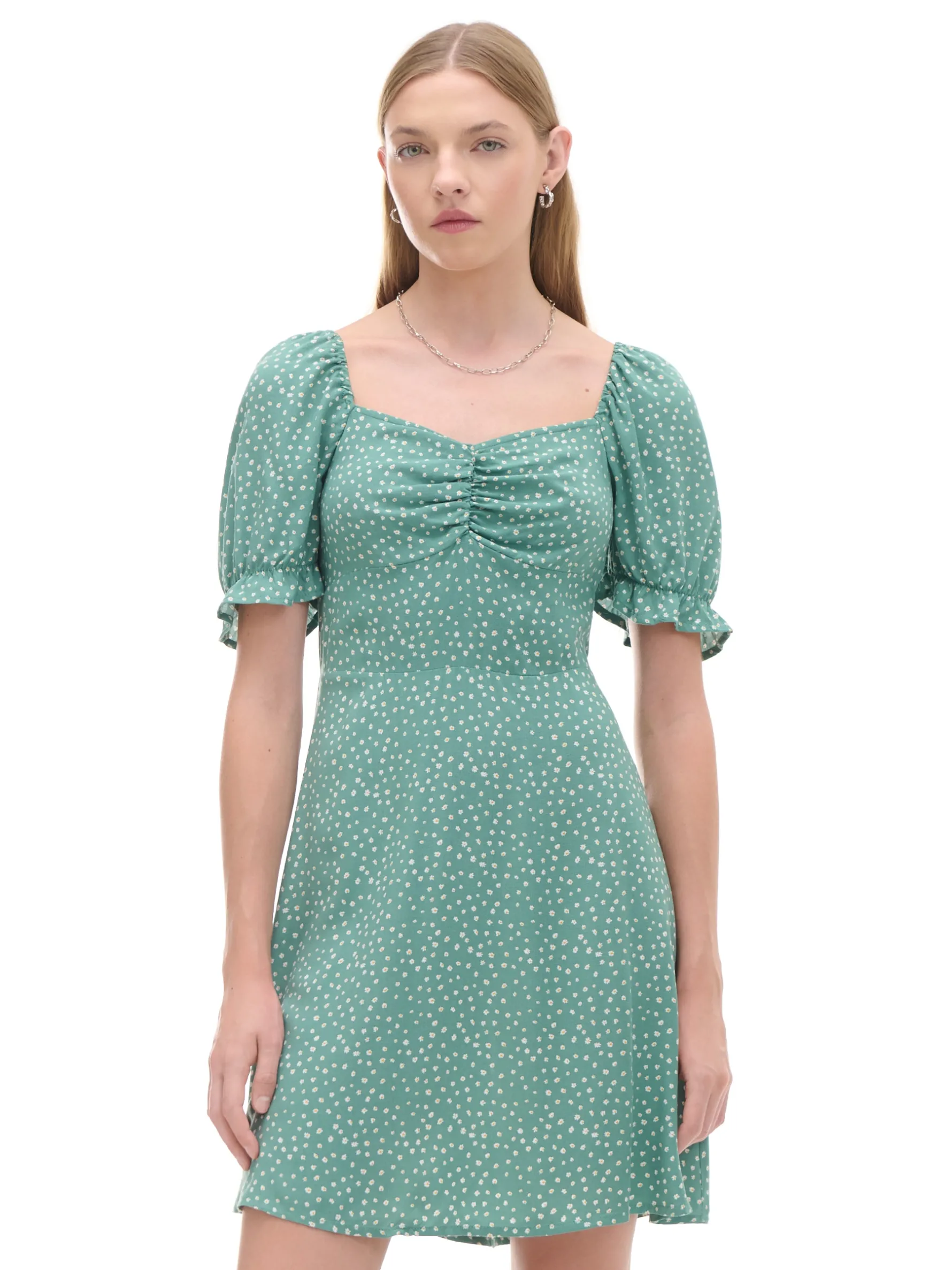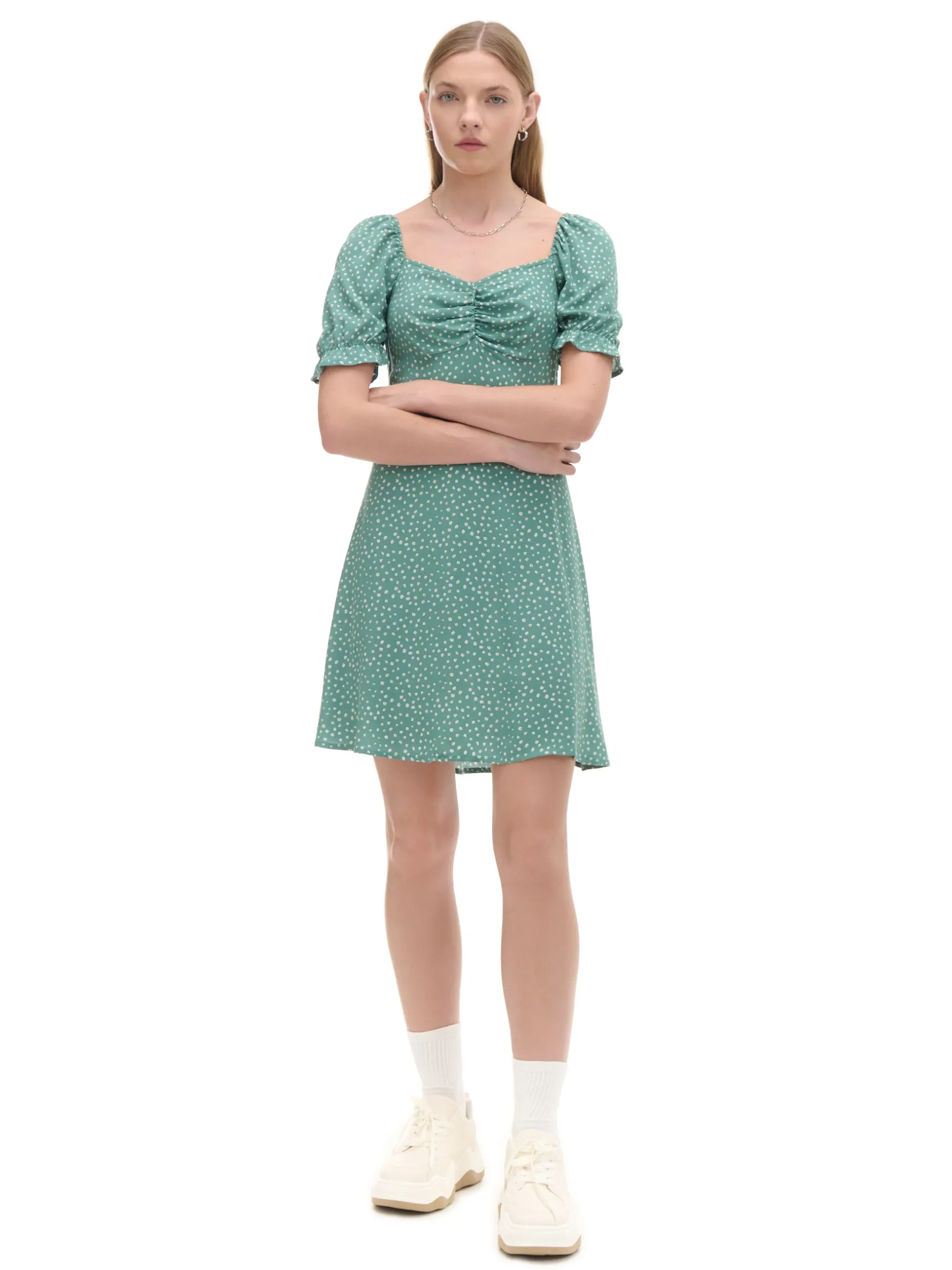 Krótka damska sukienka o swobodnym kroju, uszyta z wiskozy. Dostępna w różnych wersjach kolorystycznych. 100% wiskozy swobodny krój krótkie, bufiaste rękawy dekoracyjne marszczenie pod biustem autorski, kwiatowy print na całości zapięcie na kryty zamek z boku produkt występuje w kilku kolorach