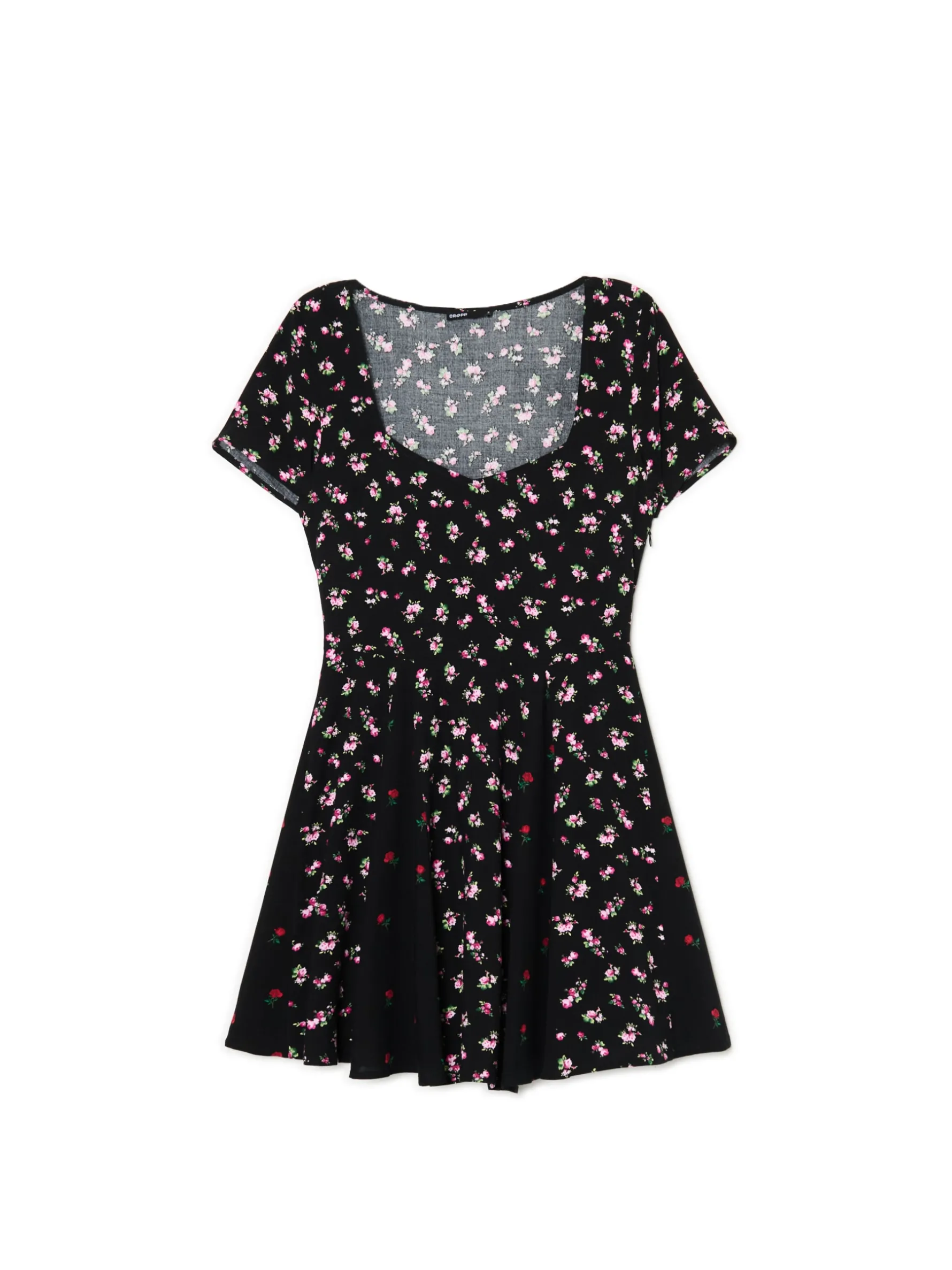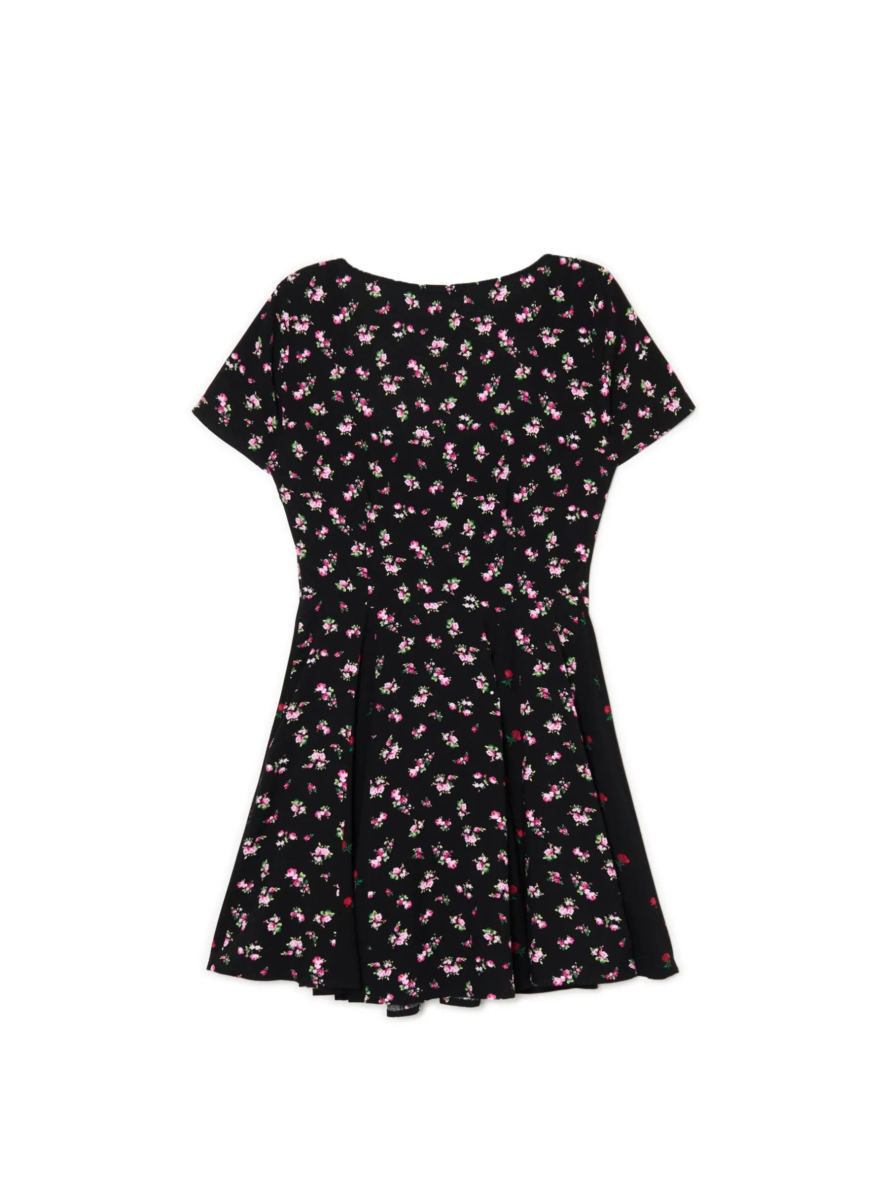 Sukienka z krótkim rękawem i odcięciem w talii, uszyta z wiskozy. Głęboki dekolt, ozdobne marszczenia i szerokie plisy dodają jej wyjątkowości. lekki materiał z wiskozą długość mini w stylu coquette odcięcie w talii plisowany, lekko rozkloszowany dół zapięcie na kryty zamek z boku krótkie, ścięte rękawy głeboki dekolt w szpic ozdobne marszczenia kwiatowy wzór Wzrost modelki: 177 cm