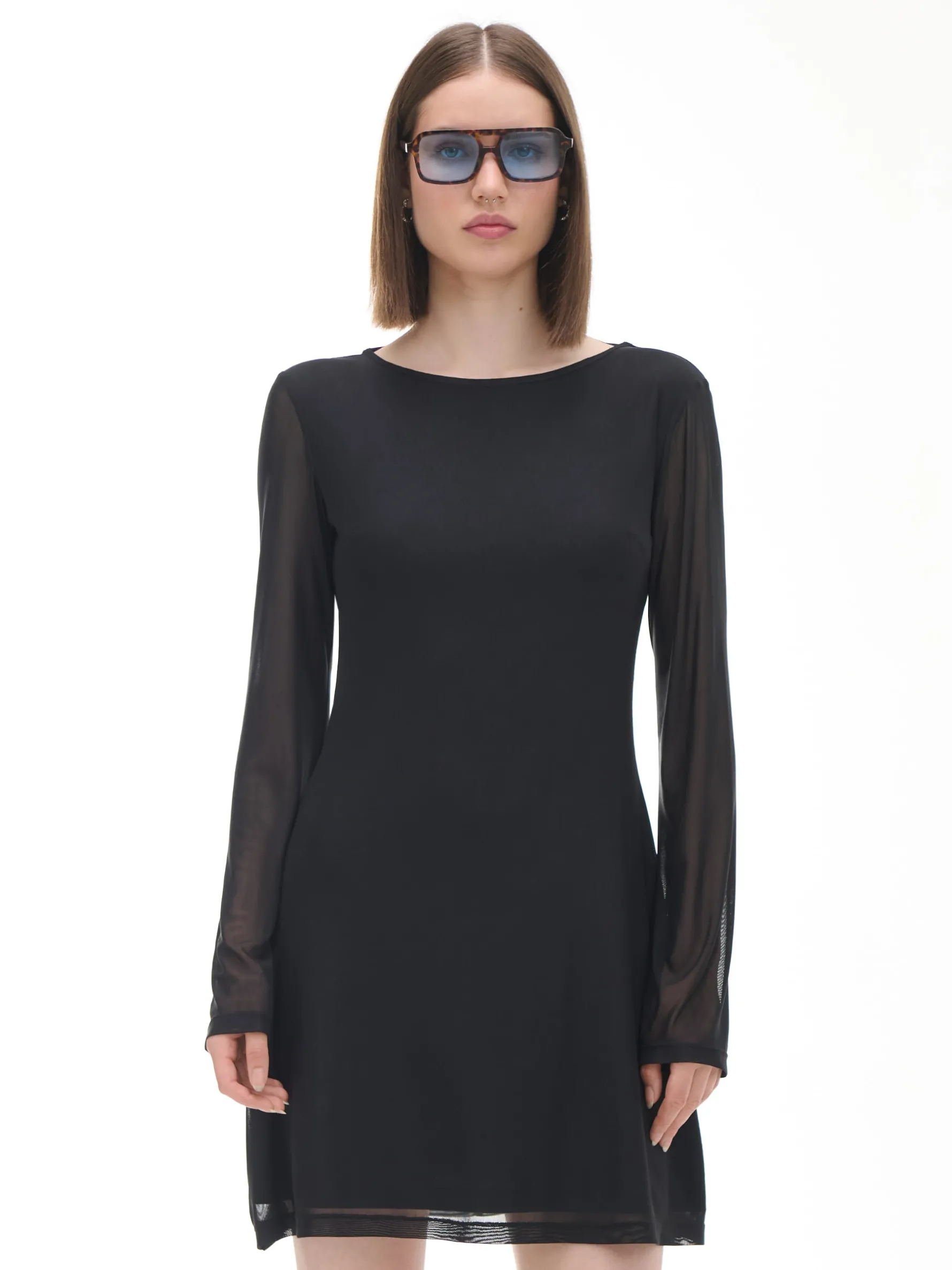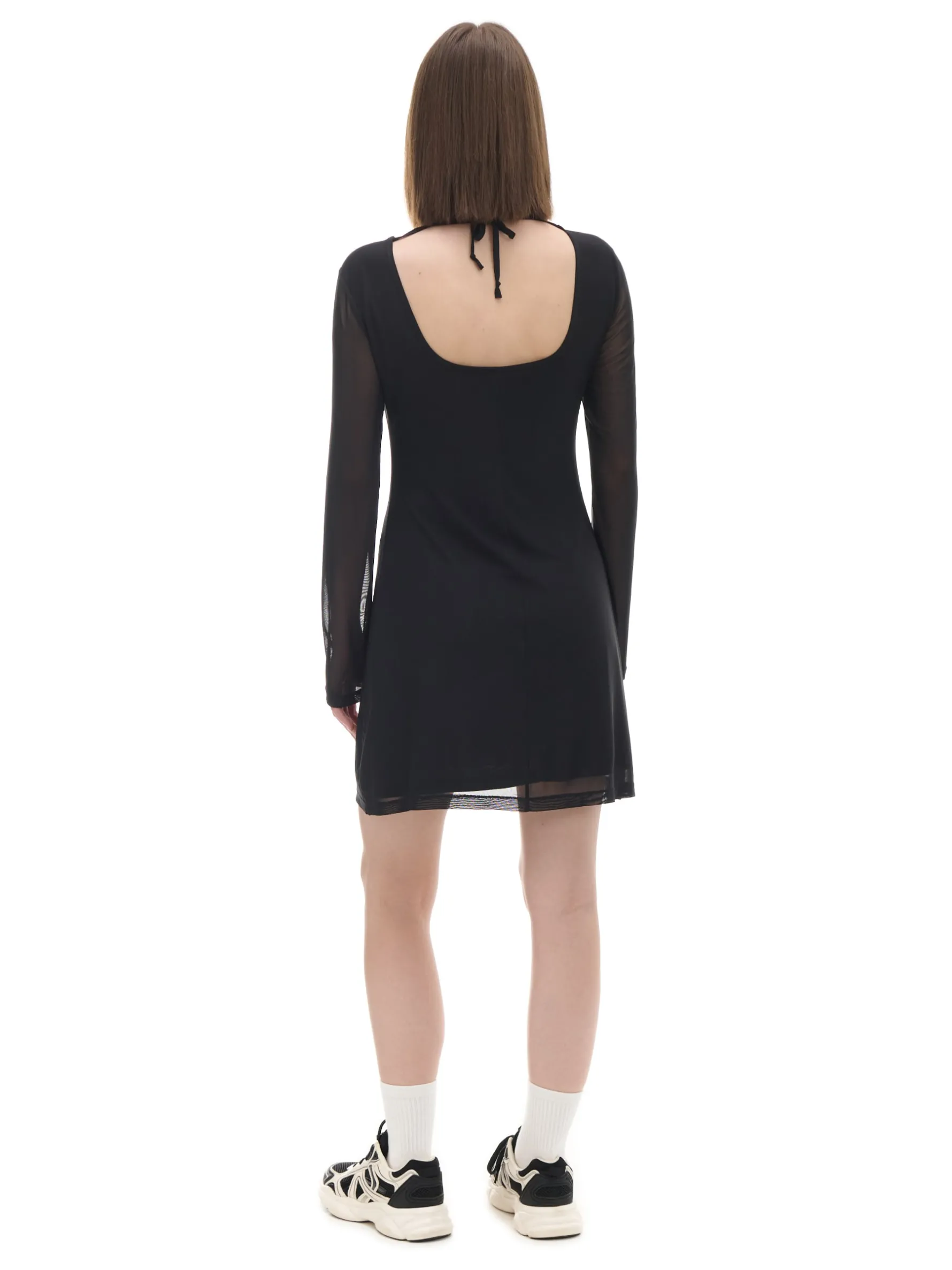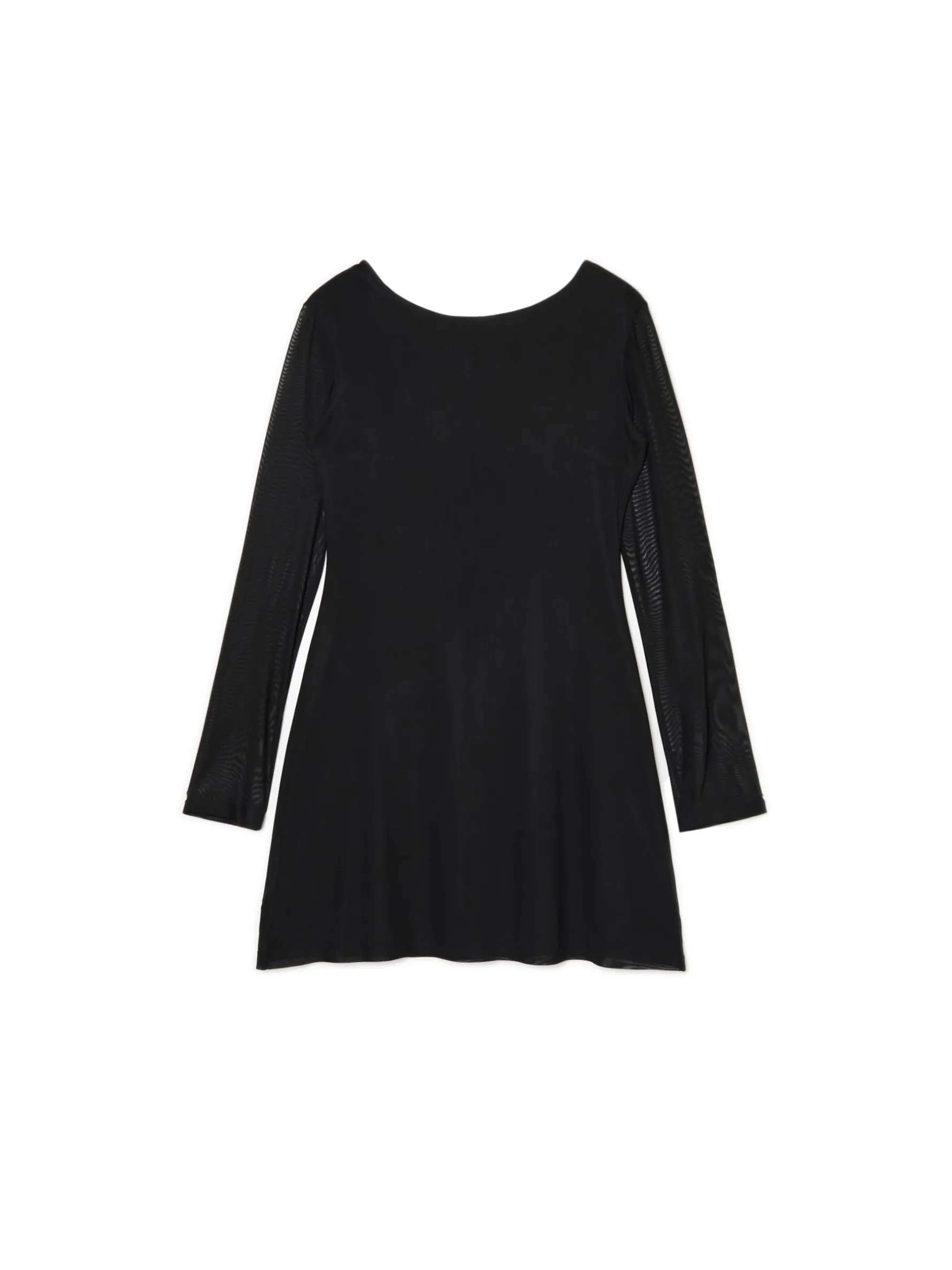 Damska sukienka o długości mini uszyta z lekkiego materiału. Wyposażona w głęboki dekolt na plecach, dekoracyjne wiązanie i ozdobne panele z siateczki mesh. Genialna na randki i nie tylko! krótka, czarna sukienka o swobodnym kroju długość mini, rozszerzany dół wewnątrz gładka podszewka lekko rozszerzane rękawy kwadratowy dekolt z tyłu ozdobne wiązanie na plecach ozdobne panele z siateczką typu mesh modelujące zakładki z przodu