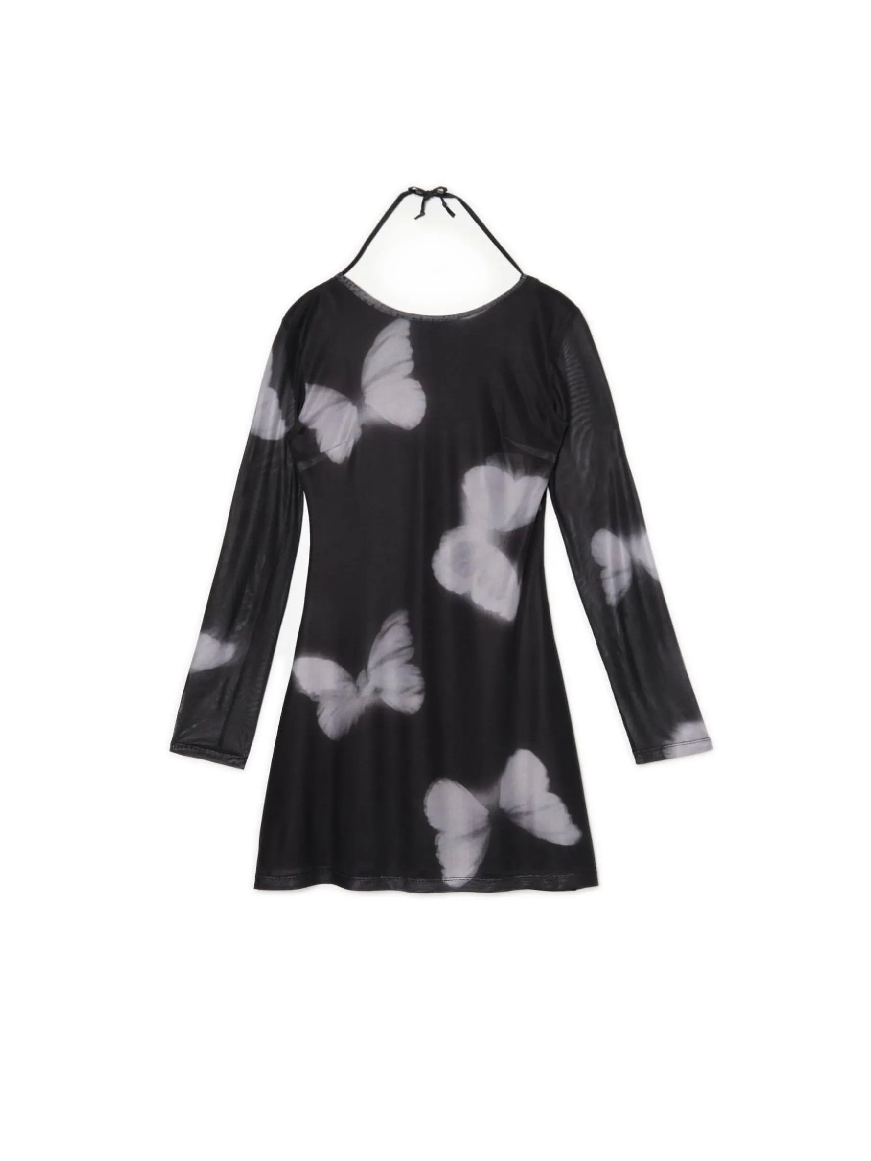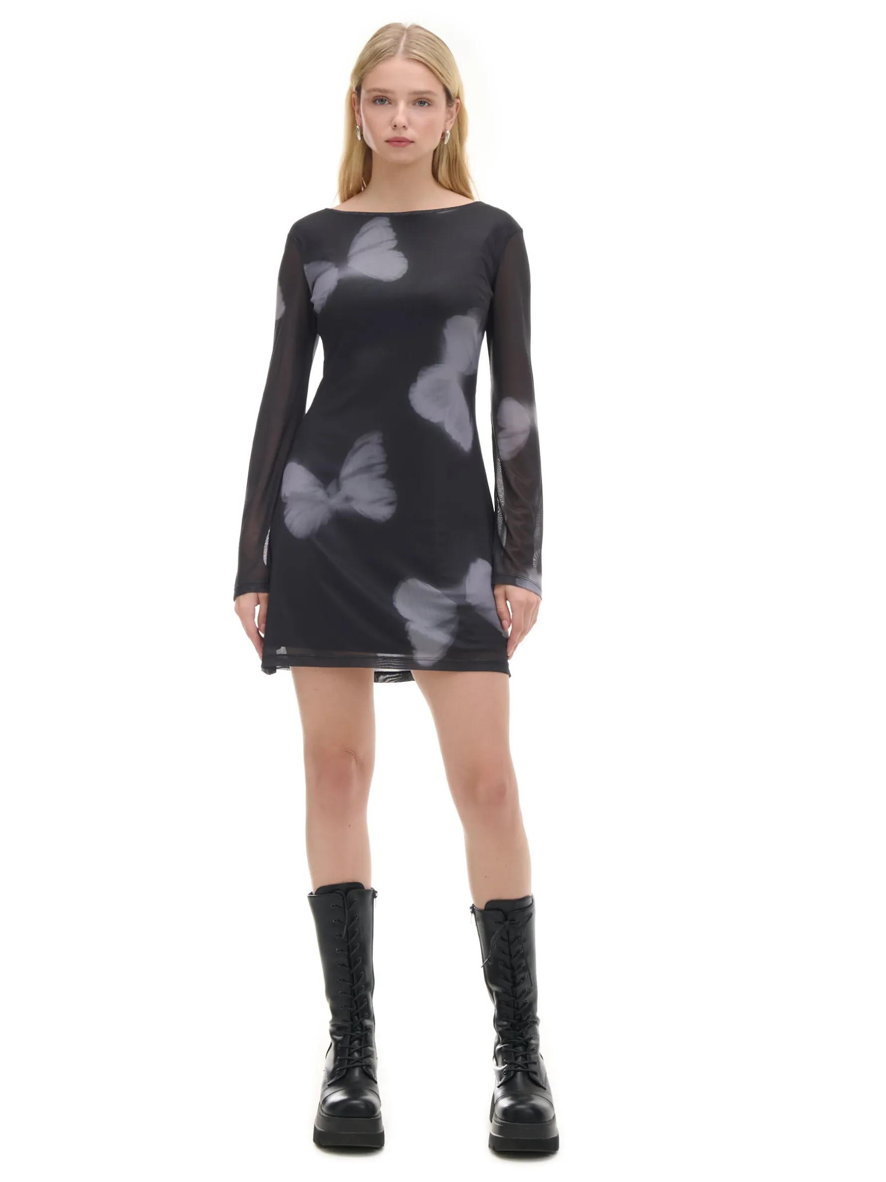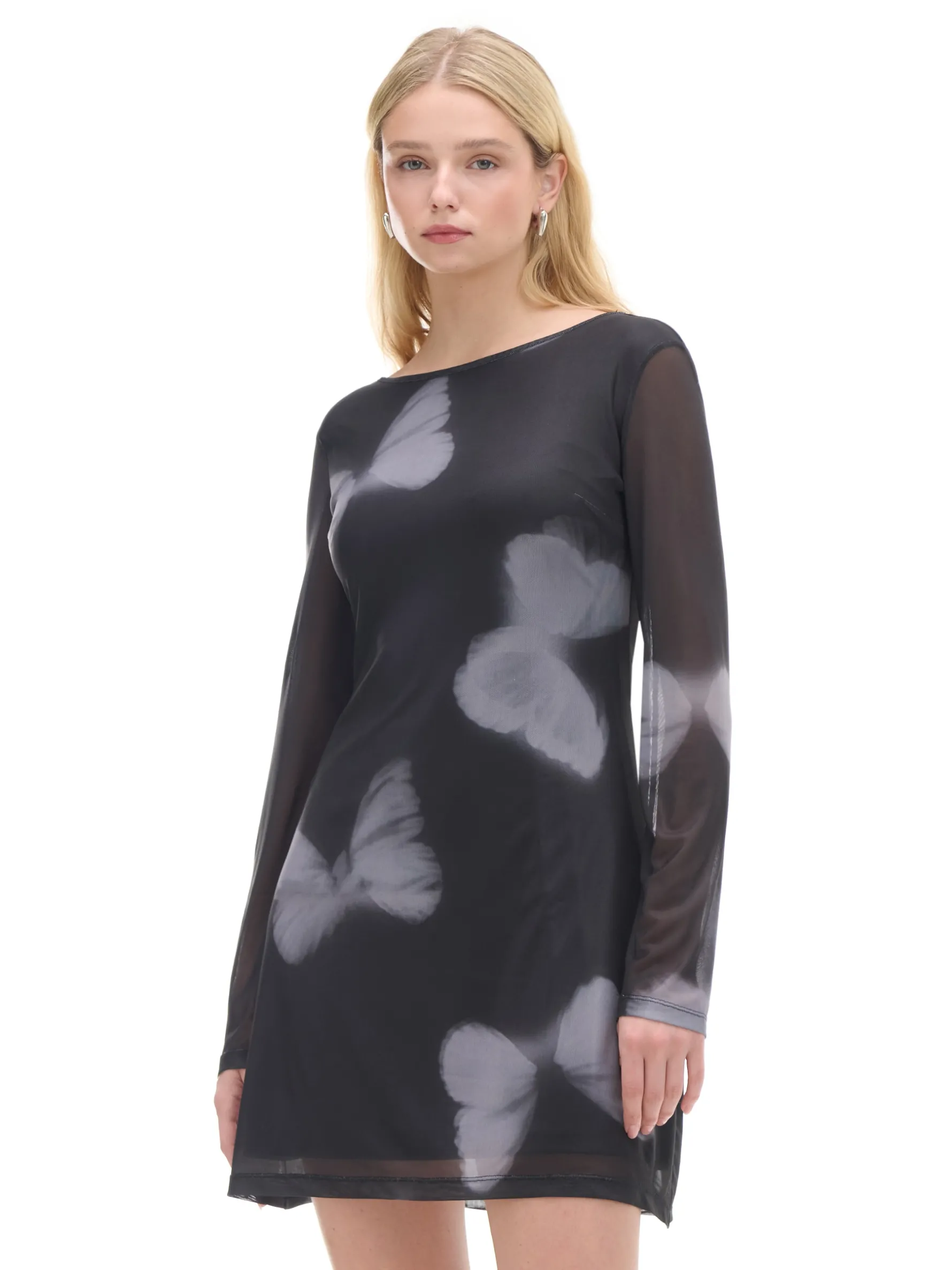 Damska sukienka o długości mini uszyta z lekkiego materiału ze wzorem w motyle. Wyposażona w głęboki dekolt na plecach, dekoracyjne wiązanie i ozdobne panele z siateczki mesh. Genialna na randki i nie tylko! krótka, czarna sukienka o swobodnym kroju długość mini, rozszerzany dół wewnątrz gładka podszewka lekko rozszerzane rękawy kwadratowy dekolt z tyłu ozdobne wiązanie na plecach ozdobne panele z siateczką typu mesh modelujące zakładki z przodu zwierzęcy print all over