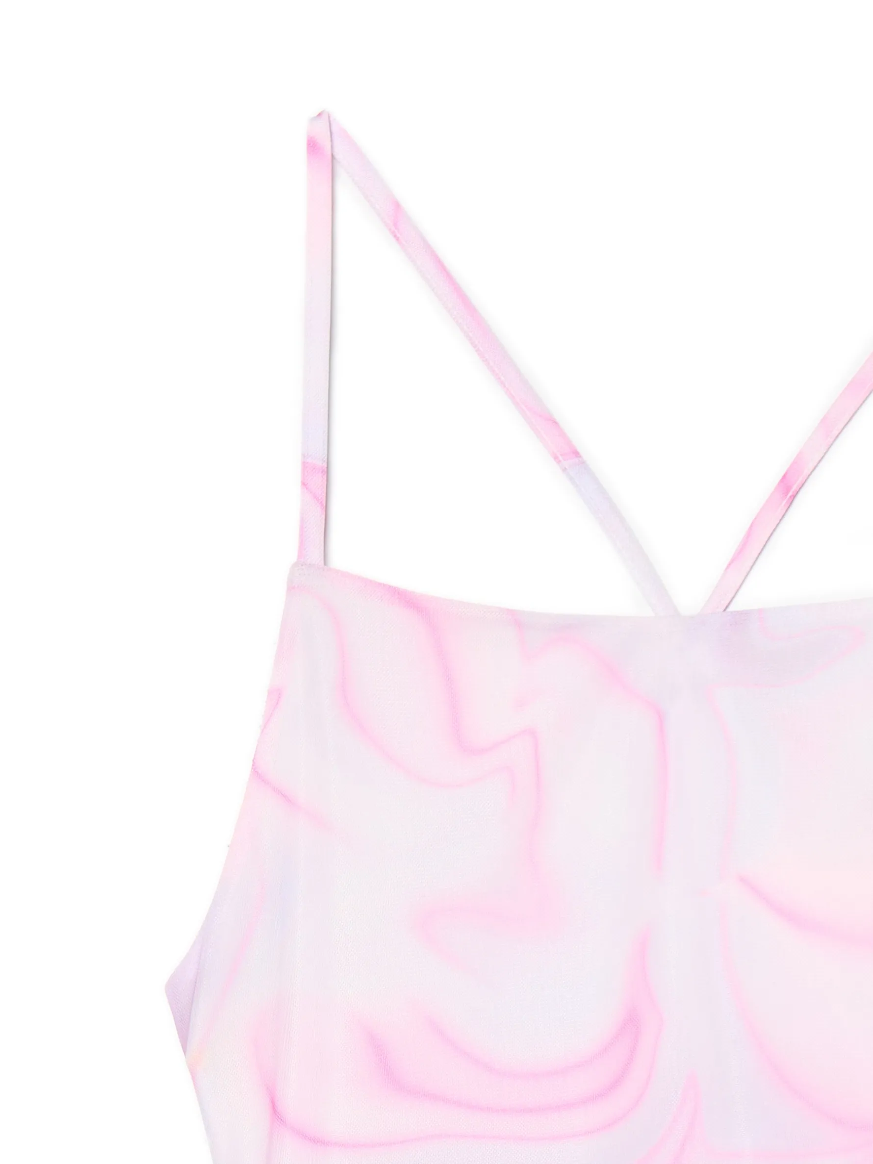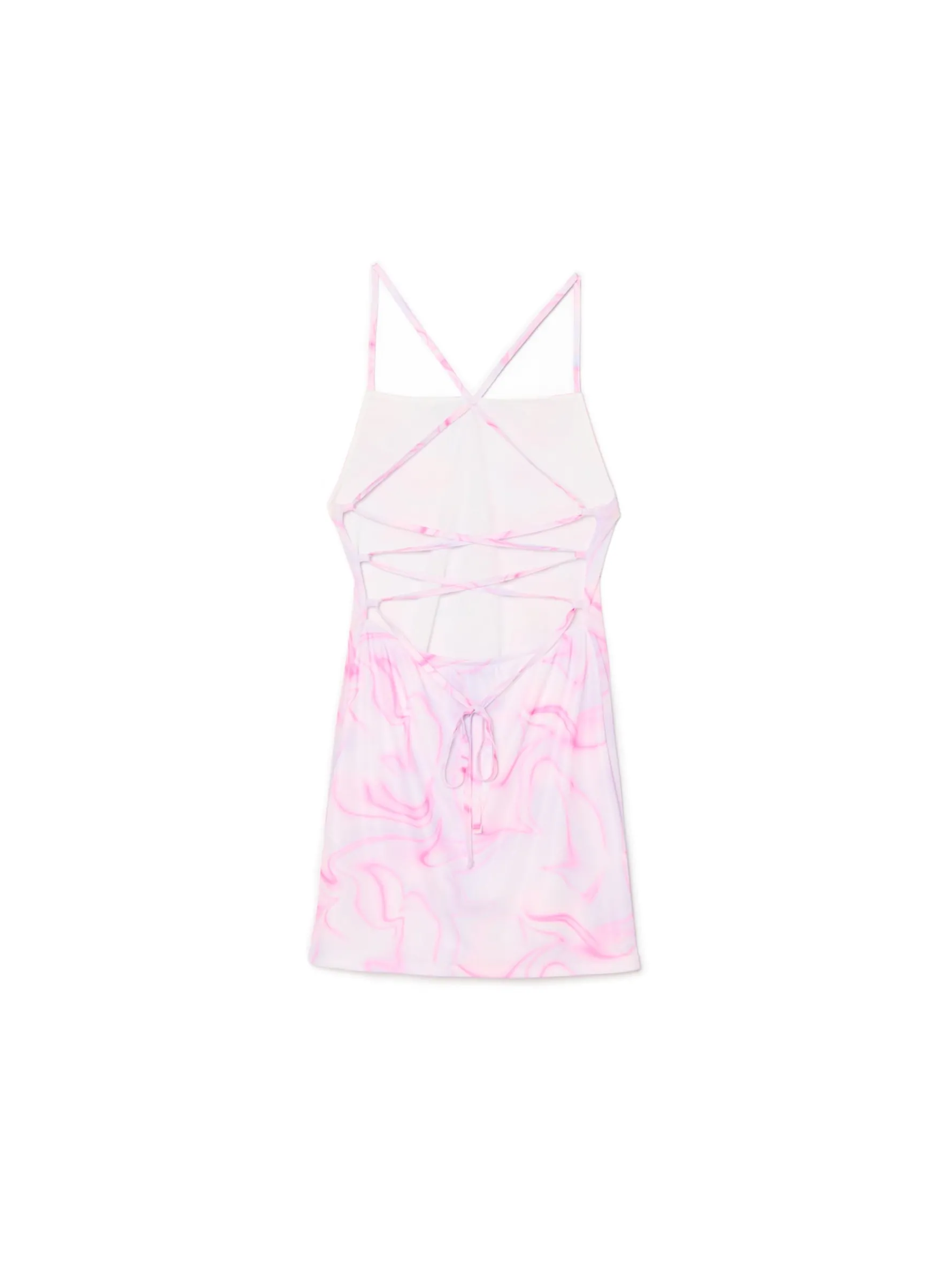 Wzorzysta sukienka mini na ramiączkach. Z tyłu ciekawe wiązanie i elastyczna gumka, która dopasuje ten model do Twojej talii. dzianina z domieszką elastycznych włókien dopasowany krój podkreślający sylwetkę kwadratowy dekolt elastyczna talia z wiązaniem cienkie, krzyżujące się na plecach ramiączka Wzrost modelki: 172 cm