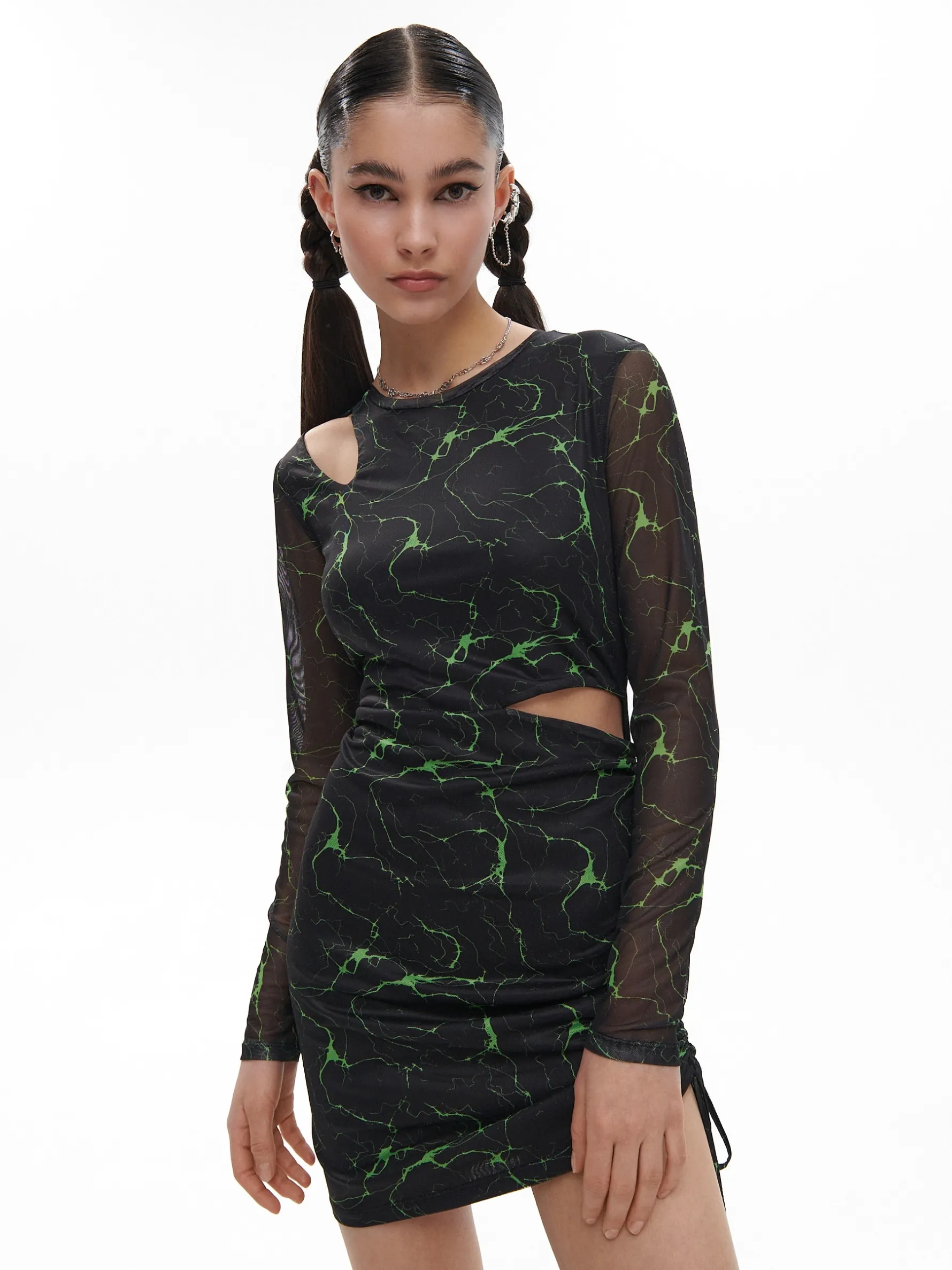 Krótka wzorzysta sukienka, uszyta z dzianiny zawierającej dodatek elastanu. dopasowany krój długie rękawy ozdobne wycięcia asymetryczny ściągacz i wiązanie na dole fantazyjny nadruk gładka podszewka Model prezentuje produkt w rozmiarze: S Wzrost modelki: 172 cm