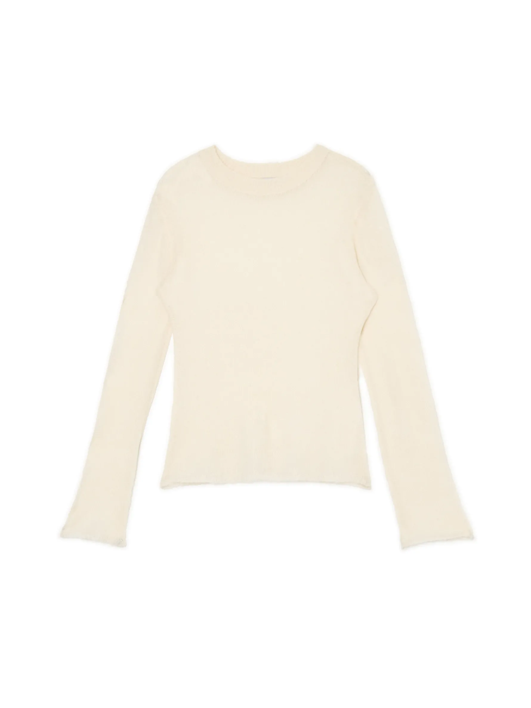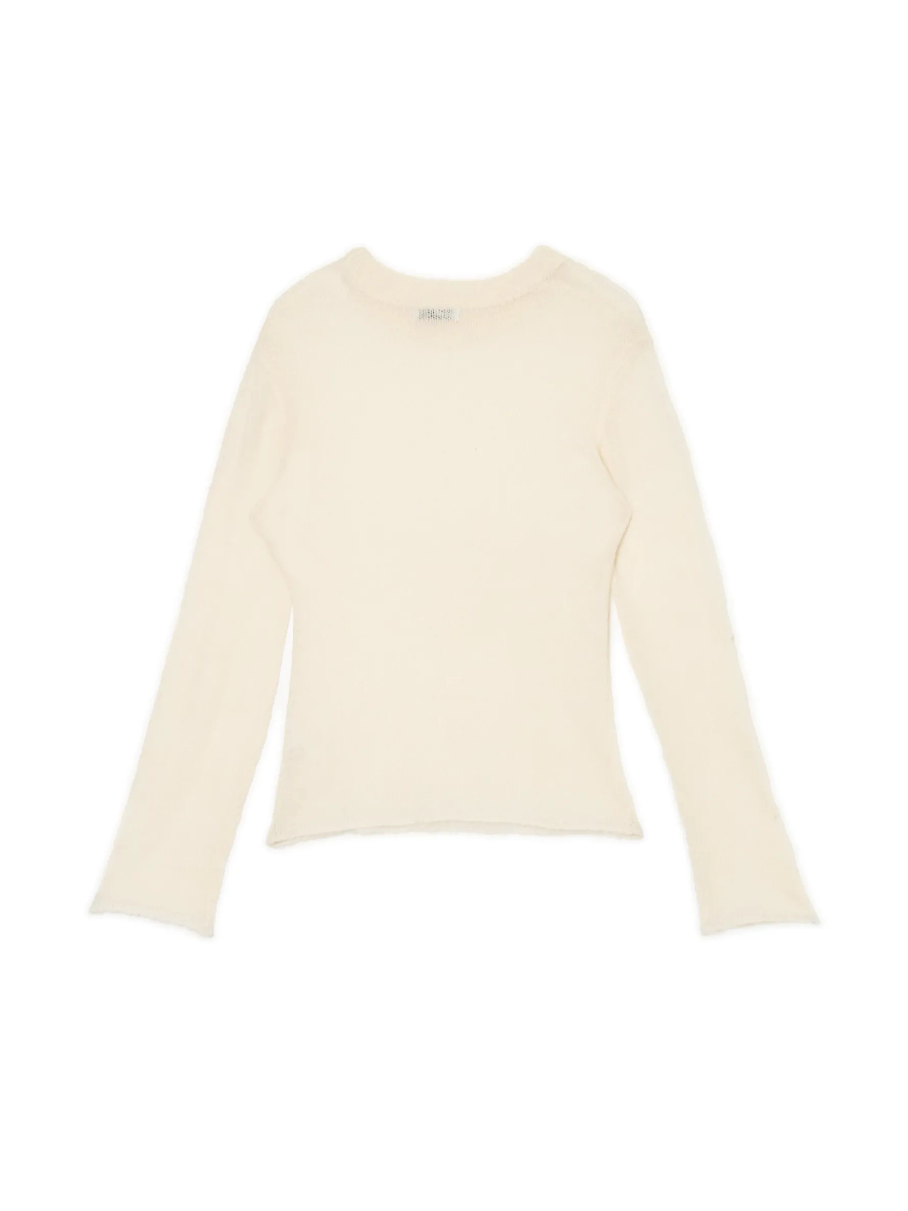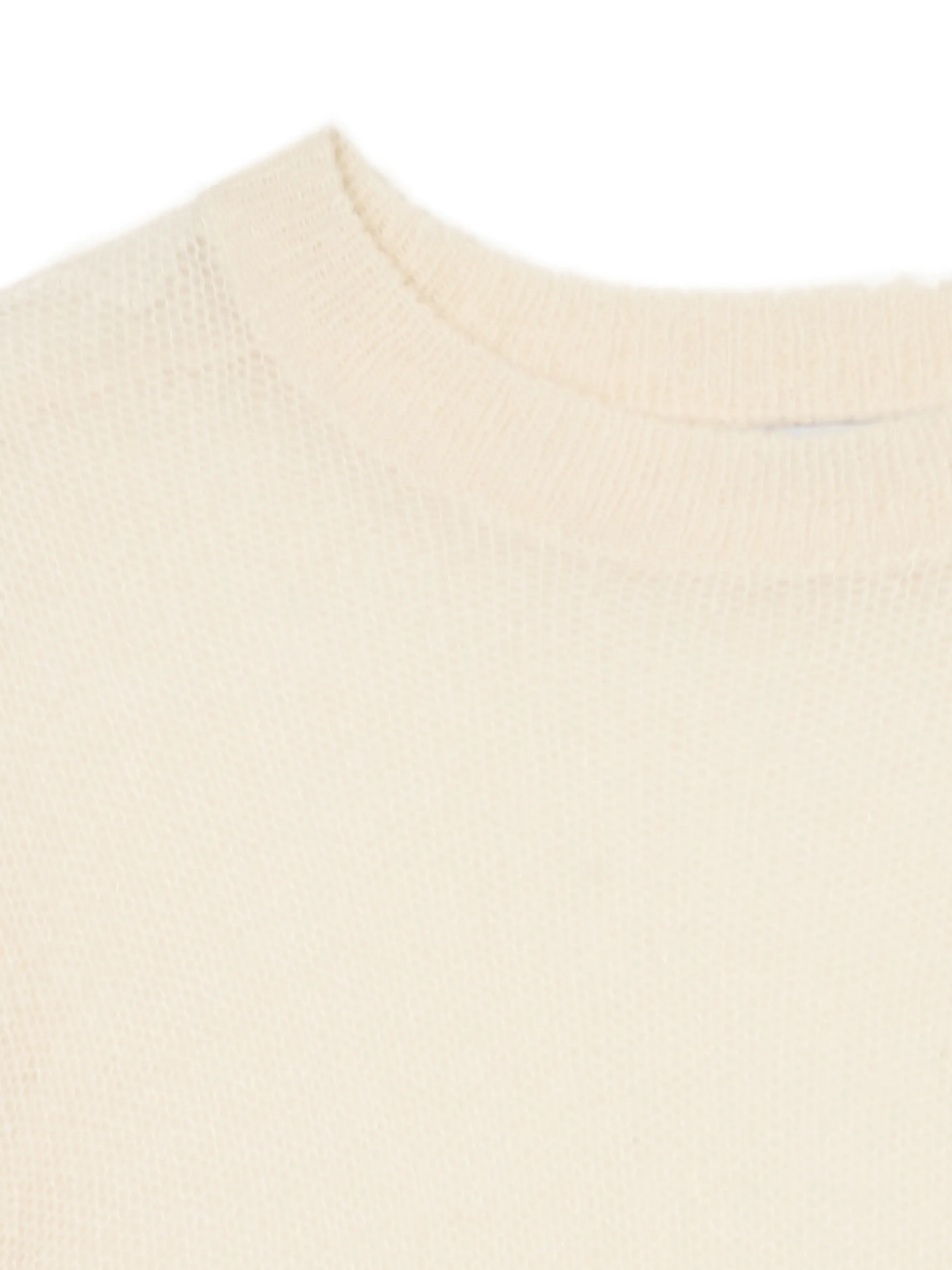 Damski sweter uszyty z półtransparentnej mieszanki dzianin w gładkim, kremowym kolorze. Idealny item, który otuli Cię w chłodne wieczory! uszyty z trwałego materiału długie, dopasowane rękawy półokrągły dekolt z lamówką surowe wykończenie brzegów Wzrost modelki: 177 cm